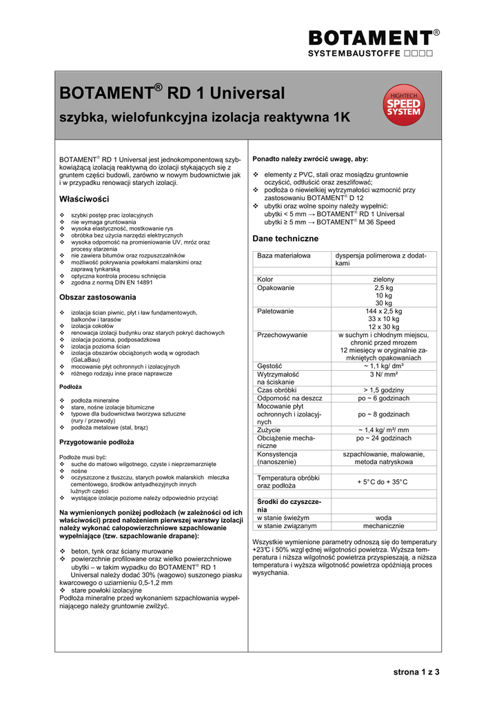 BOTAMENT® RD 1 Universal szybka, wielofunkcyjna izolacja reaktywna 1K BOTAMENT RD 1 Universal jest jednokomponentową szybkowiążącą izolacją reaktywną do izolacji stykających się z gruntem części budowli, zarówno w nowym budownictwie jak i w przypadku renowacji starych izolacji. Właściwości szybki postęp prac izolacyjnych nie wymaga gruntowania wysoka elastyczność, mostkowanie rys obróbka bez użycia narzędzi elektrycznych wysoka odporność na promieniowanie UV, mróz oraz procesy starzenia nie zawiera bitumów oraz rozpuszczalników możliwość pokrywania powłokami malarskimi oraz zaprawą tynkarską optyczna kontrola procesu schnięcia zgodna z normą DIN EN 14891 Ponadto należy zwrócić uwagę, aby: elementy z PVC, stali oraz mosiądzu gruntownie oczyścić, odtłuścić oraz zeszlifować; podłoża o niewielkiej wytrzymałości wzmocnić przy zastosowaniu BOTAMENT D 12 ubytki oraz wolne spoiny należy wypełnić: ubytki < 5 mm → BOTAMENT RD 1 Universal ubytki ≥ 5 mm → BOTAMENT M 36 Speed Dane techniczne Baza materiałowa Kolor Opakowanie Obszar zastosowania izolacja ścian piwnic, płyt i ław fundamentowych, balkonów i tarasów izolacja cokołów renowacja izolacji budynku oraz starych pokryć dachowych izolacja pozioma, podposadzkowa izolacja pozioma ścian izolacja obszarów obciążonych wodą w ogrodach (GaLaBau) mocowanie płyt ochronnych i izolacyjnych różnego rodzaju inne prace naprawcze Podłoża podłoża mineralne stare, nośne izolacje bitumiczne typowe dla budownictwa tworzywa sztuczne (rury / przewody) podłoża metalowe (stal, brąz) Przygotowanie podłoża Podłoże musi być: suche do matowo wilgotnego, czyste i nieprzemarznięte nośne oczyszczone z tłuszczu, starych powłok malarskich mleczka cementowego, środków antyadhezyjnych innych luźnych części wystające izolacje poziome należy odpowiednio przyciąć Na wymienionych poniżej podłożach (w zależności od ich właściwości) przed nałożeniem pierwszej warstwy izolacji należy wykonać całopowierzchniowe szpachlowanie wypełniające (tzw. szpachlowanie drapane): beton, tynk oraz ściany murowane powierzchnie profilowane oraz wielko powierzchniowe ubytki – w takim wypadku do BOTAMENT RD 1 Universal należy dodać 30% (wagowo) suszonego piasku kwarcowego o uziarnieniu 0,5-1,2 mm stare powłoki izolacyjne Podłoża mineralne przed wykonaniem szpachlowania wypełniającego należy gruntownie zwilżyć. Paletowanie Przechowywanie Gęstość Wytrzymałość na ściskanie Czas obróbki Odporność na deszcz Mocowanie płyt ochronnych i izolacyjnych Zużycie Obciążenie mechaniczne Konsystencja (nanoszenie) Temperatura obróbki oraz podłoża Środki do czyszczenia w stanie świeżym w stanie związanym dyspersja polimerowa z dodatkami zielony 2,5 kg 10 kg 30 kg 144 x 2,5 kg 33 x 10 kg 12 x 30 kg w suchym i chłodnym miejscu, chronić przed mrozem 12 miesięcy w oryginalnie zamkniętych opakowaniach ~ 1,1 kg/ dm³ 3 N/ mm² > 1,5 godziny po ~ 6 godzinach po ~ 8 godzinach ~ 1,4 kg/ m²/ mm po ~ 24 godzinach szpachlowanie, malowanie, metoda natryskowa + 5° C do + 35° C woda mechanicznie Wszystkie wymienione parametry odnoszą się do temperatury +23°C i 50% wzgl ędnej wilgotności powietrza. Wyższa temperatura i niższa wilgotność powietrza przyspieszają, a niższa temperatura i wyższa wilgotność powietrza opóźniają proces wysychania. strona 1 z 3 BOTAMENT® RD 1 Universal szybka, wielofunkcyjna izolacja reaktywna 1K Obróbka BOTAMENT RD 1 Universal 1 nanosi się w minimum dwóch warstwach pędzlem, pacą lub metodą natryskową. Przed nałożeniem pierwszej warstwy należy wykonać szpachlowanie drapane. Wtapianie siatki z włókna szklanego w przypadku BOTAMENT RD 1 Universal nie jest wymagane. W celu uszczelniania szczelin i spoin dylatacyjnych, narożników, przejść instalacyjnych oraz odpływów posadzkowych w pierwszą warstwę izolacji należy wtopić taśmę uszczelniającą BOTAMENT® SB 78 (w przypadku dylatacji stosujemy taśmy B 180 lub B 240). Taśmę należy przeszpachlować podczas wykonywania drugiej warstwy izolacji. Miejsca te należy dodatkowo wygładzić przy użyciu pędzla. Proces schnięcia BOTAMENT RD 1 Universal można uznać za zakończony, gdy kolor materiału w stanie świeżym (jasnozielony) zmieni się w ciemnozielony. Przy pierwszym stosowaniu BOTAMENT RD 1 Universal metodą natryskową zalecamy kontakt z technikiem zastosowań. Istotne wskazówki Podczas wykonywania izolacji przyziemnych części budynków należy przestrzegać stosownych wytycznych, np. wytycznych ITB 408/2010: Warunki Techniczne Wykonania i Odbioru Robót Budowlanych – część C: Zabezpieczenia i izolacje – zeszyt 5: Izolacje przeciwwilgociowe i wodochronne części podziemnych budynków. BOTAMENT® RD 1 Universal nie należy obrabiać przy bezpośrednim silnym obciążeniu promieniowaniem słonecznym izolowanej powierzchni. W przypadku przerw roboczych grubość warstwy BOTAMENT RD 1 Universal 1 należy zmniejszyć stopniowo do zera. Po wznowieniu prac cieńsza warstwa musi być pokryta nową warstwą izolacji. Pracy nie należy przerywać przy izolacji krawędzi i narożników. Do zasypywania wykopu można przystąpić po całkowitym wyschnięciu BOTAMENT® RD 1 Universal. Do ochrony izolacji zalecamy zastosowanie płyty ochronnej i drenażowej BOTAMENT® DS 993. BOTAMENT® RD 1 Universal nie należy nanosić bezpośrednio na elementy ze stali nieżelaznej. BOTAMENT® RD 1 Universal można stosować jako izolację podpłytkową z wszystkimi klejami BOTAMENT® zgodnie z DIN EN 14891. Aby uzyskać długotrwałą ochronę przeciw tzw. negatywnemu ciśnieniu wody należy zastosować zaprawę uszczelniającą BOTAMENT® M 34 lub BOTAMENT® MS 30. Karta bezpieczeństwa produktu dostępna jest na stronie internetowej www.botament.com. Uwaga: Wszelkie informacje zawarte w niniejszej karcie oparte są na naszym doświadczeniu i najlepszej wiedzy, jednakże ni