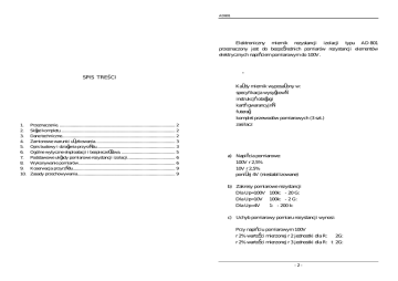 AD801 1. Przeznaczenie. Elektroniczny miernik rezystancji izolacji typu AD 801 przeznaczony jest do bezpośrednich pomiarów rezystancji elementów elektrycznych napięciem pomiarowym do 100V. SPIS TREŚCI 2. Skł ad kompletu. − − − − − 1. 2. 3. 4. 5. 6. 7. 8. 9. 10. Przeznaczenie. ................................................................................................. 2 Skład kompletu. ............................................................................................... 2 Dane techniczne............................................................................................... 2 Zamionowe warunki użytkowania. .................................................................. 3 Opis budowy i działania przyrządu.................................................................. 3 Ogólne wytyczne elsploatacji i bezpieczeństwa. ............................................. 5 Podstawowe układy pomiarowe rezystancji izolacji........................................ 6 Wykonywanie pomiarów. ................................................................................ 6 Koserwacja przyrządu...................................................................................... 9 Zasady przechowywania.................................................................................. 9 − 3. Każdy miernik wyposażony w: specyfikacja wysyłkową instrukcję obsługi kartę gwarancyjną futerał komplet przewodów pomiarowych (3 szt.) zasilacz Dane techniczne. a) Napięcia pomiarowe: 100V ± 2,5% 10V ± 2,5% poniżej 4V (niestabilizowane) b) Zakresy pomiarowe rezystancji Dla Up=100V 100kΩ - 20 GΩ Dla Up=10V 100kΩ - 2 GΩ Dla Up=4V 1Ω - 200 kΩ c) Uchyb pomiarowy pomiaru rezystancji wynosi: Przy napięciu pomiarowym 100V ± 2% wartości mierzonej ± 2 jednostki dla RΩ < 2GΩ ± 2% wartości mierzonej ± 3 jednostki dla RΩ ≥ 2GΩ -2- AD801 Przy napięciu pomiarowym 10V ± 2% wartości mierzonej ± 3 jednostki dla R∈ [100kΩ - 2GΩ ] d) Wskazania wyniku pomiaru: wyświetlacz LCD 3½ cyfry AD801 przetwornika uniezależnia całkowicie wynik pomiaru Rx od niestabilności bądź niedokładności ustawienia tego napięcia. HI Rx E Up e) Zasilanie: zasilacz zewnętrzny LO BLOK WEJŚCIOWY Rn BLOK ZMIANY PODZAKRESÓW PRZETWORNIK U1 A/C U2 U2’ WYŚWIETLACZ LCD +U f) Wymiary miernika (bez futerału) 150 x 130 x 50 mm UKŁAD WYTWARZANIA NAP. 10V g) Masa przyrządu (z futerałem i przewodami) 0,8 kg BLOK AUTOMATYKI I STEROWANIA UKŁAD WYTWARZANIA NAP. 100V h) Miernik wykonano w II klasie ochrony AC 10V 4. − − Zamionowe warunki u*ytkowania. 5. Opis budowy i dział ania przyrz du. Podstawowy schemat blokowy przyrządu przedstawiony jest na STABILIZATOR NAP. ZASILANIA +U GNIAZDO ZASILANIA Temperatura otoczenia 5...23...40ºC Wilgotność względna otaczająćego powietrza 25...45...75...85 % Miernik nie powinien podlegać bezpośredniemu nasłonecznieniu oraz działaniu wody.Powietrze otaczające nie powinno zawierać zanieczyszczeń powodujących korozję. BLOK STEROWANIA PRZECINKAMI Rys.1 Blok automatyki i sterowania dokonuje właściwego wyboru podzakresu pomiarowego, powoduje wyświetlanie przecinka na właściwej pozycji oraz steruje dwukolorową diodą LED, określającą jednostkę (kΩ , MΩ , GΩ ). W przypadku pomiaru niskonapięciowego (poniżej 4V) przetwornica wysokiego napięcia jes wyłączona, a przez diodę separującą podawane jest na wyjście "Hi" napięcie ze źródła zasilania (+U). Przyrząd zasilany jest z sieci przez zasilacz z transformatorem obniżającym. rys.1. Przetwornica wysokiego napięcia wytwarza na wyjściu miernika "HI" stabilizowane napięcie stałe Up o wartości 100V lub 10V. Rezystancja mierzona Rx tworzy z jednym z rezystorów wzorcowych Rn dzielnik napięciowy, z którego sygnał podawany jest na jedno z wejść przetwornika A/C. Na drugie wejście tego przetwornika podawane jest napięcie proporcjonalne do napięcia wejściowego przetwornicy.Przetwornik pracujacy w oparciu o metodę podwójnego całkowania realizuje funkcję ilorazu napięć U1/U2 i na wyjściu wyświetlacza LCD otrzymujemy bezpośrednio wartość liczbową rezystancji Rx. Powiązanie proporcjonalne napięcia Up z wejściem U2 -3- Wygląd miernika z wyszczególnieniem elementów został przedstawiony na rys. 2. 1. 2. 3. 4. 5. ważniejszych jego Wyświetlacz LCD Wskaźnik jednostek (kΩ , MΩ , GΩ ) Przełącznik wyboru napięcia pomiarowego (100V lub 10V) Gniazdo pomiarowe "HI" Gniazdo podłączenia zasilacza oraz dioda sygnalizująca obecność napięcia zasilania -4- AD801 6. 7. 8. 9. 10. 11. Gniazdo pomiarowe "LO" Gniazdo pomiarowe "E" Przycisk "STOP" (zatrzymanie pomiaru) Dioda LED sygnalizująca trwanie pomiaru Przycisk "STRT" (uruchomienie pomiaru) Włącznik zasilania AD801 7. Podstawowe ukł ady pomiarowe rezystancji izolacji. a) Pomiar dwuzaciskowy HI Rx LO 1 2 3 4 AD 801 5 KABEL E b) Pomiar trójzaciskowy G M k 100V 10V POMIAR 0 I MIERNIK REZYSTANCJI IZOLACJI AD 801 11 START STOP 10 9 8 7 HI HI LO LO E E AD 801 Rx EKRAN KABEL 6 Rys.2 8. Wykonywanie pomiarów. Przyrząd posiada dwa tryby pracy: a) Praca z automatycznym wybieraniem podzakresów. 6. Ogólne wytyczne elsploatacji i bezpiecze stwa. Miernik wykonano w II klasie ochronności z obudową izolacyjną. Przed dołączeniem przewodów pomiarowych do obiektu należy upewnić się, czy badany obiekt został odłączony od napięcia. Zakres mierzonych rezystancji od 1Ω do 20 GΩ z automatycznym przełączaniem napięcia pomiarowego wysokiego tj. 100V lub 10V na niskie tj. 4V i odwrotnie, gdy wartość mierzonej rezystancji obniży się do wartośći poniżej 100 kΩ . b) Praca na wybranym podzakresie (z wyłączoną automatyką wyboru podzakresów). -5- -6- AD801 Możliwość wyboru jednego z podzakresów: dla Upom < 4V 4.) 5.) 6.) 7.) Każdorazowe uruchomienie pomiaru przyciskiem "START" ustawia przyrząd w tryb automatycznego wyboru podzakresu. Wyłączenie automatyki zakresów nastę
