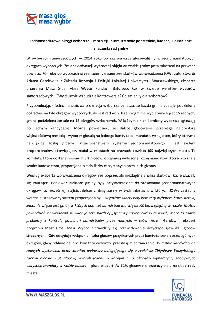 Jednomandatowe okręgi wyborcze – mocniejsi burmistrzowie poprzedniej kadencji i osłabienie znaczenia rad gminy W wyborach samorządowych w 2014 roku po raz pierwszy głosowaliśmy w jednomandatowych okręgach wyborczych. Zmiana ordynacji wyborczej objęła wszystkie gminy poza miastami na prawach powiatu. Pół roku po wyborach prezentujemy ekspertyzę skutków wprowadzenia JOW, autorstwa dr Adama Gendźwiłła z Zakładu Rozwoju i Polityki Lokalnej Uniwersytetu Warszawskiego, eksperta programu Masz Głos, Masz Wybór Fundacji Batorego. Czy w świetle wyników wyborów samorządowych JOWy słusznie wzbudzają kontrowersje? Co zmieniły dla wyborców? Przypominając - jednomandatowa ordynacja wyborcza oznacza, że każda gmina zostaje podzielona dokładnie na tyle okręgów wyborczych, ilu jest radnych. Jeżeli w gminie wybieranych jest 15 radnych, gmina podzielona zostaje na 15 okręgów wyborczych. W każdym z nich komitety wyborcze zgłaszają po jednym kandydacie. Można powiedzieć, że dalsze głosowanie przebiega najprostszą większościową metodą - wyborcy głosują na jednego kandydata i mandat uzyskuje ten, który otrzyma największą liczbę głosów. Przeciwieństwem systemu jednomandatowego jest system proporcjonalny, obowiązujący nadal w miastach na prawach powiatu (65 największych miast). Te komitety, które dostaną minimum 5% głosów, otrzymują wyliczoną liczbę mandatów, które przyznają swoim kandydatom, proporcjonalnie do liczby otrzymanych przez nich głosów. Według eksperta wprowadzenia okręgów nie poprzedziła niezbędna analiza skutków, które okazały się znaczące. Ponieważ niektóre gminy były przyzwyczajone do stosowania jednomandatowych okręgów już wcześniej, najistotniejsze zmiany zaszły w tych miastach, w których JOWy zastąpiły wcześniej stosowany system proporcjonalny. - Wyraźnie skorzystały komitety wyborcze burmistrzów, znacznie więcej jest gmin, w których komitet burmistrza ma większość bezwzględną w radzie. Można powiedzieć, że wzmocnił się więc jeszcze bardziej „system prezydencki” w gminach, może to rodzić problemy z kontrolą poczynań burmistrzów przez radnych. – mówi Adam Gendźwiłł, ekspert programu Masz Głos, Masz Wybór. Sprawdziły się przewidywania dotyczące zjawiska „głosów straconych”. Gdy decyduje wyłącznie liczba głosów pozyskanych przez kandydatów z poszczególnych okręgów, głosy oddane na inne komitety wyborcze przestają mieć znaczenie. W Kutnie kandydaci na radnych wystawieni przez komitet wyborczy ubiegającego się o reelekcję Zbigniewa Burzyńskiego zdobyli niecałe 39% głosów, wygrali jednak w każdym z 21 okręgów wyborczych, zdobywając wszystkie mandaty w radzie miasta – pisze ekspert. Aż 61% głosów nie przełożyło się na skład rady miasta. Dodatkowo, nowy system wyborczy może okazać się niewygodny dla niektórych mieszkańców. Najmniejsze gminy musiały zostać podzielone na bardzo małe okręgi, liczące nawet kilkudziesięciu wyborców. Granice podziału często są sztuczne, a tam, gdzie liczba ludności intensywnie się zmienia, trzeba będzie często je przesuwać. Trzeba jednak dostrzec także wskazane przez naszego eksperta plusy wprowadzonych zmian. Choć zmniejszył się udział kobiet wśród kandydatów, tam, gdzie znalazły się na listach, miały większe szanse na zdobycie mandatu. Umocniły się także komitety lokalne, bliższe mieszkańcom, choć nie wiadomo, na ile są one rzeczywiście „niezależne” od partii politycznych. Ekspertyza Zmiany niezauważone? O tym, jak zadziałały jednomandatowe okręgi wyborcze w wyborach do rad gmin w 2014 roku dr Adama Gendźwiłła jest częścią specjalistycznej publikacji Fundacji Batorego Co się wydarzyło 16 listopada? Wybory samorządowe 2014, która zostanie opublikowana do końca maja na stronie www.maszglos.pl. Kontakt: Katarzyna Rakowska Fundacja im. Stefana Batorego program Masz Głos, Masz Wybór [email protected] tel.: 22 536 02 31.