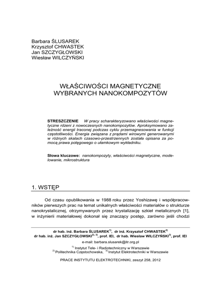 Barbara ŚLUSAREK Krzysztof CHWASTEK Jan SZCZYGŁOWSKI Wiesław WILCZYŃSKI WŁAŚCIWOŚCI MAGNETYCZNE WYBRANYCH NANOKOMPOZYTÓW STRESZCZENIE W pracy scharakteryzowano właściwości magnetyczne rdzeni z nowoczesnych nanokompozytów. Aproksymowano zaleŜność energii traconej podczas cyklu przemagnesowania w funkcji częstotliwości. Energia związana z prądami wirowymi generowanymi w róŜnych skalach czasowo-przestrzennych została opisana za pomocą prawa potęgowego o ułamkowym wykładniku. Słowa kluczowe: nanokompozyty, właściwości magnetyczne, modelowanie, mikrostruktura 1. WSTĘP Od czasu opublikowania w 1988 roku przez Yoshizawę i współpracowników pierwszych prac na temat unikalnych właściwości materiałów o strukturze nanokrystalicznej, otrzymywanych przez krystalizację szkieł metalicznych [1], w inŜynierii materiałowej dokonał się znaczący postęp, zarówno jeśli chodzi 1) 2) dr hab. inŜ. Barbara ŚLUSAREK , dr inŜ. Krzysztof CHWASTEK 2), 3) 3) dr hab. inŜ. Jan SZCZYGŁOWSKI , prof. IEl, dr hab. Wiesław WILCZYŃSKI , prof. IEl e-mail: [email protected] 1) 2) Instytut Tele- i Radiotechniczny w Warszawie 3) Politechnika Częstochowska, Instytut Elektrotechniki w Warszawie PRACE INSTYTUTU ELEKTROTECHNIKI, zeszyt 258, 2012 90 B. Ślusarek, K. Chwastek, J. Szczygłowski, W. Wilczyński o optymalizację procesu produkcyjnego tych materiałów, jak teŜ w zakresie ich praktycznych zastosowań w elektrotechnice [2-20]. Struktura tych materiałów jest decydującym czynnikiem warunkującym nowe jakościowo właściwości w porównaniu z właściwościami konwencjonalnych materiałów, co przedstawiono na rysunku 1. Materiały nanokrystaliczne uzyskuje się poprzez kontrolowaną częściową krystalizację materiału amorficznego. Materiały te charakteryzują się wielkością ziaren rzędu 10-25 nm fazy (bcc)(Fe,X), które obejmują 70-80% całkowitej objętości materiału. Rys. 1. Właściwości materiałów nanokrystalicznych na tle innych materiałów magnetycznie miękkich; litera M w zapisie Fe-M-B oznacza metal ziem rzadkich, np. Zr, Hf, Nb Źródło: opracowanie własne na podstawie [5] MoŜna wyróŜnić dwie podstawowe grupy stopów nanokrystalicznych róŜniących się wartościami uzyskiwanych indukcji nasycenia Bs – stopy Fe-Cu-Nb-B-Si (nazwa handlowa: Finemet) i Fe-Zr-(Cu)-B-(Si) (nazwa handlowa: Nanoperm). Mniej rozpowszechnione są stopy o składzie Fe-Co-Zr-Cu-B (HiTperm). Produkcja tych materiałów jest bardziej skomplikowana niŜ innych nanokrystalików z uwagi na zawartość cyrkonu, który jest pierwiastkiem bardzo aktywnym chemicznie. Ta cecha sprawia, Ŝe trudniejsze staje się kontrolowanie reakcji chemicznych zachodzących podczas wytwarzania materiału. Zalety HiTpermu to wysoka wartość indukcji nasycenia, rzędu 1,6-2,1 T oraz podwyŜszona wartość temperatury Curie, rzędu 900 K. Stopy nanokrystaliczne typu Finemet uzyskuje się poprzez odpowiednią obróbkę cieplną materiału amorficznego o składzie (FeCuNb)77,5(SiB)22,5, powyŜej temperatury pierwotnej krystalizacji (zwykle w temperaturze od 770 do 870 K), w polu magnetycznym taśm amorficznych na bazie Fe, Si i B z dodatkami Nb i Cu. Dodatki te wykazują przeciwstawny wpływ na proces wzrostu krystalitów. Atomy miedzi warunkują wzrost ziaren (tworzą centra nukleacji), natomiast atomy niobu, o stosunkowo duŜym promieniu, powodują jego hamowanie. W trakcie wyŜarzania zachodzi kontrolowana krystalizacja taśmy, której Właściwości magnetyczne wybranych nanokompozytów 91 głównym produktem jest drobnokrystaliczna (wielkości kilku nm) faza α-FeSi w otoczeniu fazy amorficznej Fe-Nb-B, co pokazano na rysunku 2. Rys. 2. Zdjęcie mikrostruktury taśmy nanokrystalicznej (FeCuNb)77,5(SiB)22,5 Źródło: [21] Na fotografii, otrzymanej za pomocą wysokorozdzielczego, transmisyjnego mikroskopu elektronowego (HRTEM) CM-20 firmy Philips, przedstawiono mikrostrukturę taśmy z materiału nanokrystalicznego o nominalnym składzie (FeCuNb)77,5(SiB)22,5 po obróbce cieplnej w temperaturze 793 K w ciągu 1 godziny [21]. Ziarna tworzą klastry (ciemniejsze plamy), otoczone fazą amorficzną (jaśniejsze szare tło), które na fotografii dają nieostry obraz. NaleŜy podkreślić, Ŝe warunki, w których wytwarzana jest taśma nanokrystaliczna, mają istotny wpływ na jej właściwości. Zagadnienie optymalizacji parametrów obróbki cieplnej taśm z materiałów amorficznych i nanokrystalicznych było przedmiotem badań m.in. w monografii [21]. W zaleŜności od parametrów obróbki cieplnej i składu chemicznego stopu, po wyŜarzaniu uzyskuje się ziarna wielkości kilku lub kilkudziesięciu nanometrów. Faza amorficzna, która wypełnia pozostałą objętość nazywa się fazą międzyziarnową. Udział obu faz w stopie oraz wielkość anizotropii decydują o właściwościach magnetycznych. W wyniku poddania taśmy opisanemu procesowi otrzymuje się materiał nanokrystaliczny wykazujący doskonałe miękkie właściwości magnetyczne. NatęŜenie pola koercji w tym materiale jest mniejsze od 1 A/m, a więc jest porównywalne z wartością natęŜenia koercji charakterystyczną dla najlepszych konwencjonalnych materiałów magnetycznych (permaloje). Ta cecha materiału wynika z faktu uśredniania anizotropii kreowanych krystalitów, których rozmiary są mniejsze od odległości korelacji dla ferromagnetycznych oddziaływań wymiennych (mechanizm tego oddziaływania opisują szczegółowo m.in. monografia [4] oraz praca [6]). Uśrednienie to prowadzi do zmniejszenia efektywnej anizotropii nawet o kilka rzędów wielkości [9] i w konsekwencji do niezmiernie małej koercji. Inną, atrakcyjną ze względu na zastosowania, cechą materiałów nanokrystalicznych jest to, Ŝe charakteryzują się praktycznie „zerową” magnetostrykcją (λS ≈ 1⋅⋅10−7), co wynika z kompensacji dwóch przyczynków do magnetostrykcji o przeciwnych znakach, pochodzących od krystalitów α-F