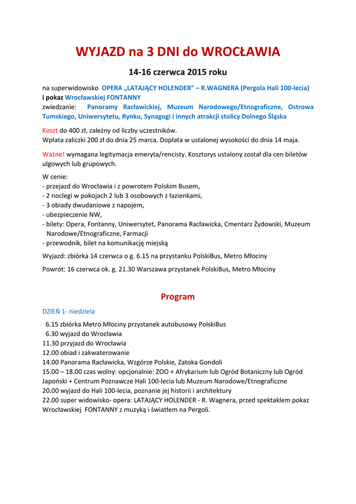 WYJAZD na 3 DNI do WROCŁAWIA 14-16 czerwca 2015 roku na superwidowisko OPERA „LATAJĄCY HOLENDER” – R.WAGNERA (Pergola Hali 100-lecia) i pokaz Wrocławskiej FONTANNY zwiedzanie: Panoramy Racławickiej, Muzeum Narodowego/Etnograficzne, Ostrowa Tumskiego, Uniwersytetu, Rynku, Synagogi i innych atrakcji stolicy Dolnego Śląska Koszt do 400 zł, zależny od liczby uczestników. Wpłata zaliczki 200 zł do dnia 25 marca. Dopłata w ustalonej wysokości do dnia 14 maja. Ważne! wymagana legitymacja emeryta/rencisty. Kosztorys ustalony został dla cen biletów ulgowych lub grupowych. W cenie: - przejazd do Wrocławia i z powrotem Polskim Busem, - 2 noclegi w pokojach 2 lub 3 osobowych z łazienkami, - 3 obiady dwudaniowe z napojem, - ubezpieczenie NW, - bilety: Opera, Fontanny, Uniwersytet, Panorama Racławicka, Cmentarz Żydowski, Muzeum Narodowe/Etnograficzne, Farmacji - przewodnik, bilet na komunikację miejską Wyjazd: zbiórka 14 czerwca o g. 6.15 na przystanku PolskiBus, Metro Młociny Powrót: 16 czerwca ok. g. 21.30 Warszawa przystanek PolskiBus, Metro Młociny Program DZIEŃ 1- niedziela 6.15 zbiórka Metro Młociny przystanek autobusowy PolskiBus 6.30 wyjazd do Wrocławia 11.30 przyjazd do Wrocławia 12.00 obiad i zakwaterowanie 14.00 Panorama Racławicka, Wzgórze Polskie, Zatoka Gondoli 15.00 – 18.00 czas wolny: opcjonalnie: ZOO + Afrykarium lub Ogród Botaniczny lub Ogród Japoński + Centrum Poznawcze Hali 100-lecia lub Muzeum Narodowe/Etnograficzne 20.00 wyjazd do Hali 100-lecia, poznanie jej historii i architektury 22.00 super widowisko- opera: LATAJĄCY HOLENDER - R. Wagnera, przed spektaklem pokaz Wrocławskiej FONTANNY z muzyką i światłem na Pergoli. DZIEŃ 2 - poniedziałek 7.45 zbiórka 9.00 - 16.00/17.00 zwiedzanie Wrocławia z przewodnikiem: dawne fortyfikacje i znaczenie Odry dla Wrocławia, pomnik Jana XXIII, Ostrów Tumski, katedra św. Jan, najstarszy kościół św. Idziego, brama Kluskowa, pomnik Nepomucena, mosty młyńskie, Hala Targowa, pl. Nankiera, katedra grekokatolicka –miejsce pochówku Henryka Pobożnego, kaplica barokowa, Zaułek Ossolińskich, Uniwersytet Wrocławski: Aula Leopoldyna, Oratorium Marianum, kościół barokowy -pieta, freski, Wieża matematyczna, Szermierz, Stare Miasto: jatki, kościół św. Elżbiety, Muzeum Krasnali, fasady kamieniczek na Rynku, Ratusz, kościół Marii Magdaleny - mostek Pokutny, Pl. Solny, Synagoga Pod Białym Bocianem W przerwie 12.30 – 13.30 obiad. 16.00/17.00 czas wolny (opcjonalnie: ul. Świdnicka - gmach Opery, Hotel Monopol, DH Renoma, Promenada Staromiejska, fosa, Wzgórze Partyzantów, Dworzec Główny, wjazd na najwyższą wieżę widokową w Polsce Sky Tower) DZIEŃ 3 - wtorek 7.45 9.30 zbiórka zwiedzanie Starego Cmentarz Żydowskiego z przewodnikiem (historia Żydów wrocławskich i architektura) 13.00 – 14.00 zwiedzanie Muzeum Farmacji z przewodnikiem (historia wiedzy o zdrowiu i leczeniu + akcesoria) 14.45-15.30 obiad 16.30 wyjazd do Warszawy 21.30 przyjazd do Warszawy Metro Młociny przystanek PolskiBus Koszty dodatkowe - bilety opcjonalne (ulgowy/zwykły): Sky Tower – 5,00/10,00 ZOO + Afrykarium – 12,00/25,00 Ogród Japoński + Centrum Poznawcze Hali 100-lecia – 10,00/14,00 Ogród Botaniczny – 5,00/15,00 W miejscu zakwaterowania kuchnia z wyposażeniem do samodzielnego przygotowania posiłków, można też zamówić indywidualnie posiłki: śniadanie 12 zł i kolacja 17 zł.