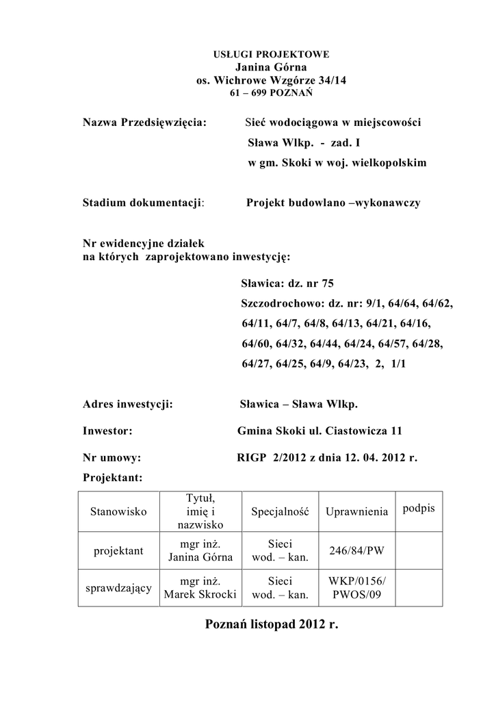 USŁUGI PROJEKTOWE Janina Górna os. Wichrowe Wzgórze 34/14 61 – 699 POZNAŃ Nazwa Przedsięwzięcia: Sieć wodociągowa w miejscowości Sława Wlkp. - zad. I w gm. Skoki w woj. wielkopolskim Stadium dokumentacji: Projekt budowlano –wykonawczy Nr ewidencyjne działek na których zaprojektowano inwestycję: Sławica: dz. nr 75 Szczodrochowo: dz. nr: 9/1, 64/64, 64/62, 64/11, 64/7, 64/8, 64/13, 64/21, 64/16, 64/60, 64/32, 64/44, 64/24, 64/57, 64/28, 64/27, 64/25, 64/9, 64/23, 2, 1/1 Adres inwestycji: Sławica – Sława Wlkp. Inwestor: Gmina Skoki ul. Ciastowicza 11 Nr umowy: RIGP 2/2012 z dnia 12. 04. 2012 r. Projektant: Stanowisko Tytuł, imię i nazwisko Specjalność Uprawnienia projektant mgr inż. Janina Górna Sieci wod. – kan. 246/84/PW sprawdzający mgr inż. Marek Skrocki Sieci wod. – kan. WKP/0156/ PWOS/09 Poznań listopad 2012 r. podpis SPIS TREŚCI I. OPIS TECHNICZNY 1. Podstawa opracowania. 2. Stan istniejący i zakres opracowania. 3. Obliczenia zapotrzebowania wody: 3.1. Zapotrzebowanie bytowo – gospodarcze. 3.2. Zapotrzebowanie wody na cele p. poż. 4. Rozwiązanie projektowe. 5. Opis projektowanej sieci; 5.1. Lokalizacja sieci. 5.2. Konstrukcja sieci. 5.3. Przejścia pod przeszkodami; 6. Istniejące uzbrojenie. 7. Uwagi końcowe. ZAŁĄCZNIKI - Wykaz działek Ustalenia z właścicielami BIOZ CZĘŚĆ RYSUNKOWA Plan orientacyjny 1. Plan zagospodarowania 1:1000 2. Plan zagospodarowania 1:1000 3. Plan zagospodarowania 1:1000 4. Schemat węzłów 5. Studzienka wodomierzowa 6. Przejście pod rowem 7. Bloki oporowe przy załamaniach trasy 8. Bloki oporowe przy rozgałęzieniach trasy 9. Zabezpieczenie kabli w wykopie OPIS TECHNICZNY do projektu budowlano – wykonawczego sieci wodociągowej Sława Wlkp. w gm. Skoki w woj. wielkopolskim. 1. Podstawa opracowania. - plany sytuacyjno – wysokościowe 1:1000 - dokonana w terenie wizja i ustalenia z Inwestorem - warunki techniczne podłączenia wydane przez Zakład Wodociągów i Kanalizacji w Skokach nr K.R.ZW/k 0041. 2012 z dnia 02. -8. 2012 r. 2. Stan istniejący i zakres opracowania. Przedmiotem niniejszego opracowania jest wykonanie projektu sieci wodociągowej na obszarze niezabudowanym, objętym miejscowym planem zagospodarowania przestrzennego z przeznaczeniem na zabudowę mieszkaniową na powierzchni około 150 ha - około 150 działek budowlanych, oraz na terenie Rodzinnych Ogrodów Działkowych w Sławie Wlkp. – 83 działki. Teren pod budownictwo mieszkaniowe jest nieuzbrojony, natomiast na terenie R.O.D. wodę do picia i na cele gospodarcze dostarczają lokalne studnie zlokalizowane na poszczególnych działkach. 3. Obliczenia zapotrzebowania wody. 3. 1. Zapotrzebowanie bytowo - gospodarcze. Zapotrzebowanie na wodę dla około 150 działek niezabudowanych i 83 działek ROD wynosi: Q śr.d = 122,2 m3/d Q max.d = 158,9 m3/d Q max.h = 13,24 m3/h Q sek. = 3,7 dm3/s 3. 2. Zapotrzebowanie wody na cele ppoż. Wielkość zapotrzebowania wody przyjęto zgodnie z rozporządzeniem Ministra Spraw Wewnętrznych i Administracji z dnia 16. 03. 09. w sprawie przeciwpożarowego zaopatrzenia w wodę oraz dróg pożarowych, (DZ.U.18 poz. 97 i 2006 ). przyjęto q = 5,0 + 1,25 = 6,25 dm3 /sek. – dla jednostek osadniczych do 2000 mieszkańców. Zapasy wody p. poż. przewidziano w zbiornikach wyrównawczych przy przepompowni w Skokach. 4. Rozwiązanie projektowe. Zgodnie z warunkami technicznymi wydanymi przez Zakład Wodociągów i Kanalizacji w Skokach, nowoprojektowaną sieć wodociągową należy włączyć do istniejącej sieci wodociągowej przy torach kolejowych PKP. Odcinek sieci od miejsca włączenia do działek niezabudowanych należy wykonać z rur PE zgrzewanych f 160 mm a dalej z rur PVC f 110 mm f 90 mm oraz rur PE f 50 mm i f 32 mm – przyłącza 83 szt. do granicy działek Wszystkie rury projektuje się na ciśnienie 10 atm. Łączna długość sieci wodociągowej wynosi 4793,5 m: - PE f 160 mm – 326,5 m. - PVC f 160 mm – 170,5 m - PVC f 110 mm – 2882,5 m - PVC f 90 mm – 913,5 m - PE f 50 mm – 500,5 m - PE f 32 mm – 172 m przyłącza 83 szt. do granicy działek Sieć wodociągowa zasilana będzie z przepompowni wody w Skokach. 5. Opis projektowanej sieci. 5. 1 Lokalizacja sieci. Trasa projektowanej sieci będzie przebiegała wzdłuż drogi wojewódzkiej do działek niezabudowanych. Na działkach niezabudowanych w wyznaczonych drogach gminnych a na terenie R.O.D. w drogach między działkowych do granicy działek. 5. 2. Konstrukcja sieci. Sieć wodociągową zaprojektowano z rur PCV kielichowych N 10SPR 17 o średnicach f 100 mm, f 90 mm oraz z rur PE zgrzewanych f 160 mm, f 50 mm, i f 32 mm – przyłącza 83 szt. do granicy działek Wszystkie rury przyjęto na ciśnienie 1,0 MPa. Sieć wodociągową należy uzbroić w zasuwy rozmieszczone w węzłach wodociągowych, odejściach do działek oraz odgałęzieniach do hydrantów p. poż. Przewidzieć zasuwy równoprzelotowe z miękkim uszczelnieniem i potrójnym doszczelnieniem dławic, obudowę teleskopową i skrzynkę uliczną do zasuw montowaną na płycie betonowej, dodatkowo stosować zabezpieczenie wierzchniej części skrzynki poprzez płytę betonową z otworem. Zagłębienie wodociągu min. 1,6 m. Nad wodociągiem na wysokości 20cm nad górną krawędzią rury, układać taśmę koloru biało-niebieskiego o szer. 20 cm z zatopioną wkładką metalową, a końcówki taśmy wprowadzić do skrzynek, zasuw i hydrantów. Należy zastosować hydranty DN 80 nadziemne PN 16 zamontowane 0,5 m od granicy działek. Rury należy ułożyć na podsypce piaskowej grubości 15 cm i wykonać obsypkę i zasypkę grubości 30 cm nad wierzchem rury, zagęszczoną do stopnia 0,98 PROCTORA. Na terenie R.O.D. zaprojektowano studzienkę wodomierzową z PE wyposażoną w wodomierz sprzężony f 80/20. Armaturę i uzbrojenie sieci wodociągowej należy wykonać z żeliwa sferoidalnego, zabezpieczyć antykorozyjnie farbą proszkowo-epoksydową. Trasę rurociągu, jego a