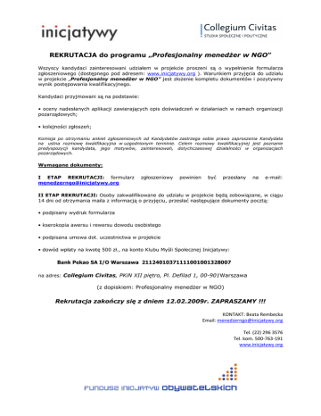 REKRUTACJA do programu „Profesjonalny menedŜer w NGO” Wszyscy kandydaci zainteresowani udziałem w projekcie proszeni są o wypełnienie formularza zgłoszeniowego (dostępnego pod adresem: www.inicjatywy.org ). Warunkiem przyjęcia do udziału w projekcie „Profesjonalny menedŜer w NGO” jest złoŜenie kompletu dokumentów i pozytywny wynik postępowania kwalifikacyjnego. Kandydaci przyjmowani są na podstawie: • oceny nadesłanych aplikacji zawierających opis doświadczeń w działaniach w ramach organizacji pozarządowych; • kolejności zgłoszeń; Komisja po otrzymaniu ankiet zgłoszeniowych od Kandydatów zastrzega sobie prawo zaproszenia Kandydata na ustna rozmowę kwalifikacyjna w uzgodnionym terminie. Celem rozmowy kwalifikacyjnej jest poznanie predyspozycji kandydata, jego motywów, zainteresowań, dotychczasowej działalności w organizacjach pozarządowych. Wymagane dokumenty: I ETAP REKRUTACJI: formularz [email protected] zgłoszeniowy powinien być przesłany na e-mail: II ETAP REKRUTACJI: Osoby zakwalifikowane do udziału w projekcie będą zobowiązane, w ciągu 14 dni od otrzymania maila z informacją o przyjęciu, przesłać następujące dokumenty pocztą: • podpisany wydruk formularza • kserokopia awersu i rewersu dowodu osobistego • podpisana umowa dot. uczestnictwa w projekcie • dowód wpłaty na kwotę 500 zł., na konto Klubu Myśli Społecznej Inicjatywy: Bank Pekao SA I/O Warszawa 21124010371111001001328007 na adres: Collegium Civitas, PKiN XII piętro, Pl. Defilad 1, 00-901Warszawa (z dopiskiem: Profesjonalny menedŜer w NGO) Rekrutacja zakończy się z dniem 12.02.2009r. ZAPRASZAMY !!! KONTAKT: Beata Rembecka Email: [email protected] Tel. (22) 296 3576 Tel. kom. 500-763-191 www.inicjatywy.org