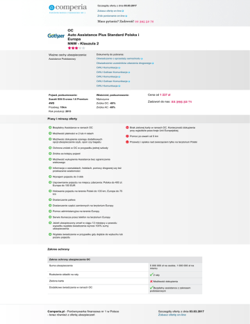 Szczegóły oferty z dnia 03.03.2017 Zobacz ofertę on-line Zrób porównanie on-line Masz pytania? Zadzwoń! 22 395 52 72 OC Auto Assistance Plus Standard Polska i Europa NNW - Klauzula 2 Ważne cechy ubezpieczenia: Dokumenty do pobrania: Assistance Podstawowy Oświadczenie o sprzedaży samochodu Oświadczenie uczestników zdarzenia drogowego OWU Komunikacja OWU Gothaer Komunikacja OWU Komunikacja OWU Gothaer Komunikacja OWU Komunikacja Pojazd, podsumowanie: Właściciel, podsumowanie: Suzuki SX4 S-cross 1.6 Premium Mężczyzna 4WD Zniżka OC: -60% Przebieg: 10km Zniżka AC: -60% Cena od 1 237 zł Zadzwoń do nas: 22 395 52 71 Rok produkcji: 2013 Plusy i minusy oferty Bezpłatny Assistance w ramach OC Brak zielonej karty w ramach OC. Konieczność dokupienia przy wyjeździe poza kraje Unii Europejskiej. Możliwość płatności w 2 lub 4 ratach Pomoc po awarii od 5 km Możliwośc dokupienia szeregu dodatkowych opcji:ubezpieczenie szyb, opon czy bagażu Przewóz i opieka nad zwierzęciem tylko na terytorium Polski Ochrona zniżek w OC w przypadku jednej szkody Zniżka za kolejny pojazd Możliwość wykupienia Assistance bez ograniczenia wiekowego Informacja o warsztatach, hotelach, pomocy drogowej czy też przekazanie wiadomości Wynajem pojazdu do 3 dób Usprawnianie pojazdu na miejscu zdarzenia: Polska do 400 zł. Europa do 100 EUR Holowanie pojazdu na terenie Polski do 135 km, Europa do 75 km Dostarczenie paliwa Dostarczenie części zamiennych na terytorium Europy Pomoc administarcyjna na terenie Europy Serwis tłumacza przez telefon na terytorium Europy Jeżeli ubezpieczony zmarł w ciągu 12 miesięcy z powodu wypadku wypłata świadczenia wynosi 100% sumy ubezpieczenia Wypłata świadczenia w przypadku gdy dojdzie do wybuchu lub pożaru pojazdu Zakres ochrony Zakres ochrony ubezpieczenia OC Suma ubezpieczenia 5 000 000 zł na osobie, 1 000 000 zł na mieniu Rozłożenie składki na raty 2 raty Zielona karta Możliwość dokupienia Dodatkowe świadczenia w ramach OC Comperia.pl - Porównywarka finansowa nr 1 w Polsce - teraz również z ofertą ubezpieczeń Bezpłatny assistance z zakresem podstawowym Szczegóły oferty z dnia 03.03.2017 Zobacz ofertę on-line Szczegóły oferty z dnia 03.03.2017 Zobacz ofertę on-line Zrób porównanie on-line Masz pytania? Zadzwoń! 22 395 52 72 Zakres ochrony Assistance Suma ubezpieczenia Zakres terytorialny Wiek pojazdu do którego można wykupić ubezpieczenie Polska i Europa (Rosja i Turcja w częściach europejskich, Chorwacja, Grecja, Hiszpania i Portugalia z wyłączeniem ich wysp) Bez ograniczeń Rodzaj pojazdu na który można wykupić ubezpieczenie samochody osobowe, ciężarowe o DMC do 3,5t., kempingowe, przyczepy lekkie do 750 kg, przyczepy kempingowe, motocykle Ograniczenia ze względu na sposób użytkowania pojazdu (np. taxi, nauka jazdy, rent a car) wyłączone są pojazdy taxi, nauki jazdy, rent a car Opcje zawarcia Usprawnienie pojazdu na miejscu zdarzenia niezależnie od innych ubezpieczeń tak (w Polsce do 400 zł, za granicą do 100 EUR) Pomoc w razie awarii Pomoc w razie wypadku Limit odległości od miejsca zamieszkania W przypadku awarii 5 km od miejsca zamieszkania, w przypadku wypadku brak limitu Miejsce holowania w Polsce do najbliższego warsztatu lub wskazane przez ubezpieczonego miejsce nie dalej niż miejsce zamieszkania (do 135 km), za granicą do 75 km Samochód zastępczy Tak, do 3 dób Złomowanie pojazdu Parkowanie pojazdu Tak, do 3 dób Transport zastępczy/przewóz osób Tak, przy zdarzeniach w odległości powyżej 50 km od miejsca zamieszkania Nocleg/zakwaterowanie Tak, do 3 dób (w Polsce limit 250 zł na osobę na dobę, za granicą limit 150 EUR na osobę na dobę), przy zdarzeniach w odległości powyżej 50 km od miejsca zamieszkania Dodatkowe informacje Zakres ochrony NNW Suma ubezpieczenia Wypłata świadczenia w razie śmierci 5.000 zł Jeśli wystąpiła ona w przeciągu 1 roku od daty wypadku 100% świadczenia Wsiadanie i wysiadanie z pojazdu Załadowanie lub wyładowanie pojazdu Pożar, wybuch pojazdu Zatrzymanie, postój, naprawa pojazdu Podwójne świadczenie w przypadku 90% trwałego uszczerbku na zdrowiu Garażowanie pojazdu Comperia.pl - Porównywarka finansowa nr 1 w Polsce - teraz również z ofertą ubezpieczeń Powered by TCPDF (www.tcpdf.org) Szczegóły oferty z dnia 03.03.2017 Zobacz ofertę on-line