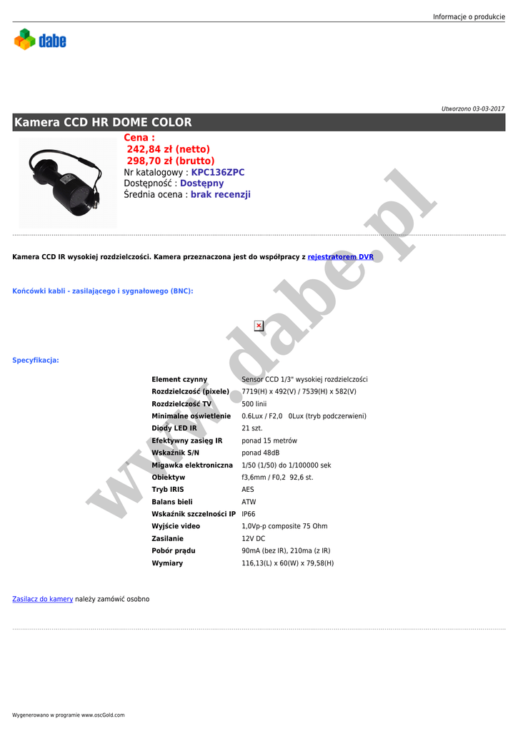 Informacje o produkcie Utworzono 03-03-2017 Kamera CCD HR DOME COLOR Cena : 242,84 zł (netto) 298,70 zł (brutto) e. pl Nr katalogowy : KPC136ZPC Dostępność : Dostępny Średnia ocena : brak recenzji Kamera CCD IR wysokiej rozdzielczości. Kamera przeznaczona jest do współpracy z rejestratorem DVR ab Końcówki kabli - zasilającego i sygnałowego (BNC): .d Specyfikacja: Sensor CCD 1/3" wysokiej rozdzielczości Rozdzielczość (pixele) 7719(H) x 492(V) / 7539(H) x 582(V) Rozdzielczość TV 500 linii w w w Element czynny Zasilacz do kamery należy zamówić osobno Wygenerowano w programie www.oscGold.com Minimalne oświetlenie 0.6Lux / F2,0 0Lux (tryb podczerwieni) Diody LED IR 21 szt. Efektywny zasięg IR ponad 15 metrów Wskaźnik S/N ponad 48dB Migawka elektroniczna 1/50 (1/50) do 1/100000 sek Obiektyw f3,6mm / F0,2 92,6 st. Tryb IRIS AES Balans bieli ATW Wskaźnik szczelności IP IP66 Wyjście video 1,0Vp-p composite 75 Ohm Zasilanie 12V DC Pobór prądu 90mA (bez IR), 210ma (z IR) Wymiary 116,13(L) x 60(W) x 79,58(H)