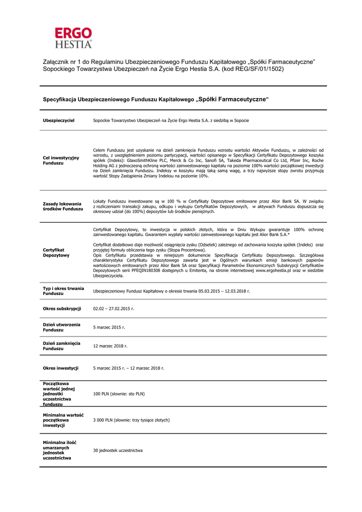Załącznik nr 1 do Regulaminu Ubezpieczeniowego Funduszu Kapitałowego „Spółki Farmaceutyczne” Sopockiego Towarzystwa Ubezpieczeń na Życie Ergo Hestia S.A. (kod REG/SF/01/1502) Specyfikacja Ubezpieczeniowego Funduszu Kapitałowego „Spółki Farmaceutyczne” Ubezpieczyciel Cel inwestycyjny Funduszu Zasady lokowania środków Funduszu Sopockie Towarzystwo Ubezpieczeń na Życie Ergo Hestia S.A. z siedzibą w Sopocie Celem Funduszu jest uzyskanie na dzień zamknięcia Funduszu wzrostu wartości Aktywów Funduszu, w zależności od wzrostu, z uwzględnieniem poziomu partycypacji, wartości opisanego w Specyfikacji Certyfikatu Depozytowego koszyka spółek (Indeks): GlaxoSmithKline PLC, Merck & Co Inc, Sanofi SA, Takeda Pharmaceutical Co Ltd, Pfizer Inc, Roche Holding AG z jednoczesną ochroną wartości zainwestowanego kapitału na poziomie 100% wartości początkowej inwestycji na Dzień zamknięcia Funduszu. Indeksy w koszyku mają taką samą wagę, a trzy najwyższe stopy zwrotu przyjmują wartość Stopy Zastąpienia Zmiany Indeksu na poziomie 10%. Lokaty Funduszu inwestowane są w 100 % w Certyfikaty Depozytowe emitowane przez Alior Bank SA. W związku z rozliczeniami transakcji zakupu, odkupu i wykupu Certyfikatów Depozytowych, w aktywach Funduszu dopuszcza się okresowy udział (do 100%) depozytów lub środków pieniężnych. Certyfikat Depozytowy, to inwestycja w polskich złotych, która w Dniu Wykupu gwarantuje 100% ochronę zainwestowanego kapitału. Gwarantem wypłaty wartości zainwestowanego kapitału jest Alior Bank S.A.* Certyfikat Depozytowy Certyfikat dodatkowo daje możliwość osiągnięcia zysku (Odsetek) zależnego od zachowania koszyka spółek (Indeks) oraz przyjętej formuły obliczenia tego zysku (Stopa Procentowa). Opis Certyfikatu przedstawia w niniejszym dokumencie Specyfikacja Certyfikatu Depozytowego. Szczegółowa charakterystyka Certyfikatu Depozytowego zawarta jest w Ogólnych warunkach emisji bankowych papierów wartościowych emitowanych przez Alior Bank SA oraz Specyfikacji Parametrów Ekonomicznych Subskrypcji Certyfikatów Depozytowych serii PFEQIN180308 dostępnych u Emitenta, na stronie internetowej www.ergohestia.pl oraz w siedzibie Ubezpieczyciela. Typ i okres trwania Funduszu Ubezpieczeniowy Fundusz Kapitałowy o okresie trwania 05.03.2015 – 12.03.2018 r. Okres subskrypcji 02.02 – 27.02.2015 r. Dzień utworzenia Funduszu 5 marzec 2015 r. Dzień zamknięcia Funduszu 12 marzec 2018 r. Okres inwestycji 5 marzec 2015 r. – 12 marzec 2018 r. Początkowa wartość jednej jednostki uczestnictwa funduszu 100 PLN (słownie: sto PLN) Minimalna wartość początkowa inwestycji 3 000 PLN (słownie: trzy tysiące złotych) Minimalna ilość umarzanych jednostek uczestnictwa 30 jednostek uczestnictwa Zarządzający Funduszem Podmiot uprawniony na podstawie powszechnie obowiązujących przepisów prawa do zarządzania aktywami na zlecenie Ryzyka związane z inwestycją w Fundusz Inwestowanie w Fundusz wiąże się między innymi z następującymi ryzykami: • Ryzyko Inwestycyjne - poziom ryzyka inwestycyjnego Funduszu jest tożsamy z ryzykiem inwestycyjnym Certyfikatów Depozytowych, w które lokowane są Aktywa Funduszu. Ze względu na ryzyko płynności oraz ryzyko kredytowe Emitenta Certyfikatów Depozytowych, Ubezpieczyciel nie gwarantuje ochrony kapitału zarówno w Okresie inwestycji jak i na jej koniec, określonej na poziomie 100% wartości początkowej inwestycji. • Ryzyko zmiany cen - z uwagi na charakter kształtowania się cen Certyfikatów Depozytowych, cena jednostki uczestnictwa Funduszu może ulegać istotnym zmianom w Okresie inwestycji. • Ryzyko nie osiągnięcia zysku z inwestycji, gdyż końcowe oprocentowanie Certyfikatów Depozytowych, a co za tym idzie możliwy wynik inwestycyjny Funduszu, nie jest z góry ustalony. Należy wziąć pod uwagę fakt, że zysk z inwestycji może być niższy niż oczekiwany lub nie wystąpić wcale • Ryzyko osiągnięcia stopy zwrotu niższej niż ewentualny wzrost wartości Indeksu – z uwagi na przyjętą formułę (Stopa Procentowa), stopa zwrotu z Funduszu nie będzie odzwierciedlała zachowania Indeksu. Należy wziąć pod uwagę fakt, że wartość wypłaty (ostateczna stopa zwrotu z Funduszu) zależy od ceny odkupu/wartości wykupu Certyfikatu Depozytowego otrzymanej od Emitenta. • Ryzyko utraty części zainwestowanego kapitału Emitent Certyfikatów Depozytowych zapewnia 100% ochronę kapitału tylko w Dniu Wykupu Certyfikatu. Ochrona kapitału dotyczy tylko Wartości początkowej inwestycji (nie obejmuje zapłaconej opłaty początkowej). W przypadku wycofania środków przed końcem okresu inwestycji istnieje ryzyko utraty części zainwestowanych środków. • Inwestycja w ramach Ubezpieczeniowych Funduszy Kapitałowych dokonywana jest na ryzyko ubezpieczonego, Klient podejmując decyzję o inwestycji powinien wziąć pod uwagę możliwość utraty całości zainwestowanego kapitału. • Ryzyko kredytowe Emitenta - całość zobowiązania płatniczego z tytułu Certyfikatów Depozytowych w okresie do Dnia Wykupu (włącznie) ciąży na Alior Bank Spółka Akcyjna, dlatego Klient powinien przed podjęciem decyzji o rozpoczęciu inwestycji ocenić wiarygodność kredytową Emitenta. • Ryzyko kredytowe Ubezpieczyciela – zobowiązania z tytułu umowy ubezpieczenia ciążą na STUnŻ Ergo Hestia SA, dlatego Klient powinien przed podjęciem decyzji o przystąpieniu do umowy ubezpieczenia ocenić wiarygodność kredytową Ubezpieczyciela. • Ryzyko wypłaty świadczenia ubezpieczeniowego/wartości wykupu w kwocie niższej niż wartość początkowa inwestycji • Ryzyko płynności – w zakresie obrotu wtórnego Certyfikatami Depozytowymi i ich wykupu, istnieje ryzyko opóźnienia lub braku realizacji transakcji odkupu/wykupu Certyfikatów Depozytowych przez Emitenta • Ryzyko ograniczonej płynności związane z cyklem umorzeń jednostek uczestnictwa Funduszu. • R