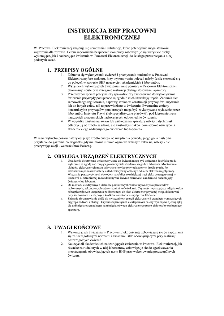 INSTRUKCJA BHP PRACOWNI ELEKTRONICZNEJ W Pracowni Elektronicznej znajdują się urządzenia i substancje, które potencjalnie mogą stanowić zagrożenie dla zdrowia. Celem zapewnienia bezpieczeństwa pracy zobowiązuje się wszystkie osoby wykonujące, jak i nadzorujące ćwiczenia w Pracowni Elektronicznej do ścisłego przestrzegania niżej podanych zasad. 1. PRZEPISY OGÓLNE 1. 2. 3. 4. Zabrania się wykonywania ćwiczeń i przebywania studentów w Pracowni Elektronicznej bez nadzoru. Przy wykonywaniu poleceń należy ściśle stosować się do poleceń w zakresie BHP nauczycieli akademickich i laborantów. Wszystkich wykonujących ćwiczenia i inne pomiary w Pracowni Elektronicznej obowiązuje ścisłe przestrzeganie instrukcji obsługi stosowanej aparatury. Przed rozpoczęciem pracy należy sprawdzić czy zastosowane do wykonywania ćwiczenia przyrządy podłączone są zgodnie z ich instrukcją użycia. Zabrania się: samowolnego regulowania, naprawy, zmian w konstrukcji przyrządów i używania ich do innych celów niż to przewidziano w ćwiczeniu. Ewentualne zmiany konstrukcyjne przyrządów pomiarowych mogą być wykonywane wyłącznie przez laborantów Instytutu Fizyki (lub specjalistyczne placówki), pod kierownictwem nauczycieli akademickich nadzorujących odpowiednie ćwiczenia. W wypadku zaistnienia awarii lub uszkodzenia aparatury należy natychmiast odłączyć ją od źródła zasilania, a o zaistniałym fakcie powiadomić nauczyciela akademickiego nadzorującego ćwiczenie lub laboranta. W razie wybuchu pożaru należy odłączyć źródło energii od urządzenia powodującego go, a następnie przystąpić do gaszenia. W wypadku gdy nie można stłumić ognia we własnym zakresie, należy - nie przerywając akcji - wezwać Straż Pożarną. 2. OBSŁUGA URZĄDZEŃ ELEKTRYCZNYCH 1. 2. 3. Urządzenia elektryczne wykorzystywane do ćwiczeń mogą być dołączane do źródła prądu wyłącznie za zgodą nadzorującego nauczyciela akademickiego lub laboranta. Montowanie układów elektrycznych może odbywać się tylko przy odłączonym źródle prądu. Po zakończeniu pomiarów należy układ elektryczny odłączyć od sieci elektroenergetycznej. Włączania poszczególnych obwodów na tablicy rozdzielczej sieci elektroenergetycznej w Pracowni Elektronicznej może dokonywać jedynie nauczyciel akademicki nadzorujący ćwiczenie lub laborant. Do montażu elektrycznych układów pomiarowych wolno używać tylko przewodów izolowanych, zakończonych odpowiednimi końcówkami. Czynności wymagające zdjęcia osłon zabezpieczających urządzenia podłączonego do sieci elektroenergetycznej mogą dokonywać przy zachowaniu niezbędnych środków ostrożności - wyłącznie laboranci. Zabrania się zastawiania dojść do wyłączników energii elektrycznej i urządzeń wymagających ciągłego nadzoru i obsługi. Czynności przełączeń elektrycznych należy wykonywać jedną ręką dla uniknięcia ewentualnego zamknięcia obwodu elektrycznego przez ciało osoby obsługującej aparaturę. 3. UWAGI KOŃCOWE 1. 2. Wykonujących ćwiczenia w Pracowni Elektronicznej zobowiązuje się do zapoznania się ze szczegółowymi normami i zasadami BHP obowiązującymi przy realizacji poszczególnych ćwiczeń. Nauczycieli akademickich nadzorujących ćwiczenia w Pracowni Elektronicznej, jak również zatrudnionych w niej laborantów, zobowiązuje się do egzekwowania przestrzegania obowiązujących norm BHP przy wykonywaniu poszczególnych ćwiczeń.