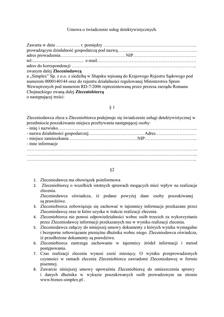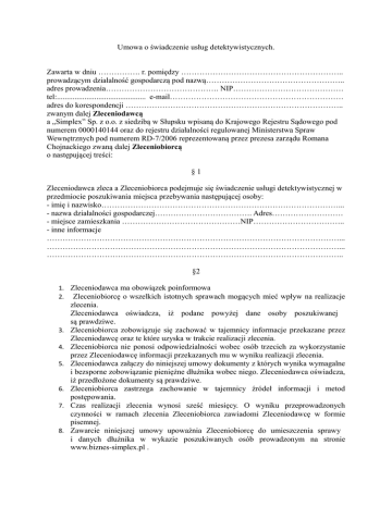 Umowa o świadczenie usług detektywistycznych. Zawarta w dniu ……………. r. pomiędzy …………………………………………………….. prowadzącym działalność gospodarczą pod nazwą…………………………………………….. adres prowadzenia……………………………………. NIP…………………………………… tel:............................................. e-mail………………………………………………………… adres do korespondencji ……………………………………………………………………….. zwanym dalej Zleceniodawcą a „Simplex” Sp. z o.o. z siedzibą w Słupsku wpisaną do Krajowego Rejestru Sądowego pod numerem 0000140144 oraz do rejestru działalności regulowanej Ministerstwa Spraw Wewnętrznych pod numerem RD-7/2006 reprezentowaną przez prezesa zarządu Romana Chojnackiego zwaną dalej Zleceniobiorcą o następującej treści: §1 Zleceniodawca zleca a Zleceniobiorca podejmuje się świadczenie usługi detektywistycznej w przedmiocie poszukiwania miejsca przebywania następującej osoby: - imię i nazwisko………………………………………………………………………………... - nazwa działalności gospodarczej………………………………. Adres……………………… - miejsce zamieszkania ………………………………………NIP…………………………….. - inne informacje …………………………………………………………………………………………………... …………………………………………………………………………………………………... ………………………………………………………………………………………………….. §2 1. Zleceniodawca ma obowiązek poinformowa 2. Zleceniobiorcę o wszelkich istotnych sprawach mogących mieć wpływ na realizacje 3. 4. 5. 6. 7. 8. zlecenia. Zleceniodawca oświadcza, iż podane powyżej dane osoby poszukiwanej są prawdziwe. Zleceniobiorca zobowiązuje się zachować w tajemnicy informacje przekazane przez Zleceniodawcę oraz te które uzyska w trakcie realizacji zlecenia. Zleceniobiorca nie ponosi odpowiedzialności wobec osób trzecich za wykorzystanie przez Zleceniodawcę informacji przekazanych mu w wyniku realizacji zlecenia. Zleceniodawca załączy do niniejszej umowy dokumenty z których wynika wymagalne i bezsporne zobowiązanie pieniężne dłużnika wobec niego. Zleceniodawca oświadcza, iż przedłożone dokumenty są prawdziwe. Zleceniobiorca zastrzega zachowanie w tajemnicy źródeł informacji i metod postępowania. Czas realizacji zlecenia wynosi sześć miesięcy. O wyniku przeprowadzonych czynności w ramach zlecenia Zleceniobiorca zawiadomi Zleceniodawcę w formie pisemnej. Zawarcie niniejszej umowy upoważnia Zleceniobiorcę do umieszczenia sprawy i danych dłużnika w wykazie poszukiwanych osób prowadzonym na stronie www.biznes-simplex.pl . §3 1. Z tytułu wykonywania niniejszej umowy Zleceniobiorca otrzyma wynagrodzenie w wysokości 500,00 zł netto. 2. Należność płatna jest przelewem na rachunek Zleceniobiorcy wskazany na fakturze w terminie 5 dni od dnia podpisania umowy. 3. Strony dopuszczają możliwość rozszerzenia zakresu niniejszego zlecenia. §4 1. Zleceniodawca oświadcza, iż zlecenie nie wiąże się z prowadzonym postępowaniem przygotowawczym na podstawie kodeksu postępowania karnego lub innym postępowaniem prowadzonym przeciwko osobie wskazanej w niniejszym zleceniu w związku z popełnieniem przez nią czynów skutkujących odpowiedzialnością karną. 2. Zleceniobiorca nie ponosi odpowiedzialności za niewykonanie zakresu zlecenia z przyczyn od niego niezależnych, bądź gdyby wykonanie zlecenia wiązało się z naruszeniem prawa, zagrażało bezpieczeństwu stron albo mogło naruszyć dobra jednej ze stron lub osób trzecich. 3. Umowa wchodzi w życie z dniem jej podpisania. 4. Umowę sporządzono w dwóch jednakowych egzemplarzach, po jednym dla każdej ze stron. ……………………………... …………………………………