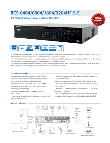 BCS-0404/0804/1604/3204HF-S-E Nowa 4/8/16/32 kanałowy cyfrowy rejestartor Effio 960H Platforma H.264 4/8/16 1920x1080 960H 16 kan. Max 400 kl/s Max 32TB HDD HDMI / VGA BCS-0404HF-S-E: 4 kanały video i 4 audio, 4 wyjścia przelotowe i 1 wyjście SPOT z podziałem okien. Obsługa VGA, HDMI, eSATA, USB2.0, DVD/CD/Blu-ray. Prędkość nagrywania: 100 kl/s na 4 kan. (25 kl/s na kanał) w 960H. BCS-0804HF-S-E: 8 kanałów video i 8 audio, 8 wyjść przelotowych i 1 wyjście SPOT z podziałem okien . Obsługa VGA, HDMI, eSATA, USB2.0, DVD/CD/Blu-ray. Prędkość nagrywania: 200 kl/s na 8 kan. (25 kl/s na kanał) w 960H. BCS-1604HF-S-E: 16 kanałów video i 16 audio, 16 wyjść przelotowych i 1 wyjście SPOT z podziałem okien. Obsługa VGA, HDMI, eSATA, DVD/CD/Blu-ray. Prędkość nagrywania: 400 kl/s na 16 kan. (25 kl/s na kanał) w 960H. Podstawowe cechy • Podgląd na żywo w czasie rzeczywistym 4/8/16 kamer • Obsługa pozycjonowania 3D z kamerami szybko-obrotowymi • Kompresja H.264 zapewnia maksymalną jakość nagrań PTZ z serii BCS-SD0x/D • Nagrywanie do 800 kl/s w rozdzielczości 960H* • Łatwa archiwizacja: przez USB, CD/DVD-RW/Blu-ray, przez Sieć • Równoczesna praca wyjść HDMI / VGA / TV/Spot(BNC) • Wyzwalanie alarmów: komunikat na ekranie, brzęczyk, reakcja • Pentaplex: obraz na żywo, nagrywanie, odtwarzanie, PTZ, e-mail, FTP archiwizacja i zdalny dostęp • Obsługa do 12 dysków twardych przez porty SATA i eSATA (8 • Synchroniczne odtwarzanie 16 kanałów z funkcją HDD wew. i 4 HDD zew.) SMART search • Pełna obsługa przez sieć: wbudowany web-server, obsługa do • Inteligentna detekcja ruchu: zasłonięcie kamery, zanik 20 użytkowników jednocześnie, DMSS(mobilna aplikacja) i CMS sygnału, wykrycie ruchu System połaczeń 1 VGA 1 HDMI 1 TV(BNC) 16 Przelotów 1 Spot Sterowanie PTZ 16 Kamer / PTZ CMS: DSS/PSS Wyj. video Wej. video RS485 Użytkownicy online Wej. audio Sieć Wyj. audio 16 Audio i 1 k. dwukierunkowy Wej./Wyj. alarmowe Urządzenia mobilne USB X 3 1 Audio i 1 k. dwukierunkowy 16 Wej. 6 Wyj. Urządzenia USB Pilot Obsługa macierzy eSATA Klawiatura sieciowa dotyczy BCS-1604HF-S-E Specyfikacja Model System Video Audio Ekran BCS-0404HF-S-E BCS-0804HF-S-E BCS-1604HF-S-E Procesor Wysokowydajny mikroprocesor System LINUX Funkcjonalność Funkcja Pentaplex: obraz na żywo, nagrywanie, odtwarzanie, archiwizacja i zdalny dostęp Kontrola Przedni panel, Mysz, Pilot, Klawiatura, Sieć Wejścia 4 kanały, BNC(1.0Vp-p, 75Ω) Standard PAL(625Linii, 50 kl/s) Wyjścia 1 HDMI, 1 VGA, 1 TV, 1 Spot, BNC(1.0Vp-p, 75Ω) 8 kanałów, BNC(1.0Vp-p, 75Ω) 16 kanały, BNC(1.0Vp-p, 75Ω) Przeloty 4 kanały 8 kanałów Wejścia 4 kanały, BNC(200-2800mV, 30KΩ) 8 kanałów, BNC(200-2800mV, 30KΩ) 16 kanałów, BNC(200-2800mV, 30KΩ) 16 kanałów/Brak Wyjścia 1 kanał, BNC(200-3000mV, 5KΩ) Kanał dwukierunkowy 1 kanał wej., BNC(200-2800mV, 30KΩ), 1 kanał wyj., BNC(200-3000mV, 5KΩ) Podział ekranu 1/4 1/4/8/9 1/4/8/9/16 Podział wyj. spot 1/4 1/4/8/9 1/4/8/9/16 Rozdzielczość 1920×1080, 1280×1024, 1280×720, 1024×768, 800×600 Sekwencja Tak Strefy prywatności 4 definiowalne strefy na każdym kanale OSD Nazwa, czas, zanik obrazu, blokada kamery, detekcja ruchu, nagrywanie Kompresja Video/Audio H.264 / G.711 Rozdzielczość nagrywania 960H(960x576) / D1/4CIF(704×576) / H960H(352×576) / 2CIF(704×288) / CIF(352×288) / QCIF(176×144) Prędkość kodowania Extra/Dodatkowy Strumień: CIF/QCIF(1~25 kl/s) Nagrywanie Video Detekcja i Alarm Odtwarzanie i Archiwizacja Sieć Dysk Twardy Dodatkowe Interfejsy Pozostałe Główny Strumień: 960H/H960H/2CIF/CIF(1~25 kl/s) Zajętość pasma 32~4096Kb/s Jakość obrazu 6 poziomów jakości (poziom 6 najlepszy, VBR) Tryb nagrywania Ręczne, Terminarz (Regularne (Ciągłe), MD (Detekcja: Detekcja ruchu, Zasłonięcie, Zanik sygnału) Priorytet nagrywania Ręczne >Alarm >MD >Regularne Czas nagrań 1~120 min. (domyślnie: 60 min.), Pre-nagrywanie: 1~30 sek., Post-nagrywanie: 10~300 sek. Wyzwalanie zdarzeń Nagrywanie, Akcja PTZ , Trasa, Alarm, Email, Wyjście spot Strefy prywatności Strefy: 396 (22×18), Czułość: 1~6 Zanik i Zasłonięcie kamery Tak Wejścia alarmowe 4 kanały Wyjścia przekaźnikowe 6 kanałów Odtwarzanie 1/2/4/Wszystkie Tryb szukania Czas/Data, Alarm, Detekcja ruchu i Zaawansowane szukanie (z dokładnością co do sekundy), Funkcja Smart search Funkcje odtwarzania Play, Pauza, Stop, Rew, Szybki play, Wolny play, Następny i Poprzedni plik, Następna, Poprzednia kamera, 8 kanałów 16 kanałów Pełny ekran, Powtarzanie, Wybór archiwizacji, Cyfrowy zoom Tryb archiwizacji Flash drive/ USB HDD/ USB CD/DVD-RWBlu-ray / eSATA / Sieć Interfejsy RJ-45 port (10/100M/1000M) Obsługiwane usługi HTTP, TCP/IP, UPNP, RTSP, UDP, SMTP, NTP, DHCP, DNS, IP Filter, PPPOE, DDNS, FTP, Alarm Server Zdalne obsługa Monitor, PTZ , Odtwarzanie, Ustawienia, Ściąganie plików, Log Dyski 8 HDD (wew.) lub 6 HDD + 1 CD/DVD/Blu-ray, dodatkowo po eSATA (obsługa do 4 HDD zew.) Zajętość nagrań Audio: 28.8MB/H, Video: 56~ 1800MB/H Zarządzanie HDD Hibernacja, Alarmy o błędach, Raid(Powielanie) USB 3 porty eSATA 1 port, nagrywanie, archiwizacja RS232 Klawiatura, Komunikacja PC RS485 PTZ control Zasilanie AC 100~240 V, 50/60 Hz Pobór mocy 25W Środowisko pracy -10~+55℃ / 10~90%RH / 86~106kpa Wymiary 2U, 440mm×460mm×89mm(W×D×H) Waga 6.5KG(bez HDD) 30W 40W