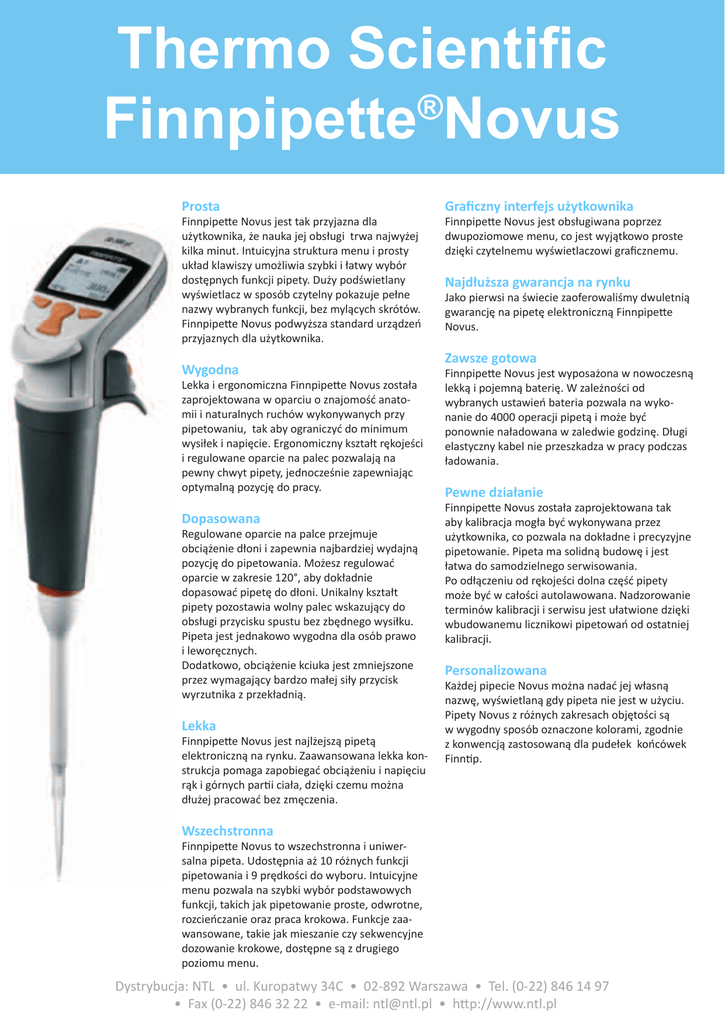Thermo Scientific ® Finnpipette Novus Prosta Graficzny interfejs użytkownika Finnpipette Novus jest tak przyjazna dla użytkownika, że nauka jej obsługi trwa najwyżej kilka minut. Intuicyjna struktura menu i prosty układ klawiszy umożliwia szybki i łatwy wybór dostępnych funkcji pipety. Duży podświetlany wyświetlacz w sposób czytelny pokazuje pełne nazwy wybranych funkcji, bez mylących skrótów. Finnpipette Novus podwyższa standard urządzeń przyjaznych dla użytkownika. Finnpipette Novus jest obsługiwana poprzez dwupoziomowe menu, co jest wyjątkowo proste dzięki czytelnemu wyświetlaczowi graficznemu. Wygodna Lekka i ergonomiczna Finnpipette Novus została zaprojektowana w oparciu o znajomość anatomii i naturalnych ruchów wykonywanych przy pipetowaniu, tak aby ograniczyć do minimum wysiłek i napięcie. Ergonomiczny kształt rękojeści i regulowane oparcie na palec pozwalają na pewny chwyt pipety, jednocześnie zapewniając optymalną pozycję do pracy. Dopasowana Regulowane oparcie na palce przejmuje obciążenie dłoni i zapewnia najbardziej wydajną pozycję do pipetowania. Możesz regulować oparcie w zakresie 120°, aby dokładnie dopasować pipetę do dłoni. Unikalny kształt pipety pozostawia wolny palec wskazujący do obsługi przycisku spustu bez zbędnego wysiłku. Pipeta jest jednakowo wygodna dla osób prawo i leworęcznych. Dodatkowo, obciążenie kciuka jest zmniejszone przez wymagający bardzo małej siły przycisk wyrzutnika z przekładnią. Lekka Finnpipette Novus jest najlżejszą pipetą elektroniczną na rynku. Zaawansowana lekka konstrukcja pomaga zapobiegać obciążeniu i napięciu rąk i górnych partii ciała, dzięki czemu można dłużej pracować bez zmęczenia. Najdłuższa gwarancja na rynku Jako pierwsi na świecie zaoferowaliśmy dwuletnią gwarancję na pipetę elektroniczną Finnpipette Novus. Zawsze gotowa Finnpipette Novus jest wyposażona w nowoczesną lekką i pojemną baterię. W zależności od wybranych ustawień bateria pozwala na wykonanie do 4000 operacji pipetą i może być ponownie naładowana w zaledwie godzinę. Długi elastyczny kabel nie przeszkadza w pracy podczas ładowania. Pewne działanie Finnpipette Novus została zaprojektowana tak aby kalibracja mogła być wykonywana przez użytkownika, co pozwala na dokładne i precyzyjne pipetowanie. Pipeta ma solidną budowę i jest łatwa do samodzielnego serwisowania. Po odłączeniu od rękojeści dolna część pipety może być w całości autolawowana. Nadzorowanie terminów kalibracji i serwisu jest ułatwione dzięki wbudowanemu licznikowi pipetowań od ostatniej kalibracji. Personalizowana Każdej pipecie Novus można nadać jej własną nazwę, wyświetlaną gdy pipeta nie jest w użyciu. Pipety Novus z różnych zakresach objętości są w wygodny sposób oznaczone kolorami, zgodnie z konwencją zastosowaną dla pudełek końcówek Finntip. Wszechstronna Finnpipette Novus to wszechstronna i uniwersalna pipeta. Udostępnia aż 10 różnych funkcji pipetowania i 9 prędkości do wyboru. Intuicyjne menu pozwala na szybki wybór podstawowych funkcji, takich jak pipetowanie proste, odwrotne, rozcieńczanie oraz praca krokowa. Funkcje zaawansowane, takie jak mieszanie czy sekwencyjne dozowanie krokowe, dostępne są z drugiego poziomu menu. Dystrybucja: NTL • ul. Kuropatwy 34C • 02-892 Warszawa • Tel. (0-22) 846 14 97 • Fax (0-22) 846 32 22 • e-mail: [email protected] • http://www.ntl.pl Większe możliwości wielokanałowych Wydajne dozowanie krokowe Wprowadzenie modeli wielokanałowych do rodziny Novus pozwala cieszyć się z udogodnień pipety elektronicznej przy pracy z mikropłytkami. Wielokanałowa Finnpipette Novus z zestawem 10 zaawansowanych funkcji jest idealnym narzędziem do wymagających prac laboratoryjnych, takich jak dozowanie serii różnych objętościach w określonym porządku, czy dozowanie z mieszaniem. Lekka i ergonomiczna konstrukcja wielokanałowych pipet Novus pozwala na komfortową pracę również przy prostych codziennych czynnościach. Nowa pipeta ośmiokanałowa Novus 1200 jest idealnym narzędziem do wielokrotnego dozowania dużych objętości z krokiem od 50μl do 1200μl. Przykładowo, możesz nadzwyczaj sprawnie napełnić po 100μl do 12 kolumn, napełniając za jednym razem całą płytkę. Novus jest także doskonałym narzędziem do napełniania płytek o głębokich dołkach. Dokładność dozowania krokowego jest zapewniana przez zastosowanie specjalne zaprojektowanych do tego zadania końcówek Finntip Flex 1200. Finnpipette Novus Nr kat. Zakres objętości Krok nastawu Objętość Dokładność Precyzja μl μl % s.d.μl CV% 46200000 1-10μl 0,01μl 10 ±0,10 ±1,0 0,05 0,5 1 ±0,035 ±3,5 0,03 3 46200100 1-10μl 0,01μl 10 ±0,10 ±1,0 0,05 0,5 1 ±0,070 ±7,0 0,06 6 46200200 5-50μl 0,1μl 50 ±0,40 ±0,8 0,15 0,3 5 ±0,15 ±3,0 0,125 2,5 46200300 46200400 46200500 46200600 46200700 5-50μl 0,1μl 10-100μl ±0,40 ±0,8 0,15 0,3 5 ±0,15 ±3,0 0,125 2,5 100 ±0,80 ±0,8 0,2 0,2 10 ±0,30 ±3,0 0,1 1 300 ±1,8 ±0,6 0,6 0,2 30 ±0,90 ±3,0 0,21 0,7 1000 ±6,0 ±0,6 2 0,2 100 ±3,0 ±3,0 0,6 0,6 5000 ±30,0 ±0,6 10 0,2 500 ±15,0 ±3,0 4 0,8 10000 ±60,0 ±0,6 20 0,2 1000 ±30,0 ±3,0 8 0,8 0,1μl 30-300μl 1μl 100-1000μl 1μl 0.5-5ml 46200800 50 0,01ml 1-10ml 0,01ml Kolor Końcówka Finntip różowy 10 żółty 250 Univ., 200 Ext. turkusowy 50 żółty 250 Univ., 200 Ext. żółty 250 Univ., 200 Ext. pomarańczowy 300, Flex 300 niebieski 1000, 1000 Ext. zielony 5ml czerwony 10ml Finnpipette Novus Wielokanałowe Nr kat. Kanały Zakres objętości Krok nastawu Objętość Dokładność μl μl 46300000 8 1-10μl 0,1μl 10 ±0,24 1 ±0,12 ±12,0 0,08 46300100 12 1-10μl 0,1μl 10 ±0,24 1 ±0,12 ±12,0 0,08 46300200 8 5-50μl 0,1μl 50 ±0,75 ±1,5 0,35 5 ±0,25 ±5,0 50 ±0,75 ±1,5 0,35 5 ±0,25 ±5,0 0,1 2 300 ±3,0 ±1,0 0,9 0,3 30 ±0,30 ±3,0 0,1 1 300 ±3,0 ±1,0 0,9 0,3 30 ±0,30 ±3,0 0,1 1 50 