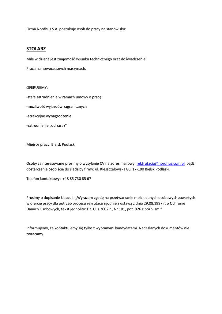 Firma Nordhus S.A. poszukuje osób do pracy na stanowisku: STOLARZ Mile widziana jest znajomość rysunku technicznego oraz doświadczenie. Praca na nowoczesnych maszynach. OFERUJEMY: -stałe zatrudnienie w ramach umowy o pracę -możliwość wyjazdów zagranicznych -atrakcyjne wynagrodzenie -zatrudnienie „od zaraz” Miejsce pracy: Bielsk Podlaski Osoby zainteresowane prosimy o wysyłanie CV na adres mailowy: [email protected] bądź dostarczenie osobiście do siedziby firmy: ul. Kleszczelowska 86, 17-100 Bielsk Podlaski. Telefon kontaktowy: +48 85 730 85 67 Prosimy o dopisanie klauzuli: „Wyrażam zgodę na przetwarzanie moich danych osobowych zawartych w ofercie pracy dla potrzeb procesu rekrutacji zgodnie z ustawą z dnia 29.08.1997 r. o Ochronie Danych Osobowych, tekst jednolity: Dz. U. z 2002 r., Nr 101, poz. 926 z późn. zm.” Informujemy, że kontaktujemy się tylko z wybranymi kandydatami. Nadesłanych dokumentów nie zwracamy.