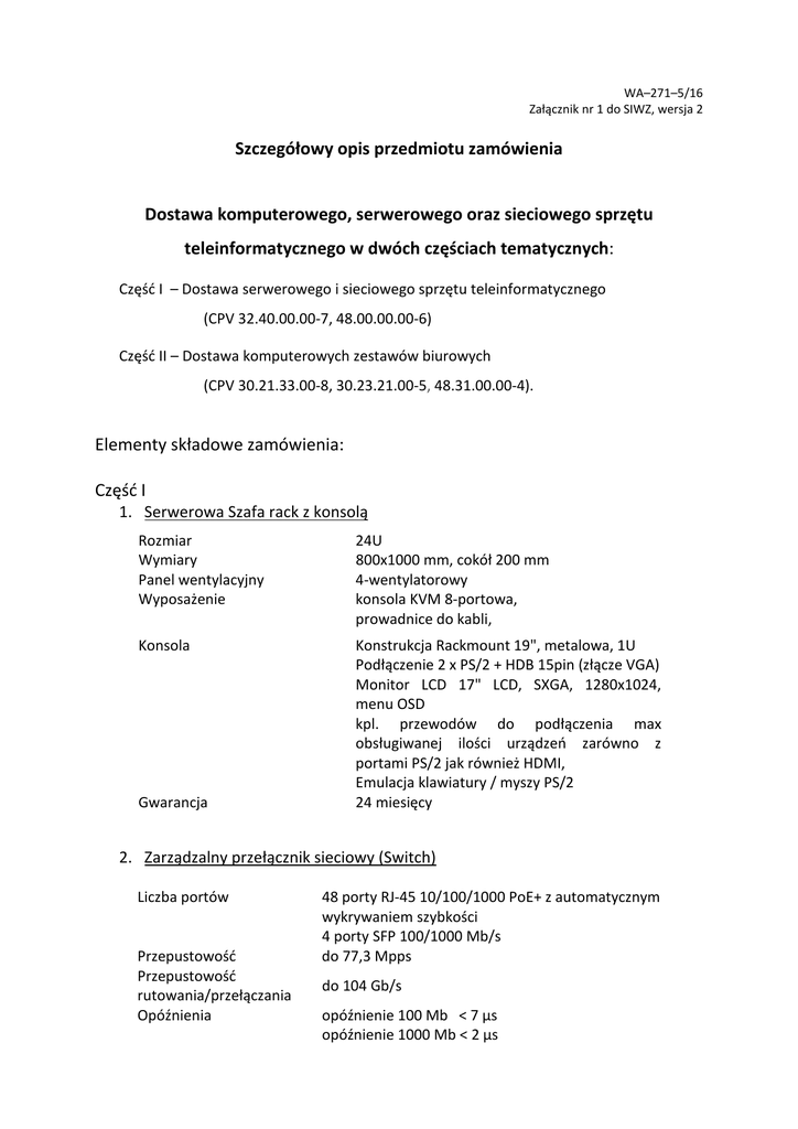 WA–271–5/16 Załącznik nr 1 do SIWZ, wersja 2 Szczegółowy opis przedmiotu zamówienia Dostawa komputerowego, serwerowego oraz sieciowego sprzętu teleinformatycznego w dwóch częściach tematycznych: Część I – Dostawa serwerowego i sieciowego sprzętu teleinformatycznego (CPV 32.40.00.00-7, 48.00.00.00-6) Część II – Dostawa komputerowych zestawów biurowych (CPV 30.21.33.00-8, 30.23.21.00-5, 48.31.00.00-4). Elementy składowe zamówienia: Część I 1. Serwerowa Szafa rack z konsolą Rozmiar Wymiary Panel wentylacyjny Wyposażenie 24U 800x1000 mm, cokół 200 mm 4-wentylatorowy konsola KVM 8-portowa, prowadnice do kabli, Konsola Konstrukcja Rackmount 19", metalowa, 1U Podłączenie 2 x PS/2 + HDB 15pin (złącze VGA) Monitor LCD 17" LCD, SXGA, 1280x1024, menu OSD kpl. przewodów do podłączenia max obsługiwanej ilości urządzeń zarówno z portami PS/2 jak również HDMI, Emulacja klawiatury / myszy PS/2 24 miesięcy Gwarancja 2. Zarządzalny przełącznik sieciowy (Switch) Liczba portów Przepustowość Przepustowość rutowania/przełączania Opóźnienia 48 porty RJ-45 10/100/1000 PoE+ z automatycznym wykrywaniem szybkości 4 porty SFP 100/1000 Mb/s do 77,3 Mpps do 104 Gb/s opóźnienie 100 Mb < 7 µs opóźnienie 1000 Mb < 2 µs VLAN Pojemność przełączania Funkcje zarządzania, monitorowania Obudowa Napięcie zasilania Gwarancja 802.1q 104 Gb/s przeglądarka internetowa, SNMP rack 19” 230V AC 24 miesięcy 3. Firewall Aplikacyjny Interfejsy sieciowe 8 niezależnych portów Gigabit Ethernet, 2 porty SFP Ilość interfejsów VLAN Maksymalna przepustowość Przepustowość 3DES / AES Przepustowość antywirusa Przepustowość IPS Ilość połączeń na sekundę Maksymalna ilość połączeń Ilość tuneli site-to-site Obudowa Funkcjonalności Licencja Gwarancja 50 1,9 Gbps 1,1 Gbps 300 Mbps 700 Mbps 15.000 225.000 75 rack 19” strefy bezpieczeństwa, funkcja NAT, obsługa wielu dostawców WAN, load balancing, zintegrowany kontroler i switch wi-fi, Routing oparty o polityki, kontrola połączeń SSL nie wymagająca ingerencji na komputerze użytkownika, ochrona połączeń VoiP, zarządzanie poprzez SSHv2, standardy serwera VPN (IKEv2, SSL, IPSec), 802.1q VLAN, obsługa protokołów RIPv2 i OSPF, Redundancja portów, Integracja z Active Directory, Anty DoS/DDoS, 1 rok bezpłatnego okresu aktualizacji polityk bezpieczeństwa 24 miesięcy 4. Serwer z macierzą dyskową Procesor Zainstalowana pamięć Możliwa do zainstalowania pamięć Dysk systemowy Uzyskujący w teście CPU Benchmark min. 5951 pkt. minimum cztery wątki, minimum cztery rdzenie, minimum 6MB cache. 8GB DDR3 SDRAM 32GB SATA 320GB 7200rpm Dyski wewnętrzne Porty LAN Porty USB Wyjścia SAS/SATA Interface dyskowy Zasilacz PCI-e Wiatrak Obudowa Gwarancja HDD 6 x 3TB, 64MB Cache, MTBF = 1000000 h RJ-45×3, 10/100/1000 BASE-TX Auto MDI/MDI-X Wake-On-Lan USB 2.0 - przód x2/tył x4 USB 3.0 - port x2 przód HDMI Kontroler wspierający 6G SAS/SATA III 12 x SATA 1 x eSATA redundanty, 500W 4 szt. 4 szt. Hot Swap 2U 24 miesięcy Licencja systemu operacyjnego serwera musi pozwalać na wykorzystywanie go przez dowolną liczbę użytkowników i nie może wymagać licencji dostępowych. Macierz oparta na systemie musi zapewniać: natywną obsługę wirtualizacji Hyper-V, deduplikację, iSCSI, zdalne zarządzanie RDP, podłączenie do domeny Active Directory, Serwer HTTP(s), Serwer usługi Active Directory, obsługę SharePoint. 5. Zasilacz UPS Moc Moc pozorna Obudowa Czas podtrzymania przy pełnym obciążeniu Funkcje Interfejsy komunikacyjne Znamionowe napięcie Przyłącze wejścia Przyłącza wyjścia Certyfikat Gwarancja 2,7 kW 3000 VA rack 19” 6 min ochrona przed przeciążeniem możliwość awaryjnego wyłączenia zasilania możliwość wymiany baterii podczas pracy USB RJ-45 Ethernet 100 Mb/s zamontowana wewnątrz UPS 230V AC IEC 320 C20 8x IEC 320 C13, 1x IEC 320 C19 RoHS 24 miesięcy Część II 1. Zestaw komputerowy – 34 sztuk Wydajność obliczeniowa - procesor, który otrzymał w teście PassMark Software / CPU Benchmark min. 5000 pkt; Płyta główna - wyposażona w BIOS typu FLASH EPROM, posiadający procedury oszczędzania energii i zapewniający mechanizm plug&play producenta sprzętu oraz zawierający niezamazywalną informację o producencie, modelu i numerze seryjnym komputera; BIOS ze wsparciem dla PXE (Preboot Execution Environment). Pamięć - min. 8 GB, DDR3, 1600 MHz; operacyjna RAM - możliwość rozbudowy do 16GB bez konieczności wymiany istniejących układów pamięci; - min. 1 wolne złącze pamięci Karta graficzna - wyposażona min. w 2 porty cyfrowe (np. HDMI, DVI-D, Display Port); - zapewniająca sprzętowe wsparcie dla DirectX 11 i OpenGL 3.x. Dysk Twardy - 2 dyski twarde: - min. 256 GB SSD; - min. 1000 GB, 3,5”, SATA; Karta dźwiękowa - zintegrowana z płytą główną, - porty audio z przodu obudowy: wyjście na słuchawki i wejście na mikrofon; Karta sieciowa - 1x Gigabit Ethernet RJ45; Napęd optycz. - wewnętrzny napęd DVD±R/RW, SATA, Porty USB - co najmniej 6 portów USB w obudowie komputera; w tym min. 2 x USB 3.0 oraz min. 4 x USB 2.0; - min. 2 porty USB z przodu i min. 4 porty USB z tyłu obudowy; - nie dopuszcza się wykorzystywania rozgałęziaczy i replikatorów portów USB; Obudowa - typu Micro, Mini lub MidiTower; - konstrukcja musi zapewniać dostęp z zewnątrz do zainstalowanych wewnątrz komputera kart rozszerzeń oraz dysków i napędów bez użycia narzędzi; - karty rozszerzeń, dyski twarde oraz napędów zainstalowane wewnątrz obudowy komputera tak, by wymiana tych elementów odbywała się z zewnątrz bez użycia narzędzi; - głośność nie przekraczająca 27 dB z pozycji operatora dla pracy komputera w trybie jałowym; - kabel zasilający o długości min. 2 mb; - wbudowany czytnik kart Smart Card zgodny ze standardem ISO 7816-1/2/3/4 chip card interface oraz oprogramowanie do obsługi czytnika w systemie; - zasilacz o mocy 550W System - za