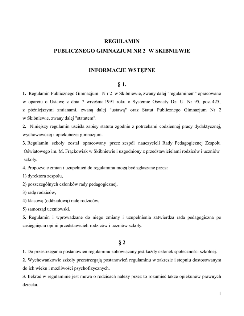 REGULAMIN PUBLICZNEGO GIMNAZJUM NR 2 W SKIBNIEWIE INFORMACJE WSTĘPNE § 1. 1. Regulamin Publicznego Gimnazjum N r 2 w Skibniewie, zwany dalej "regulaminem" opracowano w oparciu o Ustawę z dnia 7 września 1991 roku o Systemie Oświaty Dz. U. Nr 95, poz. 425, z późniejszymi zmianami, zwaną dalej "ustawą" oraz Statut Publicznego Gimnazjum Nr 2 w Skibniewie, zwany dalej "statutem". 2. Niniejszy regulamin uściśla zapisy statutu zgodnie z potrzebami codziennej pracy dydaktycznej, wychowawczej i opiekuńczej gimnazjum. 3. Regulamin szkoły został opracowany przez zespól nauczycieli Rady Pedagogicznej Zespołu Oświatowego im. M. Frąckowiak w Skibniewie i uzgodniony z przedstawicielami rodziców i uczniów szkoły. 4. Propozycje zmian i uzupełnień do regulaminu mogą być zgłaszane przez: 1) dyrektora zespołu, 2) poszczególnych członków rady pedagogicznej, 3) radę rodziców, 4) klasową (oddziałową) radę rodziców, 5) samorząd uczniowski. 5. Regulamin i wprowadzane do niego zmiany i uzupełnienia zatwierdza rada pedagogiczna po zasięgnięciu opinii przedstawicieli rodziców i uczniów szkoły. §2 1. Do przestrzegania postanowień regulaminu zobowiązany jest każdy członek społeczności szkolnej. 2. Wychowankowie szkoły przestrzegają postanowień regulaminu w zakresie i stopniu dostosowanym do ich wieku i możliwości psychofizycznych. 3. Ilekroć w regulaminie jest mowa o rodzicach należy przez to rozumieć także opiekunów prawnych dziecka. 1 Rozdział 1 CZŁOWIEK - CZŁONEK SZKOLNEJ SPOŁECZNOŚCI § 3. 1. Każdy członek szkolnej społeczności - jako człowiek - bez względu na swój wiek i funkcję w szkole ma prawo do: 1) poszanowania swej godności, swego dobrego imienia oraz swej własności osobistej ze strony wszystkich pozostałych, 2) rzetelnej i sprawiedliwej oceny swego zachowania i postępów w nauce lub oceny swej pracy przez przełożonych, 3) właściwie zorganizowanego procesu kształcenia i bezpiecznych warunków pobytu w szkole, 4) rozwijania zdolności i zainteresować, 5) korzystania z dodatkowej pomocy nauczycieli. 2. Każdy członek szkolnej społeczności ma obowiązek: 1) poszanowania godności osobistej, dobrego imienia i własności pozostałych osób, 2) jeśli ma przyznaną opiekę nad innymi osobami, musi dbać o dobro podległych sobie osób i o rzetelną i sprawiedliwą ocenę ich zachowania i osiągnięć. 3. Nikt nie ma prawa do: 1) wykorzystania swojej przewagi wieku, funkcji czy większości lub siły fizycznej czy ekonomicznej do naruszania godności i praw innego człowieka, a ewentualna wina musi być udowodniona. 4. Każdy członek szkolnej społeczności odpowiada, proporcjonalnie do dojrzałości, wieku, kwalifikacji czy funkcji, za szkody uczynione drugiemu człowiekowi. Rozdział 2 NAUCZANIE I UCZENIE SIĘ § 4. 1. Lekcja jest główną formą procesu nauczania i wychowania w szkole. Uczniowie mają prawo do: 2 1) znajomości celu lekcji oraz swoich zadań lekcyjnych, 2) jasnego i zrozumiałego dla nich przekazu treści lekcji, 3) w czasie lub po zakończeniu zajęć zadawania pytań nauczycielowi w przypadku trudności w rozumieniu treści lekcji, 4) indywidualnego traktowania na lekcji w zależności od zdolności. 2. Uczniowie mają obowiązek: 1) punktualnego i systematycznego przychodzenia na zajęcia, 2) brać aktywny udział w lekcji, rzetelnie i systematycznie uczyć się, 3) przestrzegać ustalonych zasad i porządku w czasie lekcji, 4) uzupełniać braki wynikające z nieobecności na lekcji. 3. Nauczyciele mają prawo do wyboru form organizacyjnych i metod pracy lekcyjnej. 4. Nauczyciele ponoszą odpowiedzialność za przygotowanie niezbędnych środków dydaktycznych wywołujących aktywność poznawczą lub ruchową oraz za bezpieczne ich używanie. 5. Organ prowadzący oraz dyrektor zespołu mają obowiązek zapewnić nauczycielowi podstawowe środki i materiały dydaktyczne. 6. W czasie zastępstw nauczyciel powinien prowadzić lekcję z przedmiotu, który jest w planie lub lekcję z własnego przedmiotu albo inne zajęcia edukacyjne. 7. Jeśli zastępstwo jest zapowiedziane co najmniej w dniu poprzedzającym lekcję, na której będzie zastępstwo, uczniowie obowiązani są przygotować się do odpowiedniej lekcji. § 5. 1. Praca domowa jest stosowana do wyćwiczenia przez uczniów określonych umiejętności lub przygotowywania się do następnej lekcji. Uczniowie mają prawo do: 1) oceny pracy domowej przez nauczyciela, 2) indywidualnego traktowania w zależności od zdolności i możliwości psychofizycznych 3) ukierunkowania przez nauczyciela, jak wykonać zadanie domowe. 2. Uczniowie mają obowiązek: 1) wykonywania pracy domowej, 2) kształtowania nawyku wykonywania zadań domowych w tym dniu, w którym zostały polecone. 3. Uczniowie ponoszą odpowiedzialność w postaci stosowanej oceny, jeśli nie wywiązują się z pracy domowej lub stosują chwyty nie fair "zapominając zeszytu". 3 4. Nauczyciele mają prawo do: 1) ustalania zasad pracy domowej swego przedmiotu oraz zasad jej oceny, 2) usprawiedliwiania niewykonania pracy domowej, 3) oceniania pracy domowej. 5. Nauczyciele mają obowiązek uwzględniania różnych okoliczności domowych i życiowych swoich uczniów, które mogą mieć negatywny wpływ na wywiązywanie się z pracy domowej. 6. Rodzice mają obowiązek interesować się pracą domową swego dziecka, a także zapewnić właściwe warunki w mieszkaniu do swobodnej pracy domowej dziecka. 7. Dyrektor zespołu ma obowiązek dokonać, co najmniej raz w roku szkolnym, analizy obciążenia uczniów pracą domową i wnioski z analizy przekazać radzie pedagogicznej. § 6. 1. Przygotowanie się do konkursu przedmiotowego bezpośrednio przed poszczególnymi jego etapami daje uczniowi prawo do zwolnienia z innych przedmiotów i do dni wolnych od zajęć szkolnych (za zgodą rodziców): 1) etap rejonowy - 1 dzień, 2) etap wojewódzki - 2 dni. 2. Uczniowie biorący udział w różnego typu
