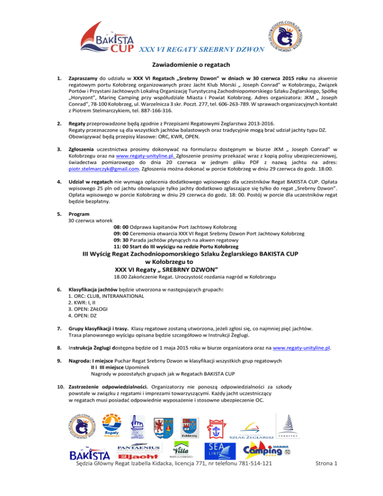 XXX VI REGATY SREBRNY DZWON Zawiadomienie o regatach 1. Zapraszamy do udziału w XXX VI Regatach „Srebrny Dzwon” w dniach w 30 czerwca 2015 roku na akwenie regatowym portu Kołobrzeg organizowanych przez Jacht Klub Morski „ Joseph Conrad” w Kołobrzegu, Związek Portów i Przystani Jachtowych Lokalną Organizację Turystyczną Zachodniopomorskiego Szlaku Żeglarskiego, Spółkę „Horyzont”, Marinę Camping przy współudziale Miasta i Powiat Kołobrzeg. Adres organizatora: JKM „ Joseph Conrad”, 78-100 Kołobrzeg, ul. Warzelnicza 3 skr. Poczt. 277, tel. 606-263-789. W sprawach organizacyjnych kontakt z Piotrem Stelmarczykiem, tel. 887-166-316. 2. Regaty przeprowadzone będą zgodnie z Przepisami Regatowymi Żeglarstwa 2013-2016. Regaty przeznaczone są dla wszystkich jachtów balastowych oraz tradycyjnie mogą brać udział jachty typu DZ. Obowiązywać będą przepisy klasowe: ORC, KWR, OPEN. 3. Zgłoszenia uczestnictwa prosimy dokonywać na formularzu dostępnym w biurze JKM „ Joseph Conrad” w Kołobrzegu oraz na www.regaty-unityline.pl. Zgłoszenie prosimy przekazać wraz z kopią polisy ubezpieczeniowej, świadectwa pomiarowego do dnia 20 czerwca w jednym pliku PDF z nazwą jachtu na adres: [email protected]. Zgłoszenia można dokonać w porcie Kołobrzeg w dniu 29 czerwca do godz. 18:00. 4. Udział w regatach nie wymaga opłacenia dodatkowego wpisowego dla uczestników Regat BAKISTA CUP. Opłata wpisowego 25 pln od jachtu obowiązuje tylko jachty dodatkowo zgłaszające się tylko do regat „Srebrny Dzwon”. Opłata wpisowego w porcie Kołobrzeg w dniu 29 czerwca do godz. 18: 00. Postój w porcie dla uczestników regat będzie bezpłatny. 5. Program 30 czerwca wtorek 08: 00 Odprawa kapitanów Port Jachtowy Kołobrzeg 09: 00 Ceremonia otwarcia XXX VI Regat Srebrny Dzwon Port Jachtowy Kołobrzeg 09: 30 Parada jachtów płynących na akwen regatowy 11: 00 Start do III wyścigu na redzie Portu Kołobrzeg III Wyścig Regat Zachodniopomorskiego Szlaku Żeglarskiego BAKISTA CUP w Kołobrzegu to XXX VI Regaty „ SREBRNY DZWON” 18.00 Zakończenie Regat. Uroczystość rozdania nagród w Kołobrzegu 6. Klasyfikacja jachtów będzie utworzona w następujących grupach: 1. ORC: CLUB, INTERANATIONAL 2. KWR: I, II 3. OPEN: ZAŁOGI 4. OPEN: DZ 7. Grupy klasyfikacji i trasy. Klasy regatowe zostaną utworzona, jeżeli zgłosi się, co najmniej pięć jachtów. Trasa planowanego wyścigu opisana będzie szczegółowo w Instrukcji Żeglugi. 8. Instrukcja Żeglugi dostępna będzie od 1 maja 2015 roku w biurze organizatora oraz na www.regaty-unityline.pl. 9. Nagroda: I miejsce Puchar Regat Srebrny Dzwon w klasyfikacji wszystkich grup regatowych II i III miejsce Upominek Nagrody w pozostałych grupach jak w Regatach BAKISTA CUP 10. Zastrzeżenie odpowiedzialności. Organizatorzy nie ponoszą odpowiedzialności za szkody powstałe w związku z regatami i imprezami towarzyszącymi. Każdy jacht uczestniczący w regatach musi posiadać odpowiednie wyposażenie i stosowne ubezpieczenie OC. Sędzia Główny Regat Izabella Kidacka, licencja 771, nr telefonu 781-514-121 Strona 1