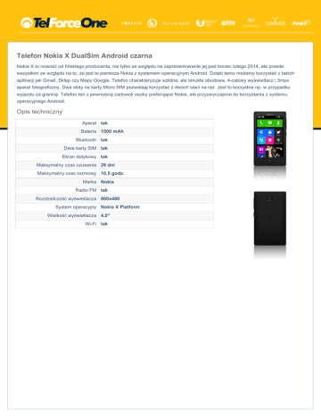 Telefon Nokia X DualSim Android czarna Nokia X to nowość od fińskiego producenta, nie tylko ze względu na zaprezentowanie jej pod koniec lutego 2014, ale przede wszystkim ze względu na to, że jest to pierwsza Nokia z systemem operacyjnym Android. Dzięki temu możemy korzystać z takich aplikacji jak Gmail, Sklep czy Mapy Google. Telefon charakteryzuje solidna, ale smukła obudowa, 4-calowy wyświetlacz i 3mpx aparat fotograficzny. Dwa sloty na karty Micro SIM pozwalają korzystać z dwóch sieci na raz. Jest to korzystne np. w przypadku wyjazdu za granicę. Telefon ten z pewnością zadowoli osoby preferujące Nokie, ale przyzwyczajone do korzystania z systemu operacyjnego Android. Opis techniczny Aparat tak Bateria 1500 mAh Bluetooth tak Dwie karty SIM tak Ekran dotykowy tak Maksymalny czas czuwania 28 dni Maksymalny czas rozmowy 10,5 godz. Marka Nokia Radio FM tak Rozdzielczość wyświetlacza 800x480 System operacyjny Nokia X Platform Wielkość wyświetlacza 4,0'' Wi-Fi tak