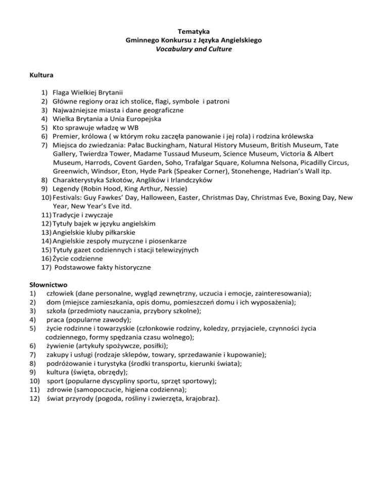 Tematyka Gminnego Konkursu z Języka Angielskiego Vocabulary and Culture Kultura 1) 2) 3) 4) 5) 6) 7) Flaga Wielkiej Brytanii Główne regiony oraz ich stolice, flagi, symbole i patroni Najważniejsze miasta i dane geograficzne Wielka Brytania a Unia Europejska Kto sprawuje władzę w WB Premier, królowa ( w którym roku zaczęła panowanie i jej rola) i rodzina królewska Miejsca do zwiedzania: Pałac Buckingham, Natural History Museum, British Museum, Tate Gallery, Twierdza Tower, Madame Tussaud Museum, Science Museum, Victoria & Albert Museum, Harrods, Covent Garden, Soho, Trafalgar Square, Kolumna Nelsona, Picadilly Circus, Greenwich, Windsor, Eton, Hyde Park (Speaker Corner), Stonehenge, Hadrian’s Wall itp. 8) Charakterystyka Szkotów, Anglików i Irlandczyków 9) Legendy (Robin Hood, King Arthur, Nessie) 10) Festivals: Guy Fawkes’ Day, Halloween, Easter, Christmas Day, Christmas Eve, Boxing Day, New Year, New Year’s Eve itd. 11) Tradycje i zwyczaje 12) Tytuły bajek w języku angielskim 13) Angielskie kluby piłkarskie 14) Angielskie zespoły muzyczne i piosenkarze 15) Tytuły gazet codziennych i stacji telewizyjnych 16) Życie codzienne 17) Podstawowe fakty historyczne Słownictwo 1) człowiek (dane personalne, wygląd zewnętrzny, uczucia i emocje, zainteresowania); 2) dom (miejsce zamieszkania, opis domu, pomieszczeń domu i ich wyposażenia); 3) szkoła (przedmioty nauczania, przybory szkolne); 4) praca (popularne zawody); 5) życie rodzinne i towarzyskie (członkowie rodziny, koledzy, przyjaciele, czynności życia codziennego, formy spędzania czasu wolnego); 6) żywienie (artykuły spożywcze, posiłki); 7) zakupy i usługi (rodzaje sklepów, towary, sprzedawanie i kupowanie); 8) podróżowanie i turystyka (środki transportu, kierunki świata); 9) kultura (święta, obrzędy); 10) sport (popularne dyscypliny sportu, sprzęt sportowy); 11) zdrowie (samopoczucie, higiena codzienna); 12) świat przyrody (pogoda, rośliny i zwierzęta, krajobraz).