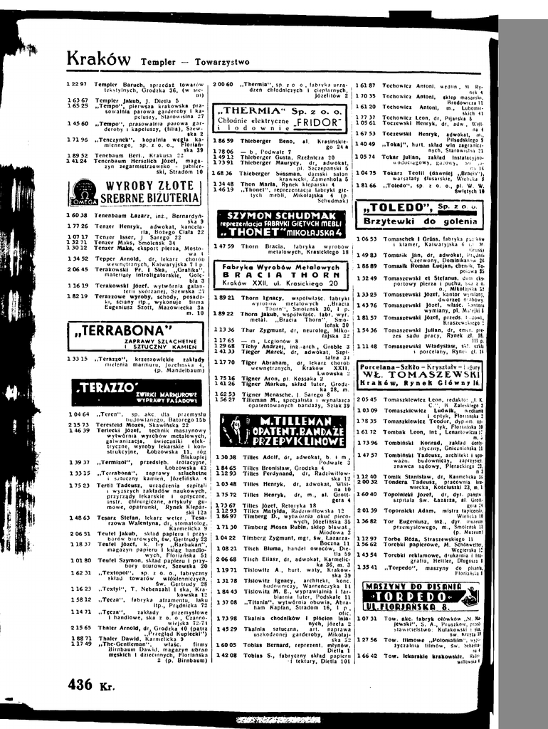Kraków 1 2 2 97 163 67 1 6 5 25 1 45 60 17196 1 89 52 14124 Templer — Towarzystwo Templer Baruch, sprzedaż towarów tekstylnych. Grodzka 26, (w sie ni) Templer Jakub, J. Dietla 5 „ T e m p o " , pierwsza krakowska prasowalnia parowa garderoby I ka peluszy. Starowiślna 27 „ T e m p o " , prasowalnia parowa gar deroby i kapeluszy, (iilia), Szew ska 2 „Tenczynek", kopalnia węgla ka miennego, sp. z o. o.. Floriań ska 39 Tenebaum Beri., Krakusa 22 Tenenbaum Herszlich Józef, maga zyn zegarmistrzowsko - Jubiler ski, Stradom 10 WYROBY ZŁOTE SREBRNE BIŻUTERIA 2 00 60 „Thermla", sp. z o o , fabryka urzą dzeń chłodniczych I cieplarńych, Józeiitöw 2 „ T H Ł R M I A " Sp. z o. o. Chłodnie elektryczne FRIDOR" i 1 od o w n i e 186 59 Thieberger " Beno. a l . Krasińskie go 24 a 1 61 87 170 35 16120 1 77 37 105 61 167 53 1 40 49 178 06 — b . , Podwale 7 10974 1 4 9 1 2 Thieberger Gusta, Rzeżnlcza 20 1 7 3 9 1 Thieberger Maurycy, d r , adwokat; p l , Szczepański 6 168 36 Thieberger Süssman, damski salon 104 75 ktawlecki, Zamenhola 5 1 3 4 48 Thon Marla, Rynek kleparskl 4 18166 1 4 6 1 9 „ T h o n e l " , reprezentacja fabryki gię tych mebli. Mikołajska 4 ( p . Schudmak) Tenenbaum Łazarz, inż.. Bernardyń ' SZYMON SCHUDMAK ska 9 fwptwientacja FflBRVKi GIĘTVCH ITtEBLI Tenzer Henryk, adwokat, kancela ria. Bożego Ciata 22 T H O N ET"miKOLfi JSKP 4 Tenzer laser, J . Sarego 22 Tenzer Maks, Smoleńsk 34 147 59 Thorn Bracia, labryka wyrobów Tenzer Maks, eksport pierza, Mosto metalowych, Krasickiego 18 wa 4 Tepper Arnold, d r , lekarz chorób wewnętrznych, Kalwaryjska 7 1 p. Fabryka Wyrobów Metalowych Terakowskl F r . i Ska, „ G r a f i k a " , materiały introligatorskie, Gołę B R A C I A T H O R N bia 3 Kroków X X I I , u l . Krasickiego 20. 1 1 6 1 9 Terakowskl Józef, wytwórnia galan terii skórzanej, Szewska 27 1 8 2 1 9 Terazzowe wyroby, schody, posadz 189 21 Thorn Ignacy, wspólwłaśc. labryki k i , ściany i t p . , wykonuje firma wyrobów metalowych „Bracia Eugeniusz Szott, Mazowiecka 84 T h o r n " , Smoleńsk 30, I p . m. 10 189 22 Thorn Jakub, wspólwłaśc. labr. wyr. metal. „Bracia Thorn", Smo leńsk 30 113 36 Thur Zygmunt, d r , neurolog. Miko I I TERRABONA' łajska 32 117 65 — m , Legionów 8 ZAPRAWY SZLACHETNE 1 29 68 Tleny Andrzej, inż.-arch., Oroble 3 I SZTUCZNY KAMIEŃ 1 4 1 3 3 Tieger Marek, d r , adwokat, SzplUlna 34 zakłady 1 3 3 1 5 „ T e r a z z o " , krzeszowickie 117 70 Tlger Abraham, d r , lekarz chorób mielenia marmuru. Józefińska 4, wewnętrznych, Kraków XXII, (p. Mandelbaum) Lwowska 1 7 5 1 6 Tigner Aron, p l . Kossaka 2 1 4 1 2 6 Tigner Markus, skład luler, Grodzka 38, m. TERAZZO: 1 6 2 5 5 Tigner Menasche, j . Sarego 8 ŻWIRKI MARMUROWE 156 27 Tllleman M . , specjalista i wynalazcą WYPRAWY FASADOWE opatentowanych bandaży, Szlak 33 Tochowlcs Antoni, wędlin.. M . Ry nek 4 Tocbowicz Antoni, sklep masarski, Brodowicza U Tochowlcc Antoni, m . , Lubomir skich 41 Tochowicz Leon, dr, Pljarska 5 Toczewskl Henryk, dr, adw., Wlśl na 4 Toczewskl Henryk, adwokat, ta., Piłsudskiego 9 „ T o k a j " , hurt. sklsd win zagranicz nych. Starowiślna 21 Tokar Julian, zakład Instalacyjnowodociągowy, gazowy, Św. Ja na IG Tokarz Teolll (dawniej „Brada"), warsztaty ślusarskie, Wielicka I „ T o l e d o " , sp. z o. o., p l . W. W. świętych I I 91 TOLEDO' Brzytewki d o golenia 1 06 53 Tomaschek I Grfiss, fabryka guzików I klamer, Kalwaryjska 6 (o. M. Grüss) 149 83 Tomasik Jan, dr, adwokat, Prądnik Czerwony, Dominikanów 26 1 8 8 89 Tomasik Roman Lucjan, chemik, Topolowa 35 1 3 2 49 Tomaszewski et Stefanus, dom eks portowy pierza I puchu, ska z o. o., Mikołajska 32 1 33 25 Tomaszewski Józef, kantor wymiany, dworzec osobowy. 143 76 Tomaszewski Józef, wlaśc. kantoru wymiany, pl. Matejki I 1 81 57 Tomaszewski Józef, przeds. budowl, Kraszewskiego : 1 5 4 36 Tomaszewski Julian, dr, emer. pre zes sądu pracy, Rynek gl. 16, 11148 III p. Tomaszewski Władysław, skl. szklą i porcelany, Rynek gl, l( Porcelana—StKło — Kryształyj - F- i g u r y WŁ. TOMASZEW WSRI ' K r a H ó w . R y n e K G I ó w n y 16, s 1 0 4 64 2 15 75 1 4 6 39 139 37 13315 1 7 5 23 148 63 2 06 51 1 1 8 37 10180 1 6 2 31 1 1 6 23 15812 1 1 4 71 2 1 5 65 18871 117 49 „Teren", sp. akc. dla przemysłu budowlanego, Batorego 15b Teresfeld Mozes, Skawińska 2 2 Terlecki Jozef, technik maszynowy \I wytwórnia wyrobów metalowych, galwanizacja, świeczniki elek tryczne, wyroby lekarskie i kon strukcyjne, Łobzowska 1 1 , róg Biskupiej 130 38 „Termlzol", przedsięb. Izolacyjne, Łobzowska 43 1 84 65 „Terrabona", zaprawy szlachetne 112 93 i sztuczny kamień, józefińska 4 103 48 Tertil Tadeusz, urzqdzenia szpitali i wyższych zakładów naukowych, 175 72 przyrządy lekarskie i optyczne, instr. Chirurgiczne, artykuły gu mowe, opatrunki. Rynek Klepar 173 67 skl 12a | 1 1 2 9 3 1 86 97 Tesarz Stefan, lekarz weter., Tesarzowa Walentyna, dr, stomatolog, Karmelicka 9 | 1 7 1 3 0 Teufel Jakub, skład papieru I przy borów biurowych, św. Gertrudy 23 104 22 Teufel Józef, k . l-y „Barbakan", 108 21 magazyn papieru i ksiąg tiandlowych, Floriańska 61 2 06 68 Teulel Szymon, skład papieru i przy bory biurowe, Szewska 20 1 1 971 „Textopol", sp. z o. o., Iabryczny skład towarów włókienniczych, 1 3 178 Św. Gertrudy 28 „ T e x t y l " , T . Nebenzahl I ska. Kra 184 43 kowska 12 „ T ę c z a " , fabryka atramentu, laku 137 08 Itp., Prądnicka 72 „Tęcza", zakłady przemysłowe i handlowe, ska z o. o . . Czarno 173 98 wiejska 72/74 Thalcr Arnold, dr. Grodzka 40 (patrz „Przegląd Kupiecki") Thaler Dawid, Karmelicka 9 „The-Gentleman", właśc. firmy Birnbaum Dawid, magazyn ubrań męskich I dziecinnych, Floriańska 2 ( p . Birnbaum) 436 Kr. M.Tl L LEM AH KOPA! OPATIHT.BAHDAŻE PßZEPVKLINOWE 2 05 45 Tomaszkiewicz Leon, redaktor „I. K. 103 09 Tomaszkiewicz C". B. Zaleskiego 1 16172 Ludwik, mechanik I optyk, Floriańska 1 Tomaszkiewicz Teodor, dyplo