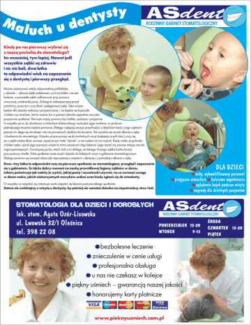 Ma luch y t s y t n e d u ASdent Kiedy po raz pierwszy wybrać się z naszą pociechą do stomatologa? Im wcześniej, tym lepiej. Nawet jeśli wszystkie ząbki są zdrowie i nic nie boli, dwa latka to odpowiedni wiek na zapoznanie się z dentystą i pierwszy przegląd. Można zastosować wtedy odpowiednią profilaktykę u dziecka – zdrowe ząbki zalakować, co trwa krótko i nie jest bolesne, a pozostałe ząbki zafluorować przy pomocy owocowej, smakowitej pasty. Zabiegi te zabezpieczają przed próchnicą, poza tym uczą dbać i pielęgnować zęby. Taka wizyta będzie dla dziecka radością i przyjemnością, i nie będzie się kojarzyła z bólem czy strachem. Jest to ważne, bo w pamięci dziecka zapadnie ona jako pozytywne spotkanie. Pierwsze wizyty powinny być krótkie, spokojne i przyjemne. A wszystko po to, by zbudować z maluchem dobrą relację i wzbudzić jego zaufanie, co podczas późniejszego leczenia będzie pomocne. Dlatego najlepiej zacząć przychodzić z dzieckiem kiedy z jego ząbkami jeszcze nic złego się nie dzieje i nie ma poważnych ubytków do leczenia. Tak wyrabia się nawyk dbania o zęby i chodzenia do stomatologa. Dziecko przyzwyczaja się do kontrolnych wizyt (najlepiej co pół roku) i uczy się, że o ząbki trzeba dbać zawsze. Lepiej leczyć małe “dziurki”, a nie czekać aż coś rozboli. Kiedy malec przychodzi z bólem zęba i jest to jego pierwsza wizyta to mimo szczerych chęci lekarza i jego starań nie zawsze należy ona do najprzyjemniejszych. Towarzyszą jej łzy, strach, ból, a to dlatego, że takiego chorego ząbka trzeba leczyć przy pomocy wiertła. Takie spotkanie może zrazić dziecko do kolejnych wizyt w gabinecie stomatologicznym. Dlatego powinno się oswajać dzieci jak najwcześniej z wizytami u dentysty i z potrzebą o dbania o zęby. Dwa– trzy latka to odpowiedni czas na pierwsze spotkanie ze stomatologiem, przegląd i zapoznanie się z gabinetem. To także dobry moment na naukę prawidłowej higieny ząbków w domu. Lekarz poinstruuje jak należy je czyścić, jakiej pasty i szczoteczki używać, na co zwracać uwagę w diecie malca, jakich niekorzystnych nawyków unikać oraz kiedy zgłosić się do ortodonty. DLA DZIECI l mi³y, wykwalifikowany personel l przyjazna atmosfera l kolorowe wype³nienia l ogl¹danie bajek podczas wizyty l nagrody dla dzielnych pacjentów O wszystko co niepokoi czy interesuje warto zapytać się lekarza podczas takiego spotkania. Zatem nie zwlekajmy z wizytą u dentysty, by później nie narażać dziecka na niepotrzebny stres i ból. STOMATOLOGIA DLA DZIECI I DOROS£YCH lek. stom. Agata Ozór-Lisowska ul. Lwowska 32/1 Olenica tel. 398 22 08 ASdent PONIEDZIA£EK 13-20 WTOREK 9-13 l bezbolesne leczenie l znieczulenie w cenie usługi l profesjonalna obsługa l u nas nie czekasz w kolejce l piękny uśmiech – gwarancją naszej jakości l honorujemy karty platnicze www.pieknyusmiech.com.pl RODA CZWARTEK 13-20 PI¥TEK