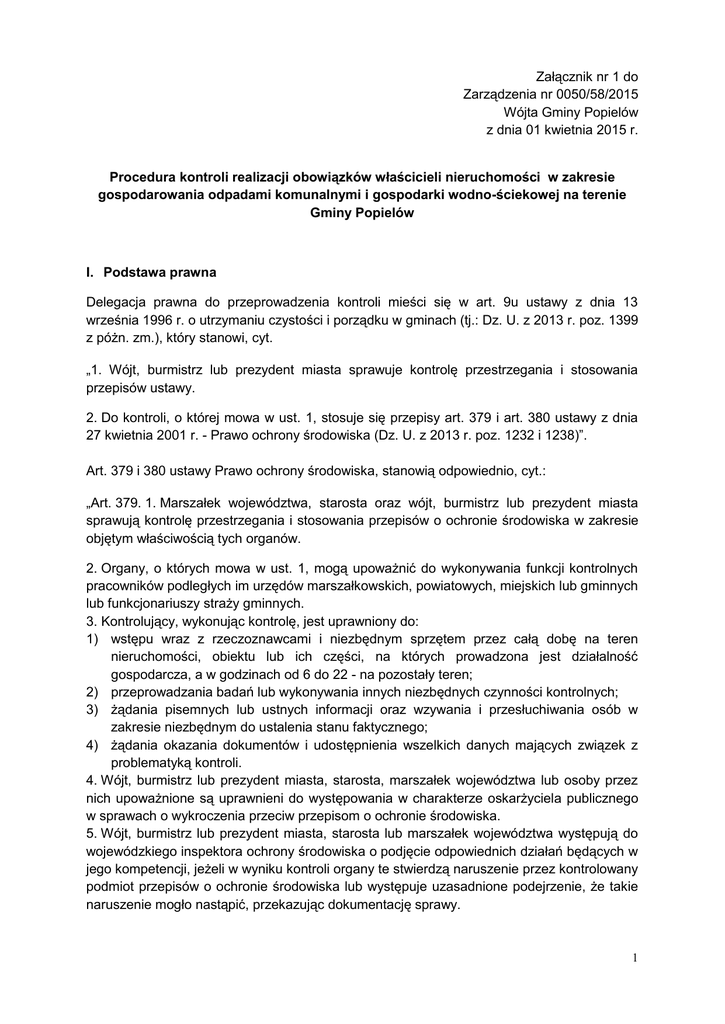 Załącznik nr 1 do Zarządzenia nr 0050/58/2015 Wójta Gminy Popielów z dnia 01 kwietnia 2015 r. Procedura kontroli realizacji obowiązków właścicieli nieruchomości w zakresie gospodarowania odpadami komunalnymi i gospodarki wodno-ściekowej na terenie Gminy Popielów I. Podstawa prawna Delegacja prawna do przeprowadzenia kontroli mieści się w art. 9u ustawy z dnia 13 września 1996 r. o utrzymaniu czystości i porządku w gminach (tj.: Dz. U. z 2013 r. poz. 1399 z póżn. zm.), który stanowi, cyt. „1. Wójt, burmistrz lub prezydent miasta sprawuje kontrolę przestrzegania i stosowania przepisów ustawy. 2. Do kontroli, o której mowa w ust. 1, stosuje się przepisy art. 379 i art. 380 ustawy z dnia 27 kwietnia 2001 r. - Prawo ochrony środowiska (Dz. U. z 2013 r. poz. 1232 i 1238)”. Art. 379 i 380 ustawy Prawo ochrony środowiska, stanowią odpowiednio, cyt.: „Art. 379. 1. Marszałek województwa, starosta oraz wójt, burmistrz lub prezydent miasta sprawują kontrolę przestrzegania i stosowania przepisów o ochronie środowiska w zakresie objętym właściwością tych organów. 2. Organy, o których mowa w ust. 1, mogą upoważnić do wykonywania funkcji kontrolnych pracowników podległych im urzędów marszałkowskich, powiatowych, miejskich lub gminnych lub funkcjonariuszy straży gminnych. 3. Kontrolujący, wykonując kontrolę, jest uprawniony do: 1) wstępu wraz z rzeczoznawcami i niezbędnym sprzętem przez całą dobę na teren nieruchomości, obiektu lub ich części, na których prowadzona jest działalność gospodarcza, a w godzinach od 6 do 22 - na pozostały teren; 2) przeprowadzania badań lub wykonywania innych niezbędnych czynności kontrolnych; 3) żądania pisemnych lub ustnych informacji oraz wzywania i przesłuchiwania osób w zakresie niezbędnym do ustalenia stanu faktycznego; 4) żądania okazania dokumentów i udostępnienia wszelkich danych mających związek z problematyką kontroli. 4. Wójt, burmistrz lub prezydent miasta, starosta, marszałek województwa lub osoby przez nich upoważnione są uprawnieni do występowania w charakterze oskarżyciela publicznego w sprawach o wykroczenia przeciw przepisom o ochronie środowiska. 5. Wójt, burmistrz lub prezydent miasta, starosta lub marszałek województwa występują do wojewódzkiego inspektora ochrony środowiska o podjęcie odpowiednich działań będących w jego kompetencji, jeżeli w wyniku kontroli organy te stwierdzą naruszenie przez kontrolowany podmiot przepisów o ochronie środowiska lub występuje uzasadnione podejrzenie, że takie naruszenie mogło nastąpić, przekazując dokumentację sprawy. 1 6. Kierownik kontrolowanego podmiotu oraz kontrolowana osoba fizyczna obowiązani są umożliwić przeprowadzanie kontroli, a w szczególności dokonanie czynności, o których mowa w ust. 3. Art. 380. 1. Z czynności kontrolnych kontrolujący sporządza protokół, którego jeden egzemplarz doręcza kierownikowi kontrolowanego podmiotu lub kontrolowanej osobie fizycznej. 2. Protokół podpisują kontrolujący oraz kierownik kontrolowanego podmiotu lub kontrolowana osoba fizyczna, którzy mogą wnieść do protokołu zastrzeżenia i uwagi wraz z uzasadnieniem. 3. W razie odmowy podpisania protokołu przez kierownika kontrolowanego podmiotu lub kontrolowaną osobę fizyczną kontrolujący umieszcza o tym wzmiankę w protokole, a odmawiający podpisu może, w terminie 7 dni, przedstawić swoje stanowisko na piśmie wójtowi, burmistrzowi lub prezydentowi miasta, staroście lub marszałkowi województwa.” Do właścicieli nieruchomości będących przedsiębiorcami (np. spółdzielnie mieszkaniowe, osoby fizyczne prowadzące działalność gospodarczą) zastosowanie mają przepisy rozdziału 5 ustawy z dnia 2 lipca 2004 r. o swobodzie działalności gospodarczej (tj.: Dz. U. z 20133 r. poz. 672 z późn. zm.) pt. „Kontrola działalności gospodarczej przedsiębiorcy”. Ponadto procedura postępowania kontrolnego realizowana jest na podstawie uchwały nr XXXV/240/2014 Rady Gminy Popielów z dnia 5 marca 2014 r. w sprawie Regulaminu utrzymania czystości i porządku na terenie Gminy Popielów (Dz. Urz. Woj. Opolskiego z dnia 13 marca 2014 r. poz. 748), ustawy z dnia 14 grudnia 2012 r. o odpadach (Dz. U. z 2013 r. poz. 21 z późn. zm.), ustawy z dnia 7 czerwca 2001 r. o zbiorowym zaopatrzeniu w wodę i zbiorowym odprowadzaniu ścieków (tj. Dz. U. z 2006 r., Nr 123, poz. 858 z późn. zm.). W przypadku gdy przeprowadzenie kontroli wymaga obecności przedstawicieli policji, wójt może wystąpić z wnioskiem do właściwego komendanta Policji o pomoc, jeżeli jest to niezbędne do przeprowadzenia czynności kontrolnych. Na wniosek wójta właściwy miejscowo komendant Policji jest obowiązany do zapewnienia kontrolującym pomocy policji w toku wykonywania czynności kontrolnych. II. Cel Celem procedury jest zapewnienie systematycznego i obiektywnego sprawdzania zgodności i skuteczności realizacji przez właścicieli nieruchomości obowiązków i wymagań wynikających z ustawy o utrzymaniu czystości i porządku w gminach oraz regulaminu utrzymania czystości i porządku na terenie Gminy Popielów. III. Organ uprawniony do przeprowadzenia kontroli Organem uprawnionym do kontroli przestrzegania i stosowania przepisów ustawy o utrzymaniu czystości i porządku w gminach na terenie Gminy Popielów jest Wójt Gminy Popielów. 2 IV. Kontrolujący pracownicy Wójt Gminy Popielów jako organ kontrolny upoważnia do przeprowadzenia kontroli podległych mu pracowników Urzędu. Pracownicy przeprowadzają kontrole na podstawie stosownych upoważnień. Upoważnienia mogą mieć charakter generalny (ogólny) w przypadku kontroli osób fizycznych lub szczegółowy w przypadku dokonywania kontroli u właścicieli nieruchomości będących przedsiębiorcami (wydawane odrębnie dla każdej kontroli z określeniem zakresu przedmiotowego). V. Podmioty kontrolowane W zakresie gospodarowania odpadami ko