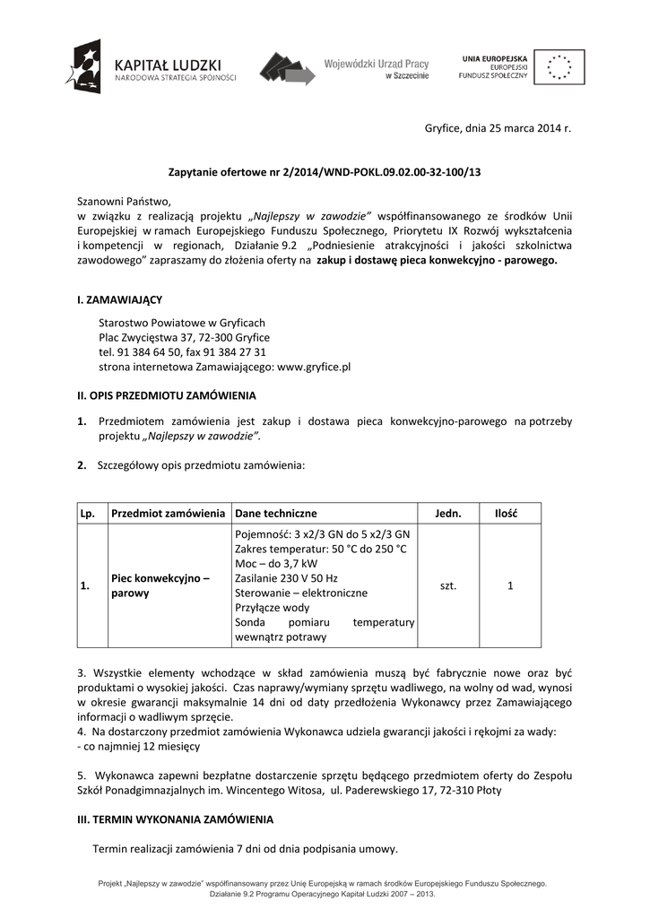 Gryfice, dnia 25 marca 2014 r. Zapytanie ofertowe nr 2/2014/WND-POKL.09.02.00-32-100/13 Szanowni Państwo, w związku z realizacją projektu „Najlepszy w zawodzie” współfinansowanego ze środków Unii Europejskiej w ramach Europejskiego Funduszu Społecznego, Priorytetu IX Rozwój wykształcenia i kompetencji w regionach, Działanie 9.2 „Podniesienie atrakcyjności i jakości szkolnictwa zawodowego” zapraszamy do złożenia oferty na zakup i dostawę pieca konwekcyjno - parowego. I. ZAMAWIAJĄCY Starostwo Powiatowe w Gryficach Plac Zwycięstwa 37, 72-300 Gryfice tel. 91 384 64 50, fax 91 384 27 31 strona internetowa Zamawiającego: www.gryfice.pl II. OPIS PRZEDMIOTU ZAMÓWIENIA 1. Przedmiotem zamówienia jest zakup i dostawa pieca konwekcyjno-parowego na potrzeby projektu „Najlepszy w zawodzie”. 2. Szczegółowy opis przedmiotu zamówienia: Lp. 1. Przedmiot zamówienia Dane techniczne Piec konwekcyjno – parowy Pojemność: 3 x2/3 GN do 5 x2/3 GN Zakres temperatur: 50 °C do 250 °C Moc – do 3,7 kW Zasilanie 230 V 50 Hz Sterowanie – elektroniczne Przyłącze wody Sonda pomiaru temperatury wewnątrz potrawy Jedn. szt. Ilość 1 3. Wszystkie elementy wchodzące w skład zamówienia muszą być fabrycznie nowe oraz być produktami o wysokiej jakości. Czas naprawy/wymiany sprzętu wadliwego, na wolny od wad, wynosi w okresie gwarancji maksymalnie 14 dni od daty przedłożenia Wykonawcy przez Zamawiającego informacji o wadliwym sprzęcie. 4. Na dostarczony przedmiot zamówienia Wykonawca udziela gwarancji jakości i rękojmi za wady: - co najmniej 12 miesięcy 5. Wykonawca zapewni bezpłatne dostarczenie sprzętu będącego przedmiotem oferty do Zespołu Szkół Ponadgimnazjalnych im. Wincentego Witosa, ul. Paderewskiego 17, 72-310 Płoty III. TERMIN WYKONANIA ZAMÓWIENIA Termin realizacji zamówienia 7 dni od dnia podpisania umowy. Projekt „Najlepszy w zawodzie” współfinansowany przez Unię Europejską w ramach środków Europejskiego Funduszu Społecznego. Działanie 9.2 Programu Operacyjnego Kapitał Ludzki 2007 – 2013. IV. MIEJSCE ORAZ TERMIN SKŁADANIA OFERT 1. 2. 3. 4. 5. 6. 7. 8. Oferta powinna być sporządzona na formularzu ofertowym, który stanowi załącznik nr 1 do niniejszego zapytania. Ofertę należy przesłać do 09 kwietnia 2014 r. do godz. 12.00 za pośrednictwem poczty elektronicznej na adres: [email protected] Osoba uprawniona do kontaktów: Ewelina Szydlik, tel.: 91 384 64 50 wew. 429, e-mail: [email protected] Oferent może przed upływem terminu składania ofert zmienić lub wycofać swoją ofertę. Wszelkie koszty związane ze złożeniem oferty ponosi oferent. Treść oferty winna odpowiadać treści niniejszego Zapytania. W toku badania i oceny ofert Zamawiający może żądać od oferentów wyjaśnień dotyczących treści złożonych ofert. Zamawiający nie dopuszcza możliwości składania ofert częściowych. V. OCENA OFERT Zamawiający dokona oceny ważnych ofert na podstawie następujących kryteriów: 1 – cena brutto 100% VI. ROZSTRZYGNIĘCIE POSTĘPOWANIA I ZLECENIE REALIZACJI ZAMÓWIENIA Postępowanie ofertowe zostanie rozstrzygnięte do dnia 11 kwietnia 2014 r. do godziny 12.00. O wynikach postępowania jego uczestnicy zostaną poinformowani drogą mailową najpóźniej w dniu 14 kwietnia 2014 r. do godziny 10.00. W tym samym terminie do podmiotu wybranego w wyniku rozstrzygnięcia postępowania zostanie skierowane zlecenie realizacji zamówienia z dodatkowymi informacjami wskazanymi w treści niniejszego zapytania. VII. UNIEWAŻNIENIE ZAPYTANIA OFERTOWEGO Zapytanie ofertowe zostanie unieważnione jeżeli: 1. nie zostanie złożona co najmniej jedna oferta nie podlegająca odrzuceniu 2. cena najkorzystniejsza (na podstawie kryterium oceny ofert) oferty będzie wyższa niż kwota, jaką Zamawiający może przeznaczyć na sfinansowanie usługi. STAROSTA Kazimierz Sać Projekt „Najlepszy w zawodzie” współfinansowany przez Unię Europejską w ramach środków Europejskiego Funduszu Społecznego. Działanie 9.2 Programu Operacyjnego Kapitał Ludzki 2007 – 2013. Załącznik nr 1 do zapytania ofertowego Nr 2/2014/ WND-POKL.09.02.00-32-100/13 OFERTA Ja/My niżej podpisani: ……………………………………………………………………………………………………………………………………………………..…….. …………………………………………………………………………………………………………………………………………………………… z siedzibą: ………………………………………………………………………………………………………………………………………….. …………………………………………………………………………………………………………………………………………………………… NIP: …………………………………….……….. REGON: ……………………………………………. odpowiadając na Zapytanie ofertowe nr 2/2014/WND-POKL.09.02.00-32-100/13 dotyczące wyboru Wykonawcy na zakup i dostawę pieca konwekcyjno-parowego w ramach projektu „Najlepszy w zawodzie”, zgodnie z wymaganiami określonymi w Zapytaniu ofertowym oferujemy realizację przedmiotu zamówienia za cenę: Lp. Nazwa przedmiotu zamówienia Jedn. Ilość szt. 1 Cena jednostkowa Cena brutto Piec konwekcyjno-parowy 1. …………………………………………………………….. marka typ Wartość oferty wynosi: …………………………………….. zł (słownie: ………………………………………………………………………………………… zł) Termin realizacji zamówienia: …………………………………………… ……………………………………………………………… miejscowość i data ………………………………………………………… pieczęć i podpis Wykon
