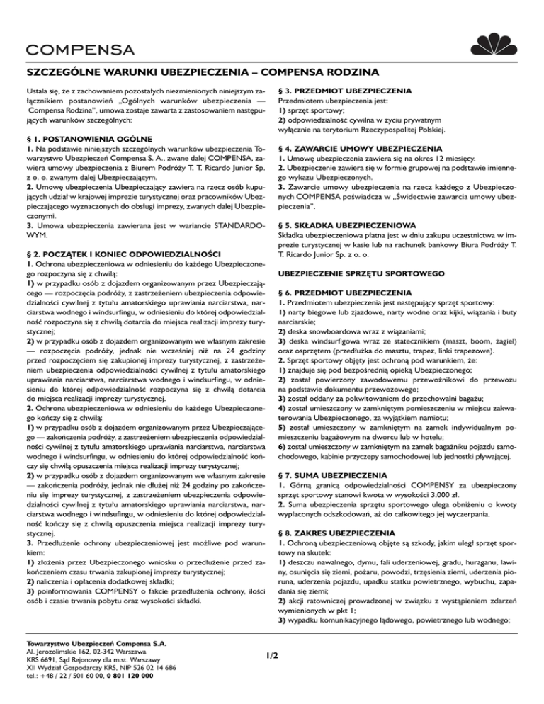 SZCZEGÓLNE WARUNKI UBEZPIECZENIA – COMPENSA RODZINA Ustala si´, ˝e z zachowaniem pozosta∏ych niezmienionych niniejszym za∏àcznikiem postanowieƒ „Ogólnych warunków ubezpieczenia — Compensa Rodzina”, umowa zostaje zawarta z zastosowaniem nast´pujàcych warunków szczególnych: § 3. PRZEDMIOT UBEZPIECZENIA Przedmiotem ubezpieczenia jest: 1) sprz´t sportowy; 2) odpowiedzialnoÊç cywilna w ˝yciu prywatnym wy∏àcznie na terytorium Rzeczypospolitej Polskiej. § 1. POSTANOWIENIA OGÓLNE 1. Na podstawie niniejszych szczególnych warunków ubezpieczenia Towarzystwo Ubezpieczeƒ Compensa S. A., zwane dalej COMPENSA, zawiera umowy ubezpieczenia z Biurem Podró˝y T. T. Ricardo Junior Sp. z o. o. zwanym dalej Ubezpieczajàcym. 2. Umow´ ubezpieczenia Ubezpieczajàcy zawiera na rzecz osób kupujàcych udzia∏ w krajowej imprezie turystycznej oraz pracowników Ubezpieczajàcego wyznaczonych do obs∏ugi imprezy, zwanych dalej Ubezpieczonymi. 3. Umowa ubezpieczenia zawierana jest w wariancie STANDARDOWYM. § 4. ZAWARCIE UMOWY UBEZPIECZENIA 1. Umow´ ubezpieczenia zawiera si´ na okres 12 miesi´cy. 2. Ubezpieczenie zawiera si´ w formie grupowej na podstawie imiennego wykazu Ubezpieczonych. 3. Zawarcie umowy ubezpieczenia na rzecz ka˝dego z Ubezpieczonych COMPENSA poÊwiadcza w „Âwidectwie zawarcia umowy ubezpieczenia”. § 5. SK¸ADKA UBEZPIECZENIOWA Sk∏adka ubezpieczeniowa p∏atna jest w dniu zakupu uczestnictwa w imprezie turystycznej w kasie lub na rachunek bankowy Biura Podró˝y T. T. Ricardo Junior Sp. z o. o. § 2. POCZÑTEK I KONIEC ODPOWIEDZIALNOÂCI 1. Ochrona ubezpieczeniowa w odniesieniu do ka˝dego Ubezpieczonego rozpoczyna si´ z chwilà: 1) w przypadku osób z dojazdem organizowanym przez Ubezpieczajàcego — rozpocz´cia podró˝y, z zastrze˝eniem ubezpieczenia odpowiedzialnoÊci cywilnej z tytu∏u amatorskiego uprawiania narciarstwa, narciarstwa wodnego i windsurfingu, w odniesieniu do której odpowiedzialnoÊç rozpoczyna si´ z chwilà dotarcia do miejsca realizacji imprezy turystycznej; 2) w przypadku osób z dojazdem organizowanym we w∏asnym zakresie — rozpocz´cia podró˝y, jednak nie wczeÊniej ni˝ na 24 godziny przed rozpocz´ciem si´ zakupionej imprezy turystycznej, z zastrze˝eniem ubezpieczenia odpowiedzialnoÊci cywilnej z tytu∏u amatorskiego uprawiania narciarstwa, narciarstwa wodnego i windsurfingu, w odniesieniu do której odpowiedzialnoÊç rozpoczyna si´ z chwilà dotarcia do miejsca realizacji imprezy turystycznej. 2. Ochrona ubezpieczeniowa w odniesieniu do ka˝dego Ubezpieczonego koƒczy si´ z chwilà: 1) w przypadku osób z dojazdem organizowanym przez Ubezpieczajàcego — zakoƒczenia podró˝y, z zastrze˝eniem ubezpieczenia odpowiedzialnoÊci cywilnej z tytu∏u amatorskiego uprawiania narciarstwa, narciarstwa wodnego i windsurfingu, w odniesieniu do której odpowiedzialnoÊç koƒczy si´ chwilà opuszczenia miejsca realizacji imprezy turystycznej; 2) w przypadku osób z dojazdem organizowanym we w∏asnym zakresie — zakoƒczenia podró˝y, jednak nie d∏u˝ej ni˝ 24 godziny po zakoƒczeniu si´ imprezy turystycznej, z zastrze˝eniem ubezpieczenia odpowiedzialnoÊci cywilnej z tytu∏u amatorskiego uprawiania narciarstwa, narciarstwa wodnego i windsufingu, w odniesieniu do której odpowiedzialnoÊç koƒczy si´ z chwilà opuszczenia miejsca realizacji imprezy turystycznej. 3. Przed∏u˝enie ochrony ubezpieczeniowej jest mo˝liwe pod warunkiem: 1) z∏o˝enia przez Ubezpieczonego wniosku o przed∏u˝enie przed zakoƒczeniem czasu trwania zakupionej imprezy turystycznej; 2) naliczenia i op∏acenia dodatkowej sk∏adki; 3) poinformowania COMPENSY o fakcie przed∏u˝enia ochrony, iloÊci osób i czasie trwania pobytu oraz wysokoÊci sk∏adki. Towarzystwo Ubezpieczeƒ Compensa S.A. Al. Jerozolimskie 162, 02-342 Warszawa KRS 6691, Sàd Rejonowy dla m.st. Warszawy XII Wydzia∏ Gospodarczy KRS, NIP 526 02 14 686 tel.: +48 / 22 / 501 60 00, 0 801 120 000 UBEZPIECZENIE SPRZ¢TU SPORTOWEGO § 6. PRZEDMIOT UBEZPIECZENIA 1. Przedmiotem ubezpieczenia jest nast´pujàcy sprz´t sportowy: 1) narty biegowe lub zjazdowe, narty wodne oraz kijki, wiàzania i buty narciarskie; 2) deska snowboardowa wraz z wiàzaniami; 3) deska windsurfigowa wraz ze statecznikiem (maszt, boom, ˝agiel) oraz osprz´tem (przed∏u˝ka do masztu, trapez, linki trapezowe). 2. Sprz´t sportowy obj´ty jest ochronà pod warunkiem, ˝e: 1) znajduje si´ pod bezpoÊrednià opiekà Ubezpieczonego; 2) zosta∏ powierzony zawodowemu przewoênikowi do przewozu na podstawie dokumentu przewozowego; 3) zosta∏ oddany za pokwitowaniem do przechowalni baga˝u; 4) zosta∏ umieszczony w zamkni´tym pomieszczeniu w miejscu zakwaterowania Ubezpieczonego, za wyjàtkiem namiotu; 5) zosta∏ umieszczony w zamkni´tym na zamek indywidualnym pomieszczeniu baga˝owym na dworcu lub w hotelu; 6) zosta∏ umieszczony w zamkni´tym na zamek baga˝niku pojazdu samochodowego, kabinie przyczepy samochodowej lub jednostki p∏ywajàcej. § 7. SUMA UBEZPIECZENIA 1. Górnà granicà odpowiedzialnoÊci COMPENSY za ubezpieczony sprz´t sportowy stanowi kwota w wysokoÊci 3.000 z∏. 2. Suma ubezpieczenia sprz´tu sportowego ulega obni˝eniu o kwoty wyp∏aconych odszkodowaƒ, a˝ do ca∏kowitego jej wyczerpania. § 8. ZAKRES UBEZPIECZENIA 1. Ochronà ubezpieczeniowà obj´te sà szkody, jakim uleg∏ sprz´t sportowy na skutek: 1) deszczu nawalnego, dymu, fali uderzeniowej, gradu, huraganu, lawiny, osuni´cia si´ ziemi, po˝aru, powodzi, trz´sienia ziemi, uderzenia pioruna, uderzenia pojazdu, upadku statku powietrznego, wybuchu, zapadania si´ ziemi; 2) akcji ratowniczej prowadzonej w zwiàzku z wystàpieniem zdarzeƒ wymienionych w pkt 1; 3) wypadku komunikacyjnego làdowego, powietrznego lub wodnego; 1/2 4) nieszcz´Êliwego wypadku lub nag∏ego zachorowania, jakiemu uleg∏ Ubezpieczony, w wyniku którego Ubezpieczony pozbawiony by∏ mo˝liwoÊci zaopiekowania si´ spr