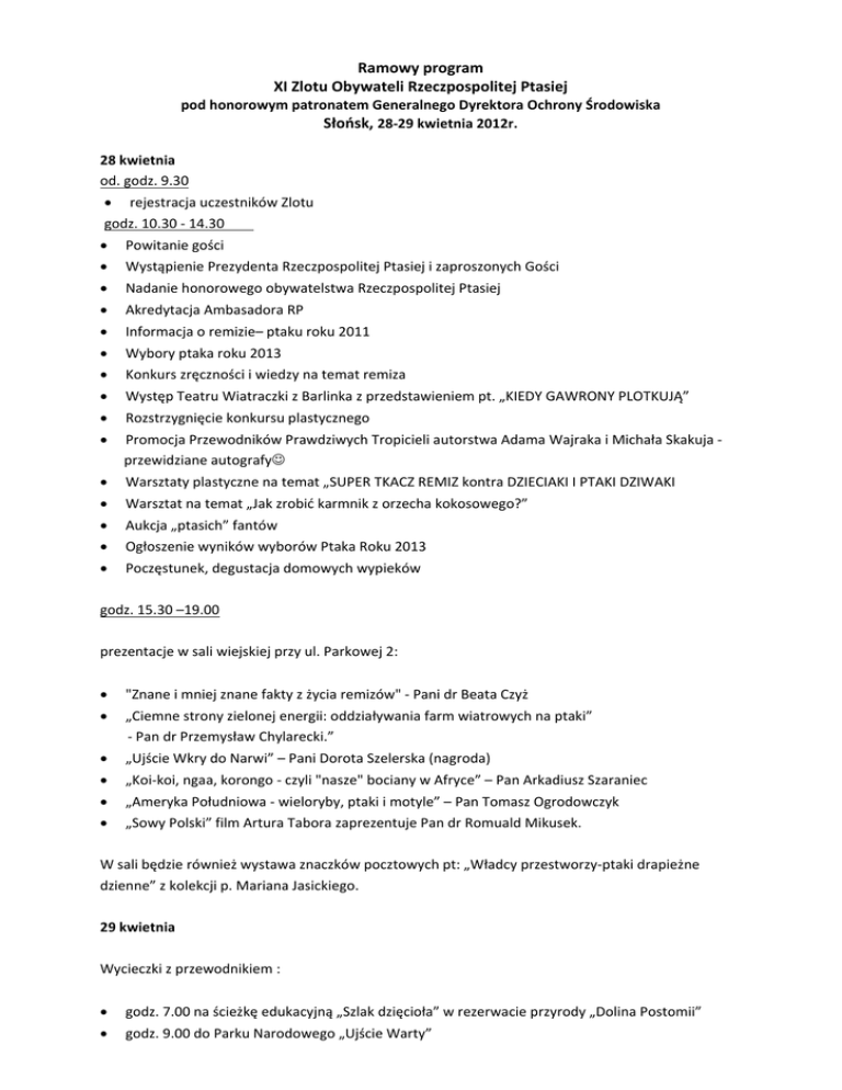 Ramowy program XI Zlotu Obywateli Rzeczpospolitej Ptasiej pod honorowym patronatem Generalnego Dyrektora Ochrony Środowiska Słońsk, 28‐29 kwietnia 2012r. 28 kwietnia od. godz. 9.30 • rejestracja uczestników Zlotu godz. 10.30 ‐ 14.30 • Powitanie gości • Wystąpienie Prezydenta Rzeczpospolitej Ptasiej i zaproszonych Gości • Nadanie honorowego obywatelstwa Rzeczpospolitej Ptasiej • Akredytacja Ambasadora RP • Informacja o remizie– ptaku roku 2011 • Wybory ptaka roku 2013 • Konkurs zręczności i wiedzy na temat remiza • Występ Teatru Wiatraczki z Barlinka z przedstawieniem pt. „KIEDY GAWRONY PLOTKUJĄ” • Rozstrzygnięcie konkursu plastycznego • Promocja Przewodników Prawdziwych Tropicieli autorstwa Adama Wajraka i Michała Skakuja ‐ przewidziane autografy☺ • Warsztaty plastyczne na temat „SUPER TKACZ REMIZ kontra DZIECIAKI I PTAKI DZIWAKI • Warsztat na temat „Jak zrobić karmnik z orzecha kokosowego?” • Aukcja „ptasich” fantów • Ogłoszenie wyników wyborów Ptaka Roku 2013 • Poczęstunek, degustacja domowych wypieków godz. 15.30 –19.00 prezentacje w sali wiejskiej przy ul. Parkowej 2: • "Znane i mniej znane fakty z życia remizów" ‐ Pani dr Beata Czyż • „Ciemne strony zielonej energii: oddziaływania farm wiatrowych na ptaki” ‐ Pan dr Przemysław Chylarecki.” • „Ujście Wkry do Narwi” – Pani Dorota Szelerska (nagroda) • „Koi‐koi, ngaa, korongo ‐ czyli "nasze" bociany w Afryce” – Pan Arkadiusz Szaraniec • „Ameryka Południowa ‐ wieloryby, ptaki i motyle” – Pan Tomasz Ogrodowczyk • „Sowy Polski” film Artura Tabora zaprezentuje Pan dr Romuald Mikusek. W sali będzie również wystawa znaczków pocztowych pt: „Władcy przestworzy‐ptaki drapieżne dzienne” z kolekcji p. Mariana Jasickiego. 29 kwietnia Wycieczki z przewodnikiem : • godz. 7.00 na ścieżkę edukacyjną „Szlak dzięcioła” w rezerwacie przyrody „Dolina Postomii” • godz. 9.00 do Parku Narodowego „Ujście Warty” Zlotowi będą towarzyszyć stoiska, m.in. Parku Narodowego „Ujście Warty”, stowarzyszenia „Ptaki Polskie”, Ośrodka Rozwojowo‐Wdrożeniowego Lasów Państwowych w Bedoniu i Nadleśnictwa Ośno Lubuskie oraz czasopism Ptaki Polski i Fotonatura. Tradycyjnie nagrodami w konkursach będą m.in. książki, programy edukacyjne i filmy przyrodnicze, płyty z nagraniami głosów ptaków, noclegi i spływ kajakowy ufundowane przez miejscowych obywateli Rzeczpospolitej Ptasiej i usługodawców. W ramach wpisowego (40 zł –osoba dorosła, 15 zł –dziecko/uczeń) każdy uczestnik otrzyma zlotową pamiątkę, monetę, torbę z Rzeczpospolitej Ptasiej i poczęstunek oraz będzie mógł wziąć udział w prelekcjach w sali wiejskiej i wycieczkach. Czekamy na zgłoszenia do 16 kwietnia 2012 mailem tps@tps‐unitisviribus.org.pl . Wpisowe należy wpłacać na konto: 29 8355 0009 0035 0411 2000 0001. O miejscu, w którym odbędzie się Zlot powiadomimy w późniejszym terminie, będzie to albo Plac Zamkowy, albo park w Słońsku.
