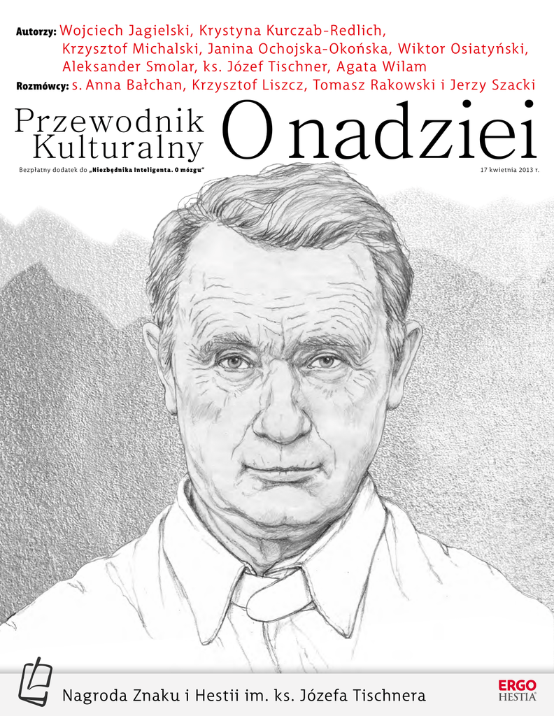 Autorzy: Wojciech Jagielski, Krysty na Kurczab-Redlich, Krzysztof Michalski, Janina Ochojska-Okońska, Wiktor Osiaty ński, Aleksander Smolar, ks. Józef Tischner, Agata Wilam Rozmówcy: s. Anna Bałchan, Krzysztof Liszcz, Tomasz Rakowski i Jerzy Szacki Przewodnik Kulturalny Bez płat ny dodatek do „Niezbędnika Inteligenta. O mózgu” O nadziei Nagroda Znaku i Hestii im. ks. Józefa Tischnera 17 kwiet nia 2013 r. „ Losem człowieka jest: dać się pokonać nadziei. Ginie ten, kto przestaje jej ulegać. ks. Józef Tischner Od 12 lat fundator Nagrody Znaku i Hestii im. ks. Józefa Tischnera 13. Dni Tischnerowskie / Kraków, 24–27 kwietnia 2013 pod patronatem Jego Ekscelencji ks. Kardynała Stanisława Dziwisza P R O G R A M 1 3 . D N I T I S C H N E R O W S I C H środa, 24 kwietnia piątek, 26 kwietnia godz. 17.00 Kolegiata św. Anny, ul. św. Anny 11 godz. 11.00 Aula Collegium Novum UJ, ul. Gołębia 24 Msza święta w intencji księdza profesora Józefa Tischnera Debata „Filozofia i nadzieja” z udziałem s. Barbary Chyrowicz, Jacka Filka, Roberta Piłata i Karola Tarnowskiego, prowadzenie Wojciech Bonowicz i Łukasz Tischner godz. 18.30 Scena im. S. Wyspiańskiego PWST, ul. Straszewskiego 22 Spotkanie z laureatami Nagrody Znaku i Hestii im. ks. Józefa Tischnera, prowadzenie ks. Adam Boniecki i Henryk Woźniakowski godz. 16.30 Scena im. S. Wyspiańskiego PWST, ul. Straszewskiego 22 Czytamy Tischnera – głośna lektura eseju ks. Józefa Tischnera pt. „Wiązania nadziei” w wykonaniu Anny Polony oraz otwarta dyskusja z udziałem publiczności, prowadzenie Michał Bardel i Adam Workowski czwartek, 25 kwietnia godz. 17.00 Aula Auditorium Maximum UJ, ul. Krupnicza 33 Colloquia Tischneriana – wykład prof. Josepha Weilera (USA) „Od Ratyzbony do Bundestagu: Chrześcijaństwo (i inne religie) w sferze publicznej – refleksje na temat tez Benedykta XVI” (tłumaczenie symultaniczne) godz. 18.30 Aula Auditorium Maximum UJ, ul. Krupnicza 33 Jaskinia filozofów: „Miejsce dla religii” – debata z udziałem Jarosława Kuisza, Zbigniewa Stawrowskiego, Josepha Weilera i Andrzeja Zolla, prowadzenie Dominika Kozłowska i Rafał Prostak W Y D A R Z E N I A T O W A niedziela, 14 kwietnia godz. 13.00 Dworek Białoprądnicki, ul. Papiernicza 2 POFILOZOFUJ-MY. ROZMOWY Z DZIEĆMI Temat: Gdzie szukać szczęścia? Prowadzenie Jolanta Kogut i Sylwia Gach, gość specjalny – filozof Adam Workowski godz. 19.30 Scena im. S. Wyspiańskiego PWST, ul. Straszewskiego 22 Wieczór filmowy – spotkanie z reżyserem Ignacym Szczepańskim, emisja jego filmu pt. „Tak się toczy moja myśl” oraz projekcja-niespodzianka, prowadzenie Wojciech Bonowicz sobota, 27 kwietnia godz. 10.00 Scena im. S. Wyspiańskiego PWST, ul. Straszewskiego 22 „Na Tischnerowską nutę” – finał Ogólnopolskiego Przeglądu Artystycznego pod patronatem Marszałka Województwa Małopolskiego; gość specjalny zespół Trebunie Tutki R Z Y S Z Ą C E S T R E FA T I S C H N E R A – ZAPRASZAMY DO MYŚLENIA: Nowa Prowincja, ul. Bracka 5 Kawiarnia u Pęcherza, ul. Jagiellońska 15 Dworek Białoprądnicki, ul. Papiernicza 2 22–24 kwietnia T ISCH N E R NA M U R ACH godz. 12.00 Dworek Białoprądnicki, ul. Papiernicza 2 LEKCJE CZYTANIA z „Tygodnikiem Powszechnym” poniedziałek, 22 kwietnia Józef Tischner, esej „Myślenie według wartości”, prowadzenie Adam Workowski wtorek, 23 kwietnia Krzysztof Michalski, esej „Polityka i wartości”, prowadzenie Wojciech Bonowicz środa, 24 kwietnia Józef Tischner, esej „Kryzys nadziei”, prowadzenie Wojciech Bonowicz O 4 K R G A N I Z A T O R Z Przewodnik Kulturalny. O nadziei Y Myśli księdza Tischnera o nadziei – ściana ulicy Brackiej, emisja od godz. 21.00 do 2.00 w nocy, projekt realizowany we współpracy z Michałem Zabłockim Wstęp wolny na wszystkie wydarzenia Wokół nadziei K SPIS TREŚCI iedy patrzę na moją robotę jako księdza i fi lozofa, wtedy łapię się na tym, że przez te kilkadziesiąt lat pracowałem głównie nad ludzką nadzieją – mówił ksiądz Józef Tischner. Dziś, w czasach ekonomicznej niepewności i dyskusji nad wartościami, miałby zapewne jeszcze więcej pracy. Gdyby był z nami teraz, pewnie nie narzekałby na płytką debatę pu bliczną, ale sam by założył konto na Twitterze i ze swoją swadą, lapidarnością i humorem natychmiast zyskałby dziesiątki tysięcy fanów. W powodzi informacji przyszliby sami, poszukując celnej, mądrej myśli. Jaka szkoda, że to konto nie może powstać. Ale celnych i mądrych myśli szukamy nieustannie. Dlatego poprosiliśmy laureatów Nagrody Znaku i Hestii im. księdza Józefa Tischnera o ich współczesną, osobistą refleksję o nadziei. Nagroda, którą wspólnie z Wydawnic twem Znak współtworzymy już od ponad 12 lat, trafia co roku w ręce najwybitniejszych polskich humanistów, pisarzy, działaczy społecznych. Ich właśnie poprosiliśmy o głos. W tym roku w rozmowach, fragmentach książek, esejach i komentarzach mierzą się z nadzieją: tematem codziennym i bardzo tischnerowskim. Mam przyjemność przekazać w Państwa ręce zbiór tekstów refleksji o nadziei. Będzie to dla nas przyjemność, jeśli staną się inspiracjami w codziennym myśleniu. piotr ŚLiwicki prezes zarzĄdu Grupy erGo hestia Laureaci Nagrody Znaku i Hestii im. księdza Józefa Tischnera (2001–2013) Wiązania nadziei – ks. Józef Tischner Nadzieja i miłość – Krzysztof Michalski Nadzieja w czasach niepewności – rozmowa z prof. Jerzym Szackim Europa, nadzieja i strach – Aleksander Smolar Nadzieja uzależnionych – Wiktor Osiatyński Nadzieja: Prolog – Wojciech Jagielski Bierzemy odpowiedzialność za ludzkie nadzieje – Janina Ochojska-Okońska Tyle nadziei, ile prawdy – Krystyna Kurczab-Redlich Inteligent kolonizuje wieś – rozmowa z dr. Tomaszem Rakowskim Nadzieja, która nie daje gwarancji – rozmowa z Krzysztofem Liszczem Edukacyjna kreatywność – Agata Wilam Nadzi