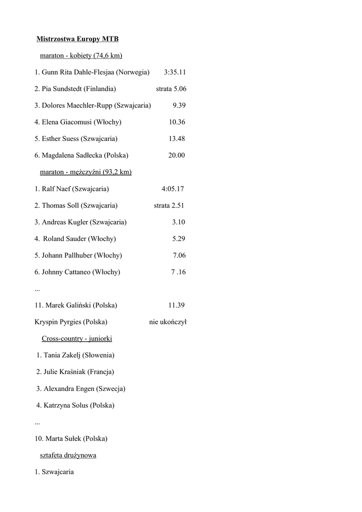 Mistrzostwa Europy MTB maraton - kobiety (74,6 km) 1. Gunn Rita Dahle-Flesjaa (Norwegia) 2. Pia Sundstedt (Finlandia) 3:35.11 strata 5.06 3. Dolores Maechler-Rupp (Szwajcaria) 9.39 4. Elena Giacomusi (Włochy) 10.36 5. Esther Suess (Szwajcaria) 13.48 6. Magdalena Sadłecka (Polska) 20.00 maraton - mężczyźni (93,2 km) 1. Ralf Naef (Szwajcaria) 2. Thomas Soll (Szwajcaria) 4:05.17 strata 2.51 3. Andreas Kugler (Szwajcaria) 3.10 4. Roland Sauder (Włochy) 5.29 5. Johann Pallhuber (Włochy) 7.06 6. Johnny Cattaneo (Włochy) 7 .16 ... 11. Marek Galiński (Polska) Kryspin Pyrgies (Polska) Cross-country - juniorki 1. Tania Zakelj (Słowenia) 2. Julie Kraśniak (Francja) 3. Alexandra Engen (Szwecja) 4. Katrzyna Solus (Polska) ... 10. Marta Sułek (Polska) sztafeta drużynowa 1. Szwajcaria 11.39 nie ukończył 2. Francja 3. Szwecja ... 10. Polska elita kobiet 1. Margarita Fullana (Hiszpania) 1.41.37 2. Gunn Rita Dahle (Norwegia) 1.43.08 3. Sabine Spitz (Niemcy) 1.44.07 4. Petra Henzi (Szwajcaria) 5. Anna Szafraniec (Polska) 6. Maja Włoszczowska (Polska) 7. Magdalena Sadłecka (Polska) zawodniczki do lat 23 1. Sara Koba (Szwajcaria) 2. Teresa Hurikova (Czechy) 3. Eva Lechner (Włochy) 1:31.35 strata 50 1.10 ... 19. Magdalena Pyrgies (Polska) 18.15 juniorzy 1. Matthias Fluckiger (Szwajcaria) 2. Alexis Vuillermoz (Francja) 3. Pascal Meyer (Szwajcaria) 1:17.33 strata 5 s 1.15 ... 14. Piotr Brzózka (Polska) 5.46 18. Adrian Działakiewicz (Polska) 6.07 30. Maciej Dombrowski (Polska) 9.18 32. Kornel Osicki (Polska) 9.36 młodzieżowcy 1. Nino Schurter (Szwajcaria) 1:31.00 2. Rudi van Houts (Holandia) strata 37 s 3. Tony Longo (Włochy) 1.02 ... 13. Kryspin Pyrgies (Polska) 6.03 24. Dariusz Batek (Polska) 9.03 42. Adrian Brzózka (Polska) 12.49 elita mężczyzn 1. Julien Absalon (Francja) 2.01:45 2. Christoph Sauser (Szwajcaria) 0.28 3. Ralf Naef (Szwajcaria) 0.36 4. Frederik Kessiakoff (Szwecja) 1.16 5. Florian Vogel (Szwajcaria) 2.28 6. Roel Paulissen (Belgia) 3.03 7. Jean-Christophe Peraud (Francja) 3.09 8. Marek Galiński (Polska) 3.26 9. Peret Riis Andersen (Dania) 3.33 10. Oliver Beckingsale (Wlk. Brytania) 3.38 Marcin Karczyńki DNF
