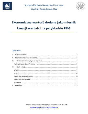 Studenckie Koło Naukowe Finansów Wydział Zarządzania UW Ekonomiczna wartość dodana jako miernik kreacji wartości na przykładzie P&G Spis treści I. Wprowadzenie ................................................................................................................ 2 II. Ekonomiczna wartość dodana ........................................................................................ 3 III. Krótka charakterystyka spółki P&G ............................................................................. 4 Najistotniejsze dane finansowe ......................................................................................... 5 IV. EVA – P&G.................................................................................................................... 6 WACC .................................................................................................................................. 7 ROIC .................................................................................................................................... 8 EVA – ujęcie bezwzględne ................................................................................................ 10 EVA – ujęcie względne...................................................................................................... 11 Prognoza ........................................................................................................................... 11 V. Konkluzje ....................................................................................................................... 13 Analizy przygotowywane są przez członków SKNF WZ UW www.facebook.com/StrefaAnalityczna Studenckie Koło Naukowe Finansów Wydział Zarządzania UW I. Wprowadzenie Z biegiem czasu inwestycje w badania i rozwój stały się głównym czynnikiem napędowym gospodarki. Wybór odpowiedniego wariantu inwestycyjnego pociągał za sobą konieczność stworzenia odpowiedniego narzędzia, które ułatwiłoby podjęcie decyzji. Innym czynnikiem (źródłem) determinującym stworzenie różnych koncepcji mierników wartości jest niedoskonałość miar stosowanych w księgowości, które zniekształcają rzeczywisty obraz przedsiębiorstwa i jego działalności. W odpowiedzi na zapotrzebowanie rynku, pod koniec lat osiemdziesiątych XX wieku została stworzona i opatrzona znakiem firmowym przez Stern Stewart & Company koncepcja ekonomicznej wartości dodanej – EVA. W najprostszym przypadku ekonomiczna wartość dodana może być traktowana jako miernik wyników działalności przedsiębiorstwa, który różni się od większości innych mierników tym, że potrąca z zysku koszt całego kapitału zainwestowanego firmy. Jednak EVA to coś znacznie więcej niż tylko prosty miernik. W swej istocie stanowi szkielet kompleksowego zarządzania finansami i stymulującego systemu wynagrodzeń, który począwszy od zarządu po halę produkcyjną zmienia przesłanki w procesie podejmowania decyzji. Przekształca kulturę całego przedsiębiorstwa, pozwala odnieść większy sukces wszystkim członkom organizacji i pomóc pracownikom w pomnażaniu bogactwa dla akcjonariuszy. EVA tworzy nową perspektywę, która pozwala inaczej spojrzeć na przedsiębiorstwo, dzięki czemu można wyraźniej dostrzec ekonomiczne podstawy biznesu i podejmować lepsze decyzje. System ekonomicznej wartości dodanej dostarcza lepszych informacji, co z kolei skłania kierownictwo do wyboru działań maksymalizujących zyski ekonomiczne i bogactwo akcjonariuszy. Jednak same informacje nie wystarczą, potrzeba jest zmiana zachowania w całej organizacji, aby osiągnąć zamierzone cele. Analizy przygotowywane są przez członków SKNF WZ UW www.facebook.com/StrefaAnalityczna Studenckie Koło Naukowe Finansów Wydział Zarządzania UW II. Ekonomiczna wartość dodana Miernik EVA wyraża się jako różnicę między zyskiem operacyjnym po opodatkowaniu a kosztem kapitału zainwestowanego, wśród ekonomistów otrzymany wynik jest nazywany jako zysk ekonomiczny bądź ekonomiczna renta. Ogólny wzór przyjmuje postać:1 gdzie: NOPAT – zysk operacyjny po opodatkowaniu; WACC – średnio ważony koszt kapitału; IC – kapitał zainwestowany. Po przekształceniu można również zapisać: ( ) gdzie: ROIC – stopa zwrotu z kapitału zainwestowanego. Z menadżerskiego punktu widzenia powyższy wzór umożliwia niezwykle sugestywne zaprezentowanie EVA jako zestawienia dwóch stóp zwrotu: ROIC – rzeczywiście osiągana stopa zwrotu z kapitału zaangażowanego (wskaźnik rentowności zainwestowanego kapitału); WACC – minimalna stopa zwrotu wymagana przez akcjonariuszy. Z owego zestawienia wynika jednoznacznie, iż spółka osiąga zysk ekonomiczny tylko wtedy, gdy jej kapitał zarabia więcej, niż kosztuje. Właśnie ta różnica między ROIC a WACC, 1 Ehrbar A., EVA Strategia tworzenia wartości przedsiębiorstwa, WIG-Press, Warszawa 2000, s. 2. Analizy przygotowywane są przez członków SKNF WZ UW www.facebook.com/StrefaAnalityczna Studenckie Koło Naukowe Finansów Wydział Zarządzania UW nazywana różnicą ekonomiczną lub nadwyżką ekonomiczną, plasuje spółkę w strefie ekonomicznych zysków lub ekonomicznych strat.2 III. Krótka charakterystyka spółki P&G Procter & Gamble to jedna z największych globalnych firm FMCG – grupa kapitałowa mająca swoją siedzibę w Cincinnati, stan Ohio USA. Jej produkty pojawiają się na wszystkich kontynentach w 180 krajach. Ogólna liczba pracowników szacowana jest na około 127 tysięcy osób w 80 państwach. Osobą sprawującą pieczę na całą korporacją jest dyrektor generalny A.G. Lafley. Ilość marek globalnie oscyluje na poziomie 300 wśród, których możemy wyróżnić: • Always • Ariel • Blenda Med. • Bonux • Gillette • Head & Shoulders • Old Spice • Pampers W portfolio firmy znajduje się 25 miliardowych marek, czyli takich, które osiągnęły wartość rocznej sprzedaży przekra