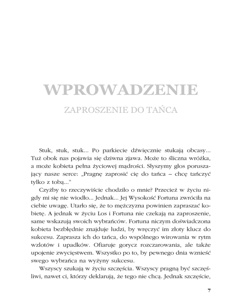 WPROWADZENIE ZAPROSZENIE DO TAŃCA Stuk, stuk, stuk... Po parkiecie dźwięcznie stukają obcasy... Tuż obok nas pojawia się dziwna zjawa. Może to śliczna wróżka, a może kobieta pełna życiowej mądrości. Słyszymy głos poruszający nasze serce: „Pragnę zaprosić cię do tańca – chcę tańczyć tylko z tobą...” Czyżby to rzeczywiście chodziło o mnie? Przecież w życiu nigdy mi się nie wiodło... Jednak... Jej Wysokość Fortuna zwróciła na ciebie uwagę. Utarło się, że to mężczyzna powinien zapraszać kobietę. A jednak w życiu Los i Fortuna nie czekają na zaproszenie, same wskazują swoich wybrańców. Fortuna niczym doświadczona kobieta bezbłędnie znajduje ludzi, by wręczyć im złoty klucz do sukcesu. Zaprasza ich do tańca, do wspólnego wirowania w rytm wzlotów i upadków. Ofiaruje gorycz rozczarowania, ale także upojenie zwycięstwem. Wszystko po to, by pewnego dnia wznieść swego wybrańca na wyżyny sukcesu. Wszyscy szukają w życiu szczęścia. Wszyscy pragną być szczęśliwi, nawet ci, którzy deklarują, że tego nie chcą. Jednak szczęście, 7 BIAŁE TANGO SUKCESU sukces, powodzenie – to pojęcia dla każdego oznaczające coś innego. Jedno jest pewne – każdy sukces (w jakiejkolwiek postaci byśmy go sobie wyobrażali) wymaga gruntownych wewnętrznych przemian. Sukces przypomina długi i trudny taniec, który wykonujemy z kapryśną partnerką – Fortuną (lub z kapryśnym partnerem – Losem). Jednakże wystarczy jeden niezgrabny ruch z naszej strony i partner(ka) odepchnie nas, zwracając się ku komuś innemu – a pragnących dobrobytu i powodzenia są przecież miliony. Nikt nie chciałby zaprzepaścić okazji do tańca ze swoją Fortuną. To nic, że nie umiemy dobrze tańczyć, że partner(ka) się krzywi, niech znosi wytrwale nasze deptanie po palcach i niezgrabne ruchy. Dlaczego? A dlatego, że mamy w sobie przyciągającą moc pozwalającą na utrzymanie partnerki. Gdybyśmy nie posiadali tej siły, gwiaździsta pani już dawno tańczyłaby z innym – kiedyś zręczniejszym, zwinniejszym i bieglejszym w tańcu. Co nam przeszkadza w osiągnięciu takiej właśnie zwinności, w nauczeniu się wszystkich figur tańca sukcesu? Przecież można zawirować w parze z Fortuną, Sukcesem, poczuć subtelny niepokojący zapach możliwości – a potem się rozstać. Fortuna znajdzie sobie godniejszego partnera. Nie, nie wolno przegapić okazji tańca z Fortuną! Niech kaprysi – ten, kto nastawił się na sukces, może spowodować, że partner czy partnerka zakochają się w nim. A wtedy należałoby się tylko obawiać zazdrości kochającej istoty – Fortuna nie przebacza zdrady czy chwilowego zauroczenia. Opowiadałem o sukcesie w sposób alegoryczny, ponieważ sukces jest w zasięgu każdego z nas, ale jego osiągnięcie wiąże się z wytężoną pracą wewnętrzną, z faktem, że trzeba będzie się zmienić. Fortuna rzeczywiście przypomina kapryśną kobietę. Czasami wystarczy jedno wypowiedziane słowo czy krzywe spojrzenie, by ją obrazić. A wtedy będziemy musieli długo namawiać swą ukochaną, żeby do nas wróciła. To może potrwać całe lata. 8 WPROWADZENIE: Zaproszenie do tańca Niełatwo utrzymać Fortunę przy sobie – jest płocha i wciąż usilnie szuka okazji, by uciec i nawiązać romans z kimś innym. Nie jest łatwo obcować z Fortuną – ale czy to oznacza, że powinniśmy się pogodzić z takim stanem rzeczy? Można tak postąpić, ale można też zacząć tworzyć swój sukces. Sukces cechuje większa stałość i jeśli uda się nam go osiągnąć, wtedy zostanie z nami na długo, być może na zawsze. Oczywiście nie trzeba przydawać takim pojęciom, jak: sukces, powodzenie, pomyślność szczególnych mistycznych cech, nie należy utożsamiać ich z konkretnymi osobami. Życiowe powodzenie jest wynikiem olbrzymiej pracy wewnętrznej, produktem ciągłych nieświadomych wysiłków zmierzających do stworzenia ogólnego tła sukcesu, pomagających w osiągnięciu zamierzonego rezultatu. To praca nieustająca, głęboka, przenikająca całe nasze życie. Bez niej osiągnięcie sukcesu jest niemożliwe. Będziemy się stykać z różnymi partnerami, będziemy przestrzegać określonych praw i zasad, postępować zgodnie z ogólnie przyjętymi normami zachowania. Możemy kontynuować porównanie z tańcem, w którym te konwenanse uwidoczniają się w szczególnie wyraźny sposób. Jeden z partnerów prowadzi drugiego i oboje wykonują złożony rytmiczny układ. Przypomnijmy, że w dawnych czasach ludzie za pośrednictwem tańca wyrażali wszystkie życiowe wydarzenia. Obecnie żyjemy w czasach niezwykłego pośpiechu, nie oczekujmy więc, że ktoś nagle zacznie przedstawiać w tańcu to, co się wydarzyło w ciągu dnia. Taniec jako środek komunikacji już nie istnieje – stał się rozrywką. Jednak jego pierwotny sens nie zniknął z naszej podświadomości. Każdy w swym wnętrzu, podobnie jak nasi pradawni przodkowie, tańczy swój taniec w nadziei, że piruety pomogą wyrwać się z bagna rutyny i szarości życia. Niestety właściwie nie mamy pojęcia, co możemy wyrazić przez swój ruch wewnętrzny i nie wiemy, jak to zrobić. 9 BIAŁE TANGO SUKCESU Czytelnik znajdzie w tej książce rozwiązania dotyczące wielu palących kwestii: jak współpracować z partnerem biznesowym, w jaki sposób budować stosunki z innymi ludźmi w klimacie zaufania będącego przecież podstawą sukcesu, w jaki sposób osiągnąć sukces, jakie działania należy podjąć, aby powodzenie stale towarzyszyło nam w życiu. Podstawowa wiedza na temat współdziałania z nieświadomą psychiką, kontakt z podświadomością innego człowieka – to jeszcze niepełny przegląd tematów zaprezentowanych w książce. Istotny przy tym jest fakt, że wszystko co zawarto w tej książce, zostało sprawdzone i przepracowane w grupach treningowych. Każdy z nas może nauczyć się być szczęśliwy, jeśli sam t