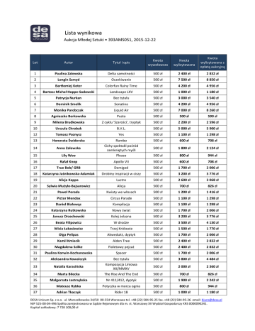Lista wynikowa Aukcja Młodej Sztuki • 393AMS051, 2015-12-22 Lot Autor Tytuł i opis Kwota wywoławcza Kwota wylicytowana Kwota wylicytowana z opłatą aukcyjną 1 Paulina Zalewska Delta samotności 500 zł 2 400 zł 2 832 zł 2 Longin Szmyd Oczekiwanie 500 zł 7 500 zł 8 850 zł 3 Bartłomiej Koter Colorfun Rainy Time 500 zł 4 200 zł 4 956 zł 4 Bartosz Michał Hoppe-Sadowski Landscape LXV 500 zł 1 000 zł 1 180 zł 5 Patrycja Nurkan Bez tytułu 500 zł 3 000 zł 3 540 zł 6 Dominik Smolik Sonatina 500 zł 4 200 zł 4 956 zł 7 Monika Parobczak Liquid Air 500 zł 7 000 zł 8 260 zł 8 Agnieszka Borkowska Pusto 500 zł 500 zł 590 zł 9 Milena Brudkowska Z cyklu 'Szarości', tryptyk 500 zł 2 200 zł 2 596 zł 10 Urszula Chrobak B.V.L. 500 zł 5 000 zł 5 900 zł 12 Tomasz Poznysz Yes 500 zł 1 100 zł 1 298 zł 13 Honorata Świderska 500 zł 600 zł 708 zł 14 Anna Zalewska 500 zł 1 800 zł 2 124 zł 15 Lily Woo Rambo Cichy spektakl pośród zamkniętych myśli Please 500 zł 800 zł 944 zł 16 Rafał Knop Apollo VII 500 zł 600 zł 708 zł 17 True Bob/ GRB Demigod 500 zł 1 700 zł 2 006 zł 18 Katarzyna Jaśnikowska-Adamiak Drobiny inspiracji w ciszy 500 zł 3 200 zł 3 776 zł 19 Alicja Kappa Lustro 500 zł 2 600 zł 3 068 zł 20 Sylwia Mużyło-Bajsarowicz Alicja 500 zł 700 zł 826 zł 21 Paweł Porada Kwiaty we włosach 500 zł 1 200 zł 1 416 zł 22 Pictor Mendax Circus Parade 500 zł 1 100 zł 1 298 zł 23 Daniel Białowąs Kompilacja 500 zł 1 100 zł 1 298 zł 24 Katarzyna Rutkowska Nowy świat 500 zł 1 700 zł 2 006 zł 25 Janusz Orzechowski Kolej żelazna 500 zł 3 200 zł 3 776 zł 26 Beata Filipowicz W drodze 500 zł 3 500 zł 4 130 zł 27 Misia Łukasiewicz Trzej Królowie 500 zł 1 500 zł 1 770 zł 28 Olga Pelipas Akwedukt, dyptyk 500 zł 1 700 zł 2 006 zł 29 Kamil Kmiecik Alden Tree 500 zł 2 400 zł 2 832 zł 30 Magdalena Szilke Fioletowy pejzaż 500 zł 2 400 zł 2 832 zł 31 Paulina Korwin-Kochanowska Spacer 500 zł 1 700 zł 2 006 zł 32 Aleksandra Kowalczyk Bez tytułu 500 zł 3 800 zł 4 484 zł Natalia Karasińska Kompozycja Liniowa XX/MMXV 500 zł 2 000 zł 2 360 zł 34 Marta Bilecka The Rise And The End 500 zł 700 zł 826 zł 35 Małgorzata Jastrzębska Nr 411/412, dyptyk 500 zł 1 900 zł 2 242 zł 36 Mateusz Rybka Potyczka w morzu ognia 500 zł 800 zł 944 zł 37 Adrian Tkaczyk Rider 18 500 zł 1 000 zł 1 180 zł 33 DESA Unicum Sp. z o.o. ul. Marszałkowska 34/50 00-554 Warszawa tel. +48 (22) 584-95-25 fax. +48 (22) 584-95-26 email: [email protected] NIP 525-00-04-496 Spółka zarejestrowana w Sądzie Rejonowym dla m. st. Warszawy XII Wydział Gospodarczy KRS 0000090241. Kapitał zakładowy: 7 728 100,00 zł Lista wynikowa Aukcja Młodej Sztuki • 393AMS051, 2015-12-22 38 Grzegorz Molas Rain 500 zł 4 200 zł 4 956 zł 39 Juliusz Lewandowski Przyjaciele 500 zł 6 500 zł 7 670 zł 40 Łukasz Biliński Cain's sin 500 zł 3 000 zł 3 540 zł 41 Renata Magda Fidelity 500 zł 1 700 zł 2 006 zł 42 Małgorzata Sęk She is Just Another Girl 500 zł 5 000 zł 5 900 zł 43 Mirella Stern Kopciuszek 500 zł 8 000 zł 9 440 zł 44 Damian Cosma Old Master 500 zł 3 200 zł 3 776 zł 45 Michał Zalewski Kamikaze 500 zł 500 zł 590 zł 46 Maciej Zabawa Bez tytułu 500 zł 1 500 zł 1 770 zł 47 Marcin Tomaszewski Hathor 500 zł 900 zł 1 062 zł 48 Anna Mamica Primavera 500 zł 800 zł 944 zł 49 Monika Łakomska Wayne Shorter's Harmony 500 zł 4 500 zł 5 310 zł 50 Mateusz Maliborski Muzeum XXI 500 zł 2 400 zł 2 832 zł 51 Paweł Borkowski Panki-Banki 500 zł 2 800 zł 3 304 zł 52 Olka Oniemiałe kury 500 zł 500 zł 590 zł 53 Agata Słomianowska Akt w różowych majtach z psem 500 zł 600 zł 708 zł 54 Klaudia Świątczak-Pjanka Morska Pin up 500 zł 1 100 zł 1 298 zł 55 Anita Dąbrowska Uporczywość myśli 500 zł 900 zł 1 062 zł 56 Ewa Guzy Fashion Victims XXXXXXVI 500 zł 800 zł 944 zł 57 Katarzyna Matylda Kręcicka Długo nie wracają 500 zł 800 zł 944 zł 59 Janina Zaborowska Dudek 500 zł 700 zł 826 zł 60 Agnieszka Pawłowska Maroko 500 zł 6 000 zł 7 080 zł 61 Katarzyna Misiórska Kicia tylko nie skacz 500 zł 700 zł 826 zł 62 Jakub Podlodowski Żyrafa z Lektykarskiej 500 zł 2 800 zł 3 304 zł 63 Anna Stanisz Transcendencja, ed. 1/1 500 zł 700 zł 826 zł 65 Grzegorz Klimek Bez tytułu 500 zł 2 600 zł 3 068 zł 66 Łukasz Lepiorz Bez tytułu 500 zł 1 100 zł 1 298 zł 67 Iwona Gabryś Bryły nr 511 500 zł 900 zł 1 062 zł 68 Lech Bator Czarny balon, ed. 7/10 500 zł 1 500 zł 1 770 zł 69 Paulina Giersz Apokalipsa 500 zł 500 zł 590 zł 70 Kamila Makaruk Krasnale 500 zł 600 zł 708 zł 71 Adam Wątor Przebudzenie 500 zł 3 800 zł 4 484 zł 72 Gabriela Szymańska Bez tytułu 500 zł 2 200 zł 2 596 zł 73 Aneta Sznura Taniec 500 zł 600 zł 708 zł 74 Patrycja Kruszyńska-Mikulska Nowa Ziemia 500 zł 3 800 zł 4 484 zł 75 Joanna Szostak Pejzaż 1VIII15 500 zł 1 100 zł 1 298 zł 76 Piotr Woroniec Jr Moduł zastępczy 500 zł 2 000 zł 2 360 zł 77 Szymon Kurpiewski Let's play Mickey 500 zł 500 zł 590 zł 78 Patrycja Gotszling I DVE NY 500 zł 5 000 zł 5 900 zł 79 Stanisław Tomalak Kwadrat 334 500 zł 1 400 zł 1 652 zł DESA Unicum Sp. z o.o. ul. Marszałkowska 34/50 00-554 Warszawa tel. +48 (22) 584-95-25 fax. +48 (22) 584-95-26 email: [email protected] NIP 525-00-04-496 Spółka zarejestrowana w Sądzie Rejonowym dla m. st. Warszawy XII Wydział Gospodarczy KRS 0000090241. Kapitał zakładowy: 7 728 100,00 zł Lista wynikowa Aukcja Młodej Sztuki • 393AMS051, 2015-12-22 80 Michał Kamiński Bez tytułu 500 zł 2 800 zł 3 304 zł 81 Magdalena Laskowska Sąd Parysa 500 zł 2 200 zł 2 596 zł 82 Danuta Wójcik Lazurowy błękit 500 zł 1 600 zł 1 888 zł 83 Katarzyna Stefanowicz 500 zł 500 zł 590 zł 84 Maciej Krakowski 500 zł 2 000 zł 2 360 zł 85 Sławomir Wojtkiewicz Echo Persefona Roy Lichtenstein-Look Mickey! Październik 500 zł 900 zł 1 062 zł 86 Robert Listwan "KATE" 500 zł 500 zł 590 zł 87