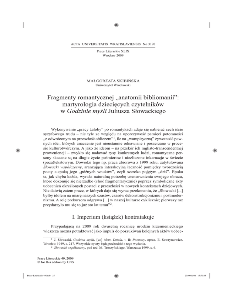 ACTA UNIVERSITATIS WRATISLAVIENSIS No 3190 Prace Literackie XLIX Wrocław 2009 MAŁGORZATA SKIBIŃSKA Uniwersytet Wrocławski Fragmenty romantycznej „anatomii bibliomanii”: martyrologia dziecięcych czytelników w Godzinie myśli Juliusza Słowackiego Wykonywanie „pracy żałoby” po romantykach zdaje się nabierać cech iście syzyfowego trudu – nie tyle ze względu na uporczywość pamięci potomności „z odwróconym na przeszłość obliczem”1, ile na „wampiryczną” żywotność pewnych idei, których znaczenie jest nieustannie odnawiane i poszerzane w procesie kulturotwórczym. A jako że ideom – na przekór ich mglisto-transcendentnej proweniencji – zwykło się nadawać rysy konkretnych ludzi, romantyczne persony skazane są na długie życie pośmiertne i niezliczone inkarnacje w świecie (poza)tekstowym. Dowodzi tego np. praca zbiorowa z 1999 roku, zatytułowana Słowacki współczesny, aranżująca interakcyjną łączność pomiędzy twórczością poety a epoką jego „późnych wnuków”, czyli szeroko pojętym „dziś”. Epoka ta, jak chyba każda, wyraża naturalną potrzebę usensownienia swojego obrazu, które dokonuje się nierzadko (choć fragmentarycznie) poprzez symboliczne akty uobecnień określonych postaci z przeszłości w nowych kontekstach dziejowych. Nie dziwią zatem prace, w których daje się wyraz przekonaniu, że „Słowacki [...] byłby idolem na miarę naszych czasów, czasów dekonstrukcjonizmu i postmodernizmu. A rolę prekursora odgrywa [...] w naszej kulturze cyklicznie; pierwszy raz przydarzyło mu się to już sto lat temu”2. I. Imperium (książek) kontratakuje Przypadającą na 2009 rok dwusetną rocznicę urodzin krzemienieckiego wieszcza można potraktować jako impuls do poszukiwań kolejnych aktów uobec1 J. Słowacki, Godzina myśli, [w:] idem, Dzieła, t. II: Poematy, oprac. E. Sawrymowicz, Wrocław 1949, s. 217. Wszystkie cytaty będą pochodzić z tego wydania. 2 Słowacki współczesny, pod red. M. Troszyńskiego, Warszawa 1999, s. 6. Prace Literackie 49, 2009 © for this edition by CNS Prace-Literackie-49.indb 35 2010-02-08 13:50:43 36 MAŁGORZATA SKIBIŃSKA nień „posągów myśli” autora w refleksji nad aktualnymi zjawiskami kulturowymi, spośród których na szczególną uwagę zasługuje fakt „wzmocnienia dawnego medium przez pojawienie się nowego”3. Chodzi tu mianowicie o przejawy rewaloryzacji paradygmatu kodeksu papierowego, wynikającej ze społecznej nieufności wobec ekspansji mediów elektronicznych i opartej na przeświadczeniu, że „książka w swej tradycyjnej formie jest medium [...] o wiele bardziej spełniającym potrzeby psychiczne człowieka”4. Tym, jak można przypuszczać, umotywowany jest wzrost liczby i zarazem popularności utworów o rozmaitych odcieniach gatunkowych (głównie spod znaku szeroko pojętej fantastyki), w których sensotwórczą funkcję osi organizującej wokół siebie podstawowe elementy fabuły pełni motyw książki (biblioteki, czytelnika, aktu lektury w jej wszelakich stylach itp.)5. Pomijając przykłady popularnych tekstów, wykorzystujących postać demonicznego, „niepoczytalnego czytelnika” lub topos nawiedzonego (zatrutego) woluminu6 w celu ewokowania uczucia grozy u odbiorcy, w sporej części wspomnianego typu twórczości można zauważyć tendencję do przedstawiania aktu lektury jako jednego z najdonioślejszych doświadczeń egzystencjalnych kształtujących psychikę bohatera. Trzeba przy tym zaznaczyć, iż współczesne utwory, bliskie konwencji „książki o książkach”, coraz częściej koncentrują się wokół figury czytającego dziecka7, co widoczne jest szczególnie w twórczości Cornelii Funke (Atramentowa trylogia), Matthew Skeltona (Endymion Spring) czy Johna Connolly’ego (Księga rzeczy utraconych), którym zdaje się patronować Michael Ende, autor Niekończącej się historii8. Powieści z tego kręgu adresowane są na ogół do młodych odbiorców i pełnią tym samym funkcję rozrywkowo-dydaktyczną. Zaludniający ich karty dziecięcy czytelnicy kreowani są przeto na bohaterów pozytywnych, heroicznych, obdarzonych charyzmatem wrażliwości, która z jednej strony naraża ich na wszelakie niebezpieczeństwa płynące ze świata 3 A. Dróżdż, Książka w świecie utopii, Kraków 2006, s. 229. Idem, Świat książki i biblioteki w twórczości literackiej Stanisława Lema, [w:] Kraków – Lwów: Książki – czasopisma – biblioteki XIX i XX wieku, pod red. J. Jarowieckiego, t. VI, cz. 1, Kraków 2003, s. 341. 5 Np. J. Connolly, Księga rzeczy utraconych, przeł. K. Malita, Warszawa 2007; C.M. Domínguez, Dom z papieru, przeł. A. Sobol-Jurczykowski, Warszawa 2007; J. Fforde, Porwanie Jane E., przeł. M. Chrobak, Kraków 2005 (i kolejne części cyklu); C. Funke, Atramentowe serce, przeł. J. Koźbiał, Kraków 2005 (i pozostałe części trylogii); W. Moers, Miasto śniących książek, przeł. K. Bena, Wrocław 2006; O. Pamuk, Nowe życie, przeł. A. Polat, Kraków 2008; S. Savage, Firmin, przeł. R. Nowakowski, Kraków 2009; B. Schlink, Lektor, przeł. K. Niedenthal, Warszawa 2009; C.R. Zafón, Cień wiatru, przeł. B. Fabjańska-Potapczuk, Warszawa 2005. 6 Np. U. Eco, Imię róży, przeł. A. Szymanowski, Warszawa 1987; A. Pérez-Reverte, Klub Dumas, przeł. F. Łobodziński, Warszawa 2003; W. Szyda, Hotel Wieczność, Warszawa 2005. 7 Mogącego wszelako występować np. pod alegoryczną postacią dorastającego szczura, jak w Firminie Sama Savage’a. S. Savage, Firmin. Przygody wielkomiejskiej szumowiny, przeł. R. Nowakowski, Kraków 2009. 8 Należałoby tu wspomnieć również o Magicznej bibliotece Bibbi Bokken J. Gaardera i K. Hagerupa. J. Gaarder, K. Hagerup, Magiczna biblioteka Bibbi Bokken, przeł. I. Zimnicka, Warszawa 2000. 4 Prace Literackie 49, 2009 © for this edition by CNS Prace-Literackie-49.indb 36 2010-02-08 13:50:43 Martyrologia dziecięcych czytelników w Godzinie myśli J. Słowac