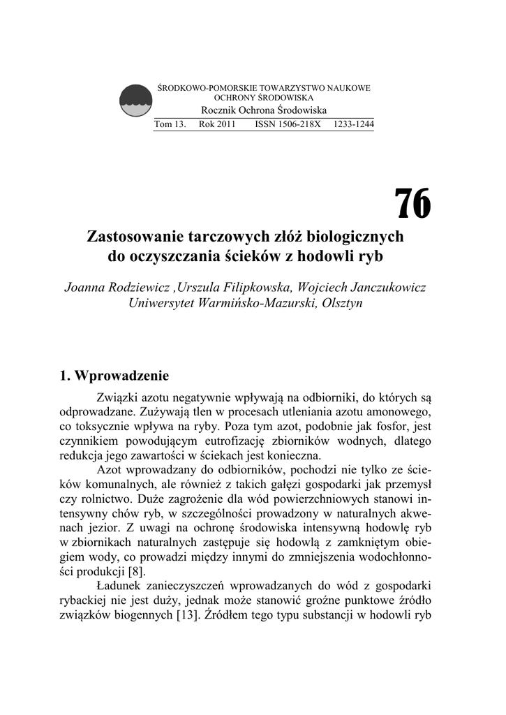 ŚRODKOWO-POMORSKIE TOWARZYSTWO NAUKOWE OCHRONY ŚRODOWISKA Rocznik Ochrona Środowiska Tom 13. Rok 2011 ISSN 1506-218X 1233-1244 76 Zastosowanie tarczowych złóż biologicznych do oczyszczania ścieków z hodowli ryb Joanna Rodziewicz ,Urszula Filipkowska, Wojciech Janczukowicz Uniwersytet Warmińsko-Mazurski, Olsztyn 1. Wprowadzenie Związki azotu negatywnie wpływają na odbiorniki, do których są odprowadzane. Zużywają tlen w procesach utleniania azotu amonowego, co toksycznie wpływa na ryby. Poza tym azot, podobnie jak fosfor, jest czynnikiem powodującym eutrofizację zbiorników wodnych, dlatego redukcja jego zawartości w ściekach jest konieczna. Azot wprowadzany do odbiorników, pochodzi nie tylko ze ścieków komunalnych, ale również z takich gałęzi gospodarki jak przemysł czy rolnictwo. Duże zagrożenie dla wód powierzchniowych stanowi intensywny chów ryb, w szczególności prowadzony w naturalnych akwenach jezior. Z uwagi na ochronę środowiska intensywną hodowlę ryb w zbiornikach naturalnych zastępuje się hodowlą z zamkniętym obiegiem wody, co prowadzi między innymi do zmniejszenia wodochłonności produkcji [8]. Ładunek zanieczyszczeń wprowadzanych do wód z gospodarki rybackiej nie jest duży, jednak może stanowić groźne punktowe źródło związków biogennych [13]. Źródłem tego typu substancji w hodowli ryb 1234 Joanna Rodziewicz ,Urszula Filipkowska, Wojciech Janczukowicz są między innymi produkty metabolizmu ryb oraz pasze jakimi są karmione [11]. Oczyszczanie wód poprodukcyjnych zapewnia dobrą jakość wody rybom hodowanym w obiegu zamkniętym, jak również redukcję stężeń związków azotu i fosforu odprowadzanych do odbiorników w systemach otwartych, a co za tym idzie zmniejszenie wpływu tych związków na naturalne ekosystemy wodne. Opracowanie odpowiednich technologii intensywnej gospodarki rybackiej oraz oczyszczania wód poprodukcyjnych jest wynikiem coraz ostrzejszych wymagań dotyczących jakości odprowadzanych ścieków. Zdarza się, że wybrana metoda oczyszczania konwencjonalnego nie wykazuje oczekiwanej sprawności. W takich przypadkach można zastosować zabiegi usprawniające usuwanie zawiesin i związków biogennych, jako dodatkowy, trzeci stopień oczyszczania [3]. Zastosowanie dodatkowego oczyszczania podnosi jednak koszty produkcyjne. Aby tego uniknąć wykorzystuje się systemy, dzięki którym zanieczyszczenia powstające w jednej gałęzi produkcji wykorzystywane są w innej [17]. Bogata w związki azotowe i fosforowe woda z intensywnej hodowli ryb może być wykorzystana przykładowo w celu nawodnień oraz produkcji roślinnej [9]. Barramundi (Lates calcarifer), ze względu na swoje walory smakowe, są rybami cenionymi w gastronomii na całym świecie, co potwierdza stały wzrost zapotrzebowania na ten gatunek. W warunkach naturalnych barramundi żyją w morskich przybrzeżnych wodach tropikalnych, gdzie temperatura wody nie spada poniżej 20ºC. Dorosłe barramundi osiągają długość do 1,8 m i ważą do 60 kg. Najczęściej łowi się je, gdy mają od 1,0 do 1,2 m. Są to ryby mięsożerne i bardzo drapieżne. Odżywiają się mniejszymi rybami i owadami. Ponieważ jest to gatunek dwuśrodowiskowy ryby te potrafią przebywać w wodzie słodkiej i słonej. Dzięki swoim walorom gatunek ten nabiera znaczenia także w polskiej akwakulturze. Celem niniejszej pracy było zbadanie możliwości zastosowania elektrolitycznie wspomaganej denitryfikacji w procesie oczyszczania wód poprodukcyjnych z intensywnej hodowli ryb barramundi. W założeniach technologicznych przyjęto, że podczas przepływu prądu elektrycznego zajdzie proces redukcji związków azotu. Na powierzchni katody, w procesie elektrolizy wody, powstanie gazowy wodór Zastosowanie tarczowych złóż biologicznych… 1235 wykorzystywany jako źródło elektronów przez autotroficzne mikroorganizmy w procesie denitryfikacji. Strefa anoksyczna powstaje w głębszych warstwach błony biologicznej z powodu ograniczenia penetracji tlenu. 2. Metodyka badań 2.1. Stanowisko badawcze Badania prowadzone były w warunkach laboratoryjnych na elektro-biologicznym złożu tarczowym (rys. 1). Tarcze ze stali nierdzewnej, z unieruchomioną biomasą, stanowiły katodę, natomiast anodą była elektroda aluminiowa zanurzona w komorze przepływowej złoża. Całkowita powierzchnia czynna złoża wynosiła 0,6 m2. Tarcze obracały się z prędkością 9 obr./min. Badania prowadzono w warunkach przepływu prądu elektrycznego o gęstości 4,75 mA/m2. 4 3 katoda /5/ anoda /6/ 2 1 7 Rys. 1. Schemat stanowiska badawczego: 1 – biologiczne złoże tarczowe, 2 – zbiornik ścieków surowych, 3 – pompa perystaltyczna, 4 – źródło prądu elektrycznego, 5 – katoda, 6 – anoda, 7 – zbiornik ścieków oczyszczonych Fig. 1. The scheme of the experimental stand: 1 – rotating biological contactor, 2 – raw wastewater tank, 3 – peristaltic pump, 4 – a source of electric current, 5 – cathode, 6 – anode, 7 – treated wastewater tank 2.2. Założenia technologiczne prowadzonego doświadczenia Badania nad możliwością wykorzystania procesu elektrolitycznie wspomaganej denitryfikacji do oczyszczania wód poprodukcyjnych z hodowli ryb prowadzone były przez okres trzech miesięcy. Parametry pracy biologicznego złoża tarczowego zostały przedstawione w tabeli 1. 1236 Joanna Rodziewicz ,Urszula Filipkowska, Wojciech Janczukowicz Zastosowanie tarczowych złóż biologicznych… 1237 Tabela 1. Założenia technologiczne Table 1. Technological assumptions Parametr Czas zatrzymania w reaktorze Wartość Jednostka [h] 3 Natężenie przepływu [dm /d] 64 Obciążenie hydrauliczne 2 [dm /m d] 107 Obciążenie złoża ładunkiem zanieczyszczeń ChZT Obciążenie złoża ładunkiem azotu ogólnego [g ChZT/m2d] 11,8 [g Nog/m2d] 8,6 Gęstość prądu elektrycznego [mA/m2] 4,75 3 3 2.3. Charakterystyka wód poprodukcyjnych W badaniach wykorzystano wody poprodukcyjne 