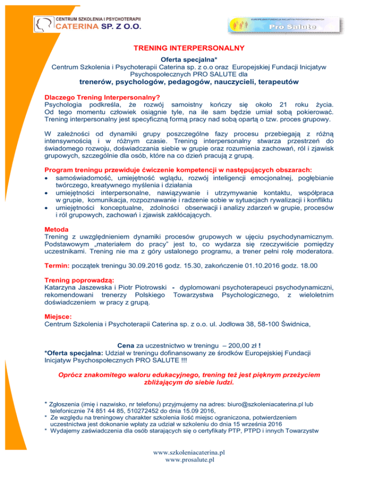 TRENING INTERPERSONALNY Oferta specjalna* Centrum Szkolenia i Psychoterapii Caterina sp. z o.o oraz Europejskiej Fundacji Inicjatyw Psychospołecznych PRO SALUTE dla trenerów, psychologów, pedagogów, nauczycieli, terapeutów Dlaczego Trening Interpersonalny? Psychologia podkreśla, że rozwój samoistny kończy się około 21 roku życia. Od tego momentu człowiek osiągnie tyle, na ile sam będzie umiał sobą pokierować. Trening interpersonalny jest specyficzną formą pracy nad sobą opartą o tzw. proces grupowy. W zależności od dynamiki grupy poszczególne fazy procesu przebiegają z różną intensywnością i w różnym czasie. Trening interpersonalny stwarza przestrzeń do świadomego rozwoju, doświadczania siebie w grupie oraz rozumienia zachowań, ról i zjawisk grupowych, szczególnie dla osób, które na co dzień pracują z grupą. Program treningu przewiduje ćwiczenie kompetencji w następujących obszarach: samoświadomość, umiejętność wglądu, rozwój inteligencji emocjonalnej, pogłębianie twórczego, kreatywnego myślenia i działania umiejętności interpersonalne, nawiązywanie i utrzymywanie kontaktu, współpraca w grupie, komunikacja, rozpoznawanie i radzenie sobie w sytuacjach rywalizacji i konfliktu umiejętności konceptualne, zdolności obserwacji i analizy zdarzeń w grupie, procesów i ról grupowych, zachowań i zjawisk zakłócających. Metoda Trening z uwzględnieniem dynamiki procesów grupowych w ujęciu psychodynamicznym. Podstawowym „materiałem do pracy” jest to, co wydarza się rzeczywiście pomiędzy uczestnikami. Trening nie ma z góry ustalonego programu, a trener pełni rolę moderatora. Termin: początek treningu 30.09.2016 godz. 15.30, zakończenie 01.10.2016 godz. 18.00 Trening poprowadzą: Katarzyna Jaszewska i Piotr Piotrowski - dyplomowani psychoterapeuci psychodynamiczni, rekomendowani trenerzy Polskiego Towarzystwa Psychologicznego, z wieloletnim doświadczeniem w pracy z grupą. Miejsce: Centrum Szkolenia i Psychoterapii Caterina sp. z o.o. ul. Jodłowa 38, 58-100 Świdnica, Cena za uczestnictwo w treningu – 200,00 zł ! *Oferta specjalna: Udział w treningu dofinansowany ze środków Europejskiej Fundacji Inicjatyw Psychospołecznych PRO SALUTE !!! Oprócz znakomitego waloru edukacyjnego, trening też jest pięknym przeżyciem zbliżającym do siebie ludzi. * Zgłoszenia (imię i nazwisko, nr telefonu) przyjmujemy na adres: [email protected] lub telefonicznie 74 851 44 85, 510272452 do dnia 15.09 2016, * Ze względu na treningowy charakter szkolenia ilość miejsc ograniczona, potwierdzeniem uczestnictwa jest dokonanie wpłaty za udział w szkoleniu do dnia 15 września 2016 * Wydajemy zaświadczenia dla osób starających się o certyfikaty PTP, PTPD i innych Towarzystw www.szkoleniacaterina.pl www.prosalute.pl