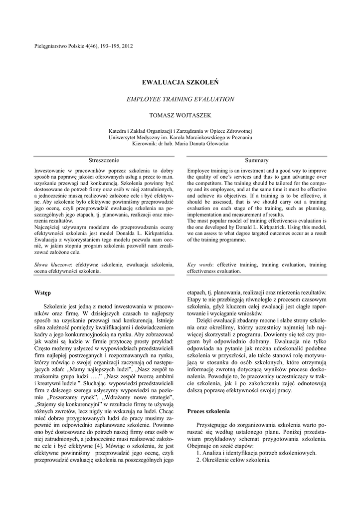 Pielęgniarstwo Polskie 4(46), 193–195, 2012 EWALUACJA SZKOLEŃ EMPLOYEE TRAINING EVALUATION TOMASZ WOJTASZEK Katedra i Zakład Organizacji i Zarządzania w Opiece Zdrowotnej Uniwersytet Medyczny im. Karola Marcinkowskiego w Poznaniu Kierownik: dr hab. Maria Danuta Głowacka Streszczenie Summary Inwestowanie w pracowników poprzez szkolenia to dobry sposób na poprawę jakości oferowanych usług a przez to m.in. uzyskanie przewagi nad konkurencją. Szkolenia powinny być dostosowane do potrzeb firmy oraz osób w niej zatrudnionych, a jednocześnie muszą realizować założone cele i być efektywne. Aby szkolenie było efektywne powinniśmy przeprowadzić jego ocenę, czyli przeprowadzić ewaluację szkolenia na poszczególnych jego etapach, tj. planowania, realizacji oraz mierzenia rezultatów. Najczęściej używanym modelem do przeprowadzenia oceny efektywności szkolenia jest model Donalda L. Kirkpatricka. Ewaluacja z wykorzystaniem tego modelu pozwala nam ocenić, w jakim stopniu program szkolenia pozwolił nam zrealizować założone cele. Employee training is an investment and a good way to improve the quality of one’s services and thus to gain advantage over the competitors. The training should be tailored for the company and its employees, and at the same time it must be effective and achieve its objectives. If a training is to be effective, it should be assessed, that is we should carry out a training evaluation on each stage of the training, such as planning, implementation and measurement of results. The most popular model of training effectiveness evaluation is the one developed by Donald L. Kirkpatrick. Using this model, we can assess to what degree targeted outcomes occur as a result of the training programme. Słowa kluczowe: efektywne szkolenie, ewaluacja szkolenia, ocena efektywności szkolenia. Key words: effective training, training evaluation, training effectiveness evaluation. Wstęp etapach, tj. planowania, realizacji oraz mierzenia rezultatów. Etapy te nie przebiegają równolegle z procesem czasowym szkolenia, gdyż kluczem całej ewaluacji jest ciągłe raportowanie i wyciąganie wniosków. Dzięki ewaluacji zbadamy mocne i słabe strony szkolenia oraz określimy, którzy uczestnicy najmniej lub najwięcej skorzystali z programu. Dowiemy się też czy program był odpowiednio dobrany. Ewaluacja nie tylko odpowiada na pytanie jak można udoskonalić podobne szkolenia w przyszłości, ale także stanowi rolę motywującą w stosunku do osób szkolonych, które otrzymują informację zwrotną dotyczącą wyników procesu doskonalenia. Powoduje to, że pracownicy uczestniczący w trakcie szkolenia, jak i po zakończeniu zajęć odnotowują dalszą poprawę efektywności swojej pracy. Szkolenie jest jedną z metod inwestowania w pracowników oraz firmę. W dzisiejszych czasach to najlepszy sposób na uzyskanie przewagi nad konkurencją. Istnieje silna zależność pomiędzy kwalifikacjami i doświadczeniem kadry a jego konkurencyjnością na rynku. Aby zobrazować jak ważni są ludzie w firmie przytoczę prosty przykład: Często możemy usłyszeć w wypowiedziach przedstawicieli firm najlepiej postrzeganych i rozpoznawanych na rynku, którzy mówiąc o swojej organizacji zaczynają od następujących zdań: ,,Mamy najlepszych ludzi”, ,,Nasz zespół to znakomita grupa ludzi …..” ,,Nasz zespół tworzą ambitni i kreatywni ludzie ”. Słuchając wypowiedzi przedstawicieli firm z dalszego szeregu usłyszymy wypowiedzi na poziomie ,,Poszerzamy rynek”, ,,Wdrażamy nowe strategie”, ,,Stajemy się konkurencyjni” w rezultacie firmy te używają różnych zwrotów, lecz nigdy nie wskazują na ludzi. Chcąc mieć dobrze przygotowanych ludzi do pracy musimy zapewnić im odpowiednio zaplanowane szkolenie. Powinno ono być dostosowane do potrzeb naszej firmy oraz osób w niej zatrudnionych, a jednocześnie musi realizować założone cele i być efektywne [4]. Mówiąc o szkoleniu, że jest efektywne powinniśmy przeprowadzić jego ocenę, czyli przeprowadzić ewaluację szkolenia na poszczególnych jego Proces szkolenia Przystępując do zorganizowania szkolenia warto poruszać się według ustalonego planu. Poniżej przedstawiam przykładowy schemat przygotowania szkolenia. Obejmuje on sześć etapów: 1. Analiza i identyfikacja potrzeb szkoleniowych. 2. Określenie celów szkolenia. 194 Tomasz Wojtaszek 3. Projektowanie szkolenia. 4. Przeprowadzenie szkolenia. 5. Ocena efektów szkolenia. 6. Analiza i podsumowanie całego procesu szkoleniowego. Ad 1. Analiza i identyfikacja potrzeb szkoleniowych Służy określeniu poziomu wiedzy, umiejętności i postaw pracowników, jest to konieczne do prawidłowego osiągnięcia celów oraz realizacji zadań i misji przedsiębiorstwa. Właściwe przeprowadzenie identyfikacji potrzeb szkoleniowych jest podstawą wszelkich innych czynności związanych ze szkoleniem pracowników. Wymaga ona dokładnego przemyślenia i analizy – nie można zapomnieć, że jest to proces wyjątkowo ważny [3]. A. Określa nam, czy szkolenie jest najlepszym zaspokojeniem potrzeb firmy – często bowiem okazuje się, że najpierw należy przeprowadzić np. reorganizację lub zakup jakieś maszyny lub urządzenia, a później dopiero przeprowadzić szkolenie. B. Służy do wyznaczenia luki kompetencyjnej czyli różnicy pomiędzy kompetencjami oczekiwanymi na danym stanowisku pracy a kompetencjami posiadanymi przez zajmujących je pracowników [5]. • Pierwszym etapem oceny luki kompetencyjnej jest stworzenie modelowego profilu kompetycyjnego przypisanego do danego stanowiska pracy • Drugim etapem jest ocena objętych badaniem osób za pomocą audytu personalnego (test samooceny, test kompetencyjny, ocena 180,360, obserwacja uczestnika, tajemniczy klient). Błędem jest wyznaczanie luki kompetencyjnej przez przyszłych wykładowców, gdyż mogą oni narzucać realizację szkolenia nie zawsze wynikającą z rzetelnej analizy. C. Pozwala