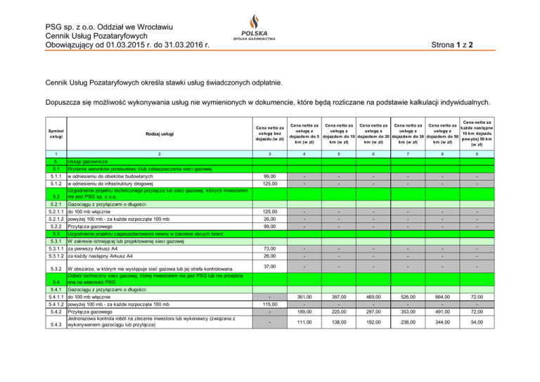 PSG sp. z o.o. Oddział we Wrocławiu Cennik Usług Pozataryfowych Obowiązujący od 01.03.2015 r. do 31.03.2016 r. Strona 1 z 2 Cennik Usług Pozataryfowych określa stawki usług świadczonych odpłatnie. Dopuszcza się możliwość wykonywania usług nie wymienionych w dokumencie, które będą rozliczane na podstawie kalkulacji indywidualnych. Sym bol usługi Cena netto za Cena netto za Cena netto za Cena netto za Cena netto za Cena netto za każde następne usługę z usługę z usługę z usługę z usługę z 10 km dojazdu dojazdem do 5 dojazdem do 10 dojazdem do 20 dojazdem do 30 dojazdem do 50 pow yżej 50 km km (w zł) km (w zł) km (w zł) km (w zł) km (w zł) (w zł) Rodzaj usługi Cena netto za usługę bez dojazdu (w zł) 2 3 4 5 6 7 8 9 1 5. Usługi gazownicze 5.1 Wydanie warunków przebudowy i/lub zabezpieczenia sieci gazowej 5.1.1 w odniesieniu do obiektów budowlanych 99,00 - - - - - - 5.1.2 w odniesieniu do infrastruktury drogowej Uzgodnienie projektu technicznego przyłącza lub sieci gazowej, których inwestorem nie jest PSG sp. z o.o. 125,00 - - - - - - 5.2.1.1 do 100 mb włącznie 125,00 - - - - - - 5.2.1.2 powyżej 100 mb - za każde rozpoczęte 100 mb 26,00 - - - - - - 99,00 - - - - - - 5.3.1.1 za pierwszy Arkusz A4 73,00 - - - - - - 5.3.1.2 za każdy następny Arkusz A4 26,00 - - - - - - 37,00 - - - - - - 72,00 5.2 5.2.1 5.2.2 5.3 5.3.1 5.3.2 5.4 5.4.1 Gazociągu z przyłączami o długości: Przyłącza gazowego Uzgodnienia projektu zagospodarowania terenu w zakresie obcych branż W zakresie istniejącej lub projektowanej sieci gazowej W obszarze, w którym nie występuje sieć gazowa lub jej strefa kontrolowana Odbiór techniczny sieci gazowej, której inwestorem nie jest PSG lub nie przejdzie ona na własność PSG Gazociągu z przyłączami o długości: 5.4.1.1 do 100 mb włącznie 5.4.1.2 powyżej 100 mb - za każde rozpoczęte 100 mb 5.4.2 5.4.3 Przyłącza gazowego Jednorazowa kontrola robót na zlecenie inwestora lub wykonawcy (związana z wykonywaniem gazociągu lub przyłącza) - 361,00 397,00 469,00 526,00 664,00 115,00 - - - - - - - 189,00 225,00 297,00 353,00 491,00 72,00 - 111,00 138,00 192,00 238,00 344,00 54,00 PSG sp. z o.o. Oddział we Wrocławiu Cennik Usług Pozataryfowych Obowiązujący od 01.03.2015 r. do 31.03.2016 r. Sym bol usługi 1 5.6 5.6.1 5.6.2 Rodzaj usługi 2 3 4 5 6 7 8 9 za pierwszą instalację za każdą następną instalację Za uruchomienie instalacji przez napełnienie gazem i odpowietrzenie bez montażu układu pomiarowego (gazomierza) za pierwszą instalację 5.6.2.1 5.6.2.2 5.6.3 Demontaż układu pomiarowego za każdą następną instalację 5.6.3.1 za pierwszy układ pomiarowy 5.6.3.2 5.6.4 za każdy następny układ pomiarowy Za uruchomienie instalacji przez napełnienie gazem i odpowietrzenie z montażem gazomierzy centralnych w węźle pomiarowym 5.6.4.1 za pierwszą instalację 5.6.4.2 za każdą następną instalację 5.6.5 Cena netto za Cena netto za Cena netto za Cena netto za Cena netto za Cena netto za każde następne usługę z usługę z usługę z usługę z usługę z 10 km dojazdu dojazdem do 5 dojazdem do 10 dojazdem do 20 dojazdem do 30 dojazdem do 50 pow yżej 50 km km (w zł) km (w zł) km (w zł) km (w zł) km (w zł) (w zł) Cena netto za usługę bez dojazdu (w zł) Prace instalacyjne prowadzone w budynkach Za uruchomienie instalacji przez napełnienie gazem i odpowietrzenie z montażem układu pomiarowego (gazomierza) 5.6.1.1 5.6.1.2 Strona 2 z 2 - 203,00 234,00 296,00 346,00 465,00 61,00 103,00 - - - - - - - 183,00 214,00 276,00 326,00 445,00 61,00 54,00 - - - - - - - 120,00 150,00 212,00 262,00 381,00 61,00 61,00 - - - - - - - 246,00 277,00 338,00 389,00 508,00 61,00 61,00 - - - - - - Wyłączenie dopływu gazu do budynku poprzez zamknięcie kurka głównego wraz z rozłączeniem instalacji gazowej 5.6.5.1 do DN 100 włącznie - 272,00 303,00 364,00 414,00 533,00 61,00 5.6.5.2 powyżej DN 100 - 296,00 326,00 388,00 438,00 557,00 61,00 1. Odległość dojazdu dotyczy najkrótszej trasy (odległość liczona w jedną stronę) od siedziby Zakładu/RDG/PDG/Sekcji w RDG (w zależności od rodzaju usługi) do Odbiorcy lub miejsca wykonania usługi. 2. W przypadku niewykonania usług zleconych z przyczyn leżących po stronie zlecającego zostanie wystawiona faktura VAT tytułem: "realizacja zlecenia (podać numer i nazwę zlecenia) - dojazd" rozliczająca poniesione koszty . 3. Usługi będą wykonywane w Oddziale w ramach wolnych mocy produkcyjnych. 4. Koszty dojazdu ujęte są w cenie prac związanych z pierwszym lokalem/instalacją/układem pomiarowym. 5. Ustalone ceny usług nie zawierają podatku od towarów i usług (VAT).