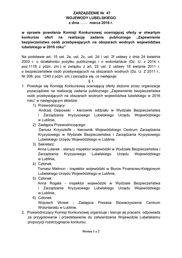 ZARZĄDZENIE Nr 47 WOJEWODY LUBELSKIEGO z dnia …… marca 2016 r. w sprawie powołania Komisji Konkursowej oceniającej oferty w otwartym konkursie ofert na realizację zadania publicznego „Zapewnienie bezpieczeństwa osób przebywających na obszarach wodnych województwa lubelskiego w 2016 roku” Na podstawie art. 15 ust. 2a, ust. 2c, ust. 2d i ust. 2f ustawy z dnia 24 kwietnia 2003 r. o działalności pożytku publicznego i o wolontariacie (Dz. U. z 2014 r. poz.1118 z późn. zm.) w związku z art. 22 ust. 2 ustawy 18 sierpnia 2011 r. o bezpieczeństwie osób przebywających na obszarach wodnych (Dz. U. Z 2011 r., Nr 208, poz. 1240 z późn. zm.) zarządza się, co następuje: §1 1. Powołuje się Komisję Konkursową oceniającą oferty złożone przez organizacje pozarządowe na realizację zadania publicznego „Zapewnienie bezpieczeństwa osób przebywających na obszarach wodnych województwa lubelskiego w 2016 roku” w następującym składzie: 1) Przewodniczący: Andrzej Osipowski - kierownik oddziału w Wydziale Bezpieczeństwa i Zarządzania Kryzysowego Lubelskiego Urzędu Wojewódzkiego w Lublinie, 2) Zastępca Przewodniczącego: Dariusz Krzysztofik - kierownik Wojewódzkiego Centrum Zarządzania Kryzysowego w Wydziale Bezpieczeństwa i Zarządzania Kryzysowego Lubelskiego Urzędu Wojewódzkiego w Lublinie, 3) Sekretarz: Anna Luterek - starszy inspektor wojewódzki w Wydziale Bezpieczeństwa i Zarządzania Kryzysowego Lubelskiego Urzędu Wojewódzkiego w Lublinie, 4) Członek: Tomasz Malmon - inspektor wojewódzki w Biurze Finansowo-Księgowym Lubelskiego Urzędu Wojewódzkiego w Lublinie, 5) Członek: Anna Rogala - inspektor wojewódzki w Wydziale Bezpieczeństwa i Zarządzania Kryzysowego Lubelskiego Urzędu Wojewódzkiego w Lublinie, 6) Członek: Wojciech Wciseł - Zastępca Prezesa Stowarzyszenia Centrum Wolontariatu w Lublinie. 2. Przewodniczący Komisji Konkursowej organizuje i kieruje jej pracami, odpowiada za przygotowanie i przedstawienie do zatwierdzenia Wojewodzie Lubelskiemu propozycji rozstrzygnięcia konkursu. Strona 1 z 2 3. Zastępca Przewodniczącego zastępuje Przewodniczącego Komisji Konkursowej w razie jego nieobecności, bądź braku możliwości uczestniczenia w jej pracach i w tych przypadkach wykonuje czynności i ponosi odpowiedzialność w zakresie określonym w ust. 2. 4. Sekretarz Komisji Konkursowej prowadzi dokumentację konkursu w szczególności sporządza listy obecności członków komisji na posiedzeniach i protokołuje posiedzenia komisji oraz odpowiada za kompletność i prawidłowość dokumentacji, a także uczestniczy w czynnościach mających na celu przeprowadzenie konkursu. 5. Członkowie Komisji biorą udział w pracach Komisji Konkursowej i wykonują zadania wyznaczone przez Przewodniczącego Komisji Konkursowej. §2 Do zadań Komisji Konkursowej należy badanie i ocena złożonych ofert oraz przedstawienie propozycji rozstrzygnięcia konkursu w tym zakresie do zatwierdzenia Wojewodzie Lubelskiemu. §3 Szczegółowy sposób oraz zakres pracy Komisji Konkursowej określa Regulamin prac Komisji Konkursowej, stanowiący załącznik Nr 1 do niniejszego Zarządzenia. §4 Komisję Konkursową powołuje się na okres do zakończenia postępowania tj. do czasu podpisania umowy o wsparcie realizacji zadania publicznego lub unieważnienia postępowania. §5 Wykonanie zarządzenia powierza się Dyrektorowi Wydziału Bezpieczeństwa i Zarządzania Kryzysowego Lubelskiego Urzędu Wojewódzkiego w Lublinie. §6 Zarządzenie wchodzi w życie z dniem podpisania. Strona 2 z 2 Potwierdzam zgodność kopii z dokumentem elektronicznym: Identyfikator dokumentu 1016293.1980703.1667879 Zarządzenie Wojewody o powołaniu komisji Nazwa dokumentu konkursowej - 2016 r.pdf Zarządzenie Wojewody o powołaniu komisji Tytuł dokumentu konkursowej - 2016 r..doc Sygnatura dokumentu ZK-III.68.8.2.2016 Data dokumentu 2016-03-09 07:53:03 85DE78153CF2377CD234711A460DA98E3E93 Skrót dokumentu 4D28 Wersja dokumentu 1.6 Data podpisu 2016-03-09 07:52:56 Podpisane przez Przemysław Czarnek wojewoda lubelski EZD 3.17.1457.1936.6022 Data wydruku: Autor wydruku: 2016-04-26 13:15:21 Staroch Marta inspektor wojewódzki