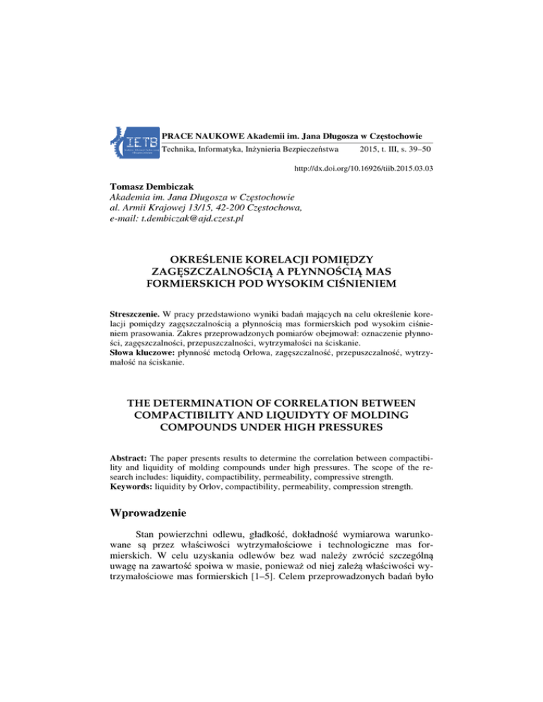 PRACE NAUKOWE Akademii im. Jana Długosza w Częstochowie Częstochowie Technika, Informatyka, Inżynieria In Bezpieczeństwa 2015, t. IIII, s. 39–50 http://dx.doi.org/10.16926/tiib.2015.03.03 doi.org/10.16926/tiib.2015.03.03 Tomasz Dembiczak Akademia im. Jana Długosza w Częstochowie al. l. Armii Krajowej 13/15, 42-200 42 Częstochowa, e-mail: [email protected] OKREŚLENIE KORELACJI POMIĘDZY OKRE ZAGĘSZCZ SZCZALNOŚCIĄ A PŁYNNOŚCIĄ MAS FORMIER RSKICH POD WYSOKIM CIŚNIENIEM NIENIEM Streszczenie. W pracy przedstawiono wyniki badań bada mających na celu lu określenie korekor lacji pomiędzy zagęszczalno ęszczalnością a płynnością mas formierskich pod wysokim ciśnieci niem prasowania. Zakres przeprowadzonych pomiarów obejmował: oznaczenie płynnopłynn ści, zagęszczalności, ci, przepuszczalności, przepuszczalno wytrzymałości na ściskanie. Słowa kluczowe: płynność płynno metodą Orłowa, zagęszczalność,, przepuszczalność, przepuszczalność wytrzymałość na ściskanie. THE DETERMINATION OF CORRELATION BETWEEN COMPACTIBILITY AND LIQUIDYTY LIQUIDYTY OF MOLDING COMPOUNDS UNDER HIGH PRESSURES Abstract: The paper presents results to determine the correlation between compactibicompactibi lity and liquidity of molding compounds under high pressures. The scope of the rer search includes: liquidity, compactibility, permeability, compressive strength. Keywords: liquidity by Orlov, compactibility, permeability, compression strength. strength Wprowadzenie Stan powierzchni odlewu, gładkość, dokładność wymiarowa warunkowane są przez właś właściwości wytrzymałościowe i technologiczne mas formierskich. W celu uzyskania odlewów bez wad należy nale zwrócićć szczególną szczególn uwagę na zawartość ść spoiwa w masie, poniewa ponieważ od niej zależą właściwo ciwości wytrzymałościowe ciowe mas formierskich [1 [1–5]. Celem przeprowadzonych badań bada było 40 T. Dembiczak określenie korelacji pomiędzy zagęszczalnością a płynnością mas formierskich pod wysokim ciśnieniem prasowania. Oceny tej zależności dokonano na podstawie przeprowadzonych badań laboratoryjnych w Katedrze Odlewnictwa Politechniki Częstochowskiej. Metodyka badań Do sporządzenia masy formierskiej z dodatkiem 12% mieszanki bentonitowej użyto następujących składników: − piasku kwarcowego – 5280 g, − mieszanki bentonitowej – 720 g, − wody: dla pierwszej masy 180 ml, dla drugiej – 230 ml, dla trzeciej – 280 ml. Wykonanie masy formierskiej przebiegało w trzech etapach. W etapie pierwszym mieszano składniki do uzyskania masy formierskiej w mieszarce bębnowej przedstawionej na rysunku 1. Czas mieszania wynosił 6 minut: − w pierwszej fazie mieszano suche składniki przez 2 minuty, − w drugiej fazie do mieszarki wprowadzono połowę wody przewidzianej dla danej masy i mieszano przez następne 2 minuty, − po upływie czasu mieszania do masy wprowadzono drugą połowę wody i mieszano przez 2 minuty. W etapie drugim masa formierska została umieszczona w szczelnie zamkniętym naczyniu, na 2 godziny, w celu ujednorodnienia wilgotności. W etapie trzecim przesiano masę formierską przez sito w celu rozbicia grudek i zlepów, tzw. spulchnienie. Po wykonaniu wszystkich zabiegów masa była gotowa do prowadzenia badań. Dokładnie tak samo postępowano z każdą masą. Na przygotowanej masie formierskiej dokonano następujących pomiarów: − wilgotności – dla pierwszej masy wyniosła 3%, dla drugiej 3,83% natomiast dla trzeciej 4,66%, − płynności metodą Orłowa – wykonano dla trzech mas o zmiennych zawartościach wilgoci i o zmiennym nacisku ciśnienia prasowania, − zagęszczalności – wykonano dla trzech mas o zmiennych zawartościach wilgoci i zmiennym nacisku ciśnienia prasowania, − przepuszczalności – wykonano dla masy pierwszej o zawartości wilgoci 3% i zmiennym nacisku ciśnienia prasowania, − wytrzymałości na ściskanie – wykonano przy zmiennym nacisku ciśnienia prasowania dla masy pierwszej o zawartości wilgoci 3%. 41 Określenie korelacji… Rys. 1. Mieszarka bębnowa znajdująca się w laboratorium Katedry Odlewnictwa Politechniki Częstochowskiej Oznaczenie zawartości wilgoci przy użyciu suszarki pośpiesznej Do oznaczenia zawartości wilgoci użyto wykonanej masy formierskiej. Do trzech naczynek wagowych odważono po 50 g masy, z dokładnością do 0 ,01 g. Następnie naczynka umieszczono w laboratoryjnej suszarce pośpiesznej typu Laps, przedstawionej na rysunku 2, w której czas suszenia wynosił 15 minut. Temperatura suszenia wynosiła ok. 250÷300ºC. Wysuszone próbki chłodzono w temperaturze pokojowej, a następnie ważono. Zawartość wilgoci w badanych próbkach obliczono wg wzoru [1]: W= (a − b ) ⋅100 [%] a (1) gdzie: a – masa próbki przed suszeniem (wilgotna) [g], b – masa próbki po suszeniu (sucha) [g]. Za wynik przyjęto średnią arytmetyczną z trzech oznaczeń. Rys. 2. Suszarka pośpieszna trójstanowiskowa typu LAPS 42 T. Dembiczak Wykonanie próbek z masy formierskiej do badań Szereg własności technicznych mas formierskich określa się na kształtkach laboratoryjnych. Kształtki walcowe służą do oznaczenia przepuszczalności, płynności, wytrzymałości na ściskanie [6]. Wykonanie kształtek walcowych przebiegało następująco: przygotowaną masę formierską wsypano do tulejki niedzielonej przy użyciu lejka (rys. 3a), następnie tulejkę wstawiono do gniazda roboczego w otwór centrujący praski typu LPr, przedstawionej na rysunku 3b. Praska ta jest przeznaczona do wykonania znormalizowanych kształtek walcowych o średnicy 50 × 50 ± 1 mm przy zmiennych naciskach jednostkowych w zakresie do 3 MPa, a przy zastosowaniu specjalnych podstawek do tulejek również do oznaczenia zagęszczalności mas i płynności. a) b) Rys. 3. Wykonanie próbek z masy formierskiej: a) zespół oprzyrządowania do wykonania kształtek walcowanych, b) praska typu LPr do wykonani