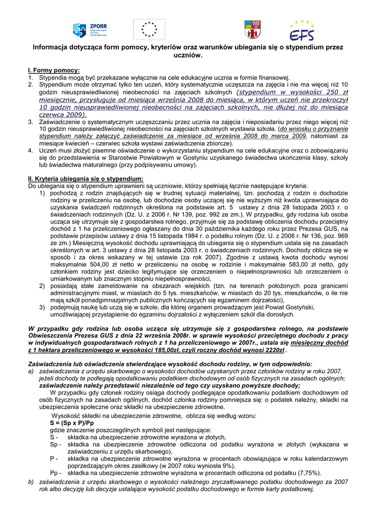 Informacja dotycząca form pomocy, kryteriów oraz warunków ubiegania się o stypendium przez uczniów. I. Formy pomocy: 1. Stypendia mogą być przekazane wyłącznie na cele edukacyjne ucznia w formie finansowej. 2. Stypendium moŜe otrzymać tylko ten uczeń, który systematycznie uczęszcza na zajęcia i nie ma więcej niŜ 10 godzin nieusprawiedliwionej nieobecności na zajęciach szkolnych (stypendium w wysokości 250 zł miesięcznie, przysługuje od miesiąca września 2008 do miesiąca, w którym uczeń nie przekroczył 10 godzin nieusprawiedliwionej nieobecności na zajęciach szkolnych, nie dłuŜej niŜ do miesiąca czerwca 2009). 3. Zaświadczenie o systematycznym uczęszczaniu przez ucznia na zajęcia i nieposiadaniu przez niego więcej niŜ 10 godzin nieusprawiedliwionej nieobecności na zajęciach szkolnych wystawia szkoła. (do wniosku o przyznanie stypendium naleŜy załączyć zaświadczenie za miesiące od września 2008 do marca 2009, natomiast za miesiące kwiecień – czerwiec szkoła wystawi zaświadczenia zbiorcze). 4. Uczeń musi złoŜyć pisemne oświadczenie o wykorzystaniu stypendium na cele edukacyjne oraz o zobowiązaniu się do przedstawienia w Starostwie Powiatowym w Gostyniu uzyskanego świadectwa ukończenia klasy, szkoły lub świadectwa maturalnego (przy podpisywaniu umowy). II. Kryteria ubiegania się o stypendium: Do ubiegania się o stypendium uprawnieni są uczniowie, którzy spełniają łącznie następujące kryteria: 1) pochodzą z rodzin znajdujących się w trudnej sytuacji materialnej, tzn. pochodzą z rodzin o dochodzie rodziny w przeliczeniu na osobę, lub dochodzie osoby uczącej się nie wyŜszym niŜ kwota uprawniająca do uzyskania świadczeń rodzinnych określona na podstawie art. 5 ustawy z dnia 28 listopada 2003 r. o świadczeniach rodzinnych (Dz. U. z 2006 r. Nr 139, poz. 992 ze zm.). W przypadku, gdy rodzina lub osoba ucząca się utrzymuje się z gospodarstwa rolnego, przyjmuje się za podstawę obliczenia dochodu przeciętny dochód z 1 ha przeliczeniowego ogłaszany do dnia 30 października kaŜdego roku przez Prezesa GUS, na podstawie przepisów ustawy z dnia 15 listopada 1984 r. o podatku rolnym (Dz. U. z 2006 r. Nr 136, poz. 969 ze zm.) Miesięczną wysokość dochodu uprawniającą do ubiegania się o stypendium ustala się na zasadach określonych w art. 3 ustawy z dnia 28 listopada 2003 r. o świadczeniach rodzinnych. Dochody oblicza się w sposób i za okres wskazany w tej ustawie (za rok 2007). Zgodnie z ustawą kwota dochodu wynosi maksymalnie 504,00 zł netto w przeliczeniu na osobę w rodzinie i maksymalnie 583,00 zł netto, gdy członkiem rodziny jest dziecko legitymujące się orzeczeniem o niepełnosprawności lub orzeczeniem o umiarkowanym lub znacznym stopniu niepełnosprawności, 2) posiadają stałe zameldowanie na obszarach wiejskich (tzn. na terenach połoŜonych poza granicami administracyjnymi miast, w miastach do 5 tys. mieszkańców, w miastach do 20 tys. mieszkańców, o ile nie mają szkół ponadgimnazjalnych publicznych kończących się egzaminem dojrzałości), 3) podejmują naukę lub uczą się w szkole, dla której organem prowadzącym jest Powiat Gostyński, umoŜliwiającej przystąpienie do egzaminu dojrzałości z wyłączeniem szkół dla dorosłych. W przypadku gdy rodzina lub osoba ucząca się utrzymuje się z gospodarstwa rolnego, na podstawie Obwieszczenia Prezesa GUS z dnia 22 września 2008r. w sprawie wysokości przeciętnego dochodu z pracy w indywidualnych gospodarstwach rolnych z 1 ha przeliczeniowego w 2007r., ustala się miesięczny dochód z 1 hektara przeliczeniowego w wysokości 185,00zł, czyli roczny dochód wynosi 2220zł . Zaświadczenia lub oświadczenia stwierdzające wysokość dochodu rodziny, w tym odpowiednio: a) zaświadczenia z urzędu skarbowego o wysokości dochodów uzyskanych przez członków rodziny w roku 2007, jeŜeli dochody te podlegają opodatkowaniu podatkiem dochodowym od osób fizycznych na zasadach ogólnych; zaświadczenie naleŜy przedstawić niezaleŜnie od tego czy uzyskano powyŜsze dochody; W przypadku gdy członek rodziny osiąga dochody podlegające opodatkowaniu podatkiem dochodowym od osób fizycznych na zasadach ogólnych, dochód członka rodziny pomniejsza się: o podatek naleŜny, składki na ubezpieczenia społeczne oraz składki na ubezpieczenie zdrowotne. Wysokość składki na ubezpieczenie zdrowotne, oblicza się według wzoru: S = (Sp x P)/Pp gdzie znaczenie poszczególnych symboli jest następujące: Sskładka na ubezpieczenie zdrowotne wyraŜona w złotych, Sp - składka na ubezpieczenie zdrowotne odliczona od podatku wyraŜona w złotych (wykazana w zaświadczeniu z urzędu skarbowego), Pskładka na ubezpieczenie zdrowotne wyraŜona w procentach obowiązująca w roku kalendarzowym poprzedzającym okres zasiłkowy (w 2007 roku wyniosła 9%), Pp - składka na ubezpieczenie zdrowotne wyraŜona w procentach odliczona od podatku (7,75%). b) zaświadczenia z urzędu skarbowego o wysokości naleŜnego zryczałtowanego podatku dochodowego za 2007 rok albo decyzję lub decyzje ustalające wysokość podatku dochodowego w formie karty podatkowej, c) oświadczenia członków rodziny o wysokości uzyskanego dochodu w roku 2007, jeŜeli członkowie rodziny rozliczają się na podstawie przepisów o zryczałtowanym podatku dochodowym od niektórych przychodów osiąganych przez osoby fizyczne, d) oświadczenia członków rodziny o wysokości uzyskanego w roku 2007 innego dochodu niepodlegającego opodatkowaniu; e) zaświadczenie właściwego organu gminy o wielkości gospodarstwa rolnego wyraŜonej w hektarach przeliczeniowych ogólnej powierzchni w roku 2007 lub nakaz płatniczy za 2007 rok, f) umowę dzierŜawy, w przypadku oddania części lub całości znajdującego się w posiadaniu rodziny gospodarstwa rolnego w dzierŜawę, na podstawie umowy zawartej stosownie do przepisów o ubezpieczeniu społecznym rolników, albo oddania go
