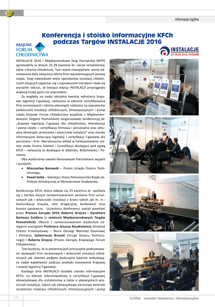 informacje ogólne Konferencja i stoisko informacyjne KFCh podczas Targów INSTALACJE 2016 INSTALACJE 2016 – Międzynarodowe Targi Poznańskie (MTP) zgromadziły w dniach 25-28 kwietnia br. rzesze instalatorów, także z branży chłodniczej. Tym razem niewątpliwie warta odnotowania była zwłaszcza oferta firm reprezentujących pompy ciepła. Targi odwiedzało wielu operatorów instalacji chłodniczych chcących zapoznać się z najnowszymi trendami i dało się wyraźnie odczuć, że bieżąca edycja INSTALACJI przyciągnęła większą liczbę gości niż poprzednia . Ze względu na nadal aktualną kwestię wdrażania krajowej legislacji f-gazowej, zwłaszcza w zakresie certyfikowania firm serwisowych i istotne obowiązki nałożone na operatorów (właścicieli) instalacji chłodniczych, klimatyzacyjnych i pomp ciepła Krajowe Forum Chłodnictwa wspólnie z Międzynarodowymi Targami Poznańskimi zorganizowało Konferencję pt: „Krajowa legislacja f-gazowa dla chłodnictwa, klimatyzacji i pomp ciepła – certyfikacja firmowa i personalna oraz aktualne obowiązki serwisanta i właściciela instalacji” oraz stoisko informacyjne dotyczące legislacji i certyfikacji f-gazowej dla personelu i firm. Merytoryczny wkład w funkcjonowanie stoiska miały Centra Szkoleń i Certyfikacji działające pod egidą KFCh – zwłaszcza te działające w Gdańsku, Białymstoku i Poznaniu. Oba wydarzenia swoimi Honorowymi Patronatami wsparli i wyróżnili: • Mieczysław Borowski – Prezes Urzędu Dozoru Technicznego, • Paweł Sałek – Sekretarz Stanu Pełnomocnika Rządu ds. Polityki Klimatycznej w Ministerstwie Środowiska. Konferencja KFCh, która odbyła się 25 kwietnia br. spotkała się z bardzo dużym zainteresowaniem zarówno firm serwisowych jak i właścicieli instalacji z branż takich jak m. in.: komunikacja miejska, sieci drogeryjne, bankowość oraz branża spożywcza. Uczestnicy Konferencji zostali powitani przez Prezesa Zarządu KFCh Roberta Grejcza i Dyrektora Bartosza Zeidlera (z ramienia Międzynarodowych Targów Poznańskich). Obecni z zainteresowaniem wysłuchali następnie wystąpień Profesora Janusza Kozakiewicza (Instytut Chemii Przemysłowej – Biuro Obsługi Warstwy Ozonowej i Klimatu), Sylweriusza Brzuski (Urząd Dozoru Technicznego) i Roberta Grejcza (Prezes Zarządu Krajowego Forum Chłodnictwa). Tym bardziej, że w prezentacjach precyzyjnie podsumowano obowiązki firm serwisowych i właścicieli instalacji chłodniczych jak również podjęto dyskusyjne kwestie wzbudzające nadal wątpliwości podczas praktyki stosowania krajowej i unijnej legislacji f-gazowej. Każdego dnia INSTALACJI działało stoisko informacyjne KFCh, na którym informowaliśmy o certyfikacji f-gazowej obowiązkowej dla instalatorów a także o obowiązkach właścicieli instalacji, takich jak obowiązkowe okresowe kontrole szczelności instalacji chłodniczych, klimatyzacyjnych i pomp 176 5/2016 technika chłodnicza i klimatyzacyjna informacje ogólne technika chłodnicza i klimatyzacyjna 5/2016 177 informacje ogólne ciepła oraz możliwości zlecania serwisowania instalacji chłodniczych jedynie osobom i firmom zaopatrzonym w certyfikaty f-gazowe. Jak zawsze przy okazji takich wydarzeń działała Kawiarenka KFCh dostępna dla Cżłonków KFCh, w której dyskutowano bieżące kwestie związane z działaniem firm oraz podtrzymywano i nawiązywano kontakty. Firmy dobrze poinformowane i działające zgodnie z obowiązującymi przepisami będą zawsze mogły właściwie współpracować z władzami i nie muszą obawiać się kontroli ze strony inspekcji ochrony środowiska (www. kfch.pl/szkolenia/terminy-szkolen). & 178 5/2016 technika chłodnicza i klimatyzacyjna