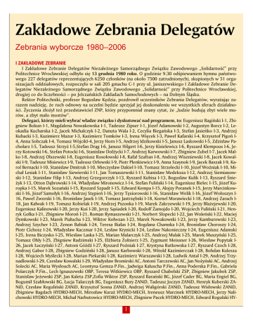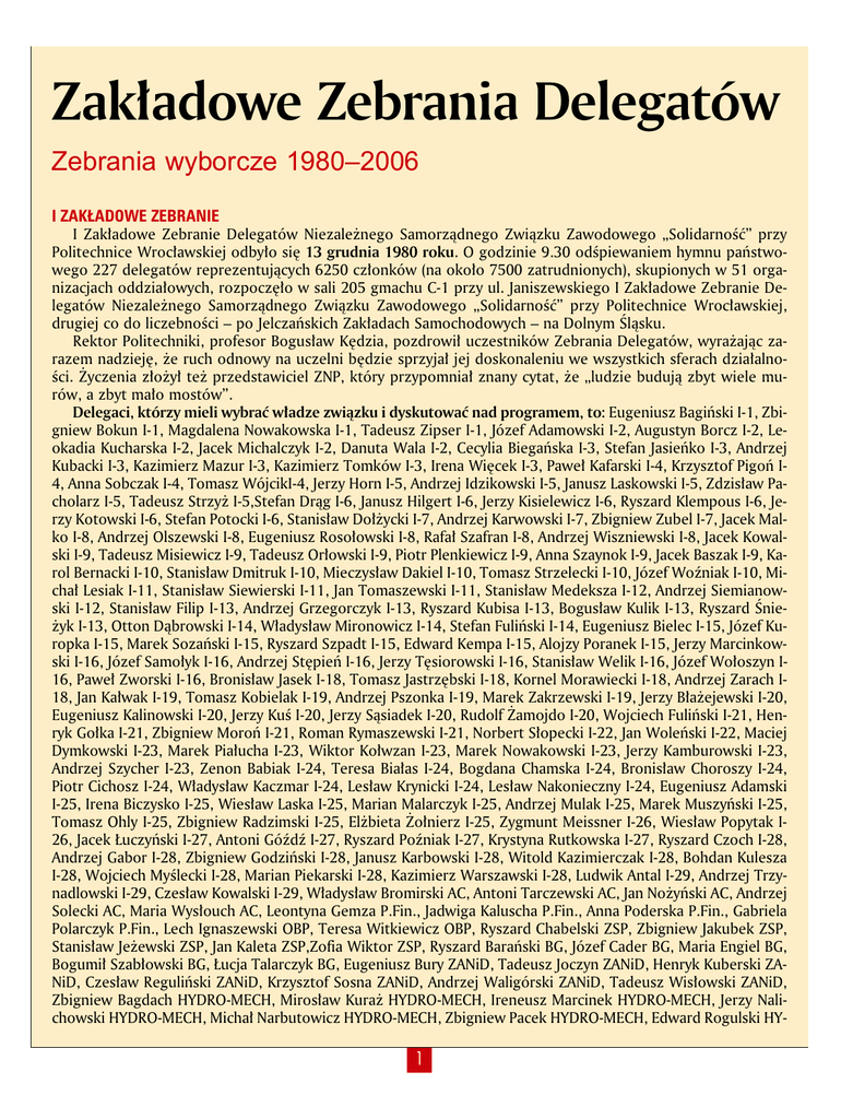 Zakładowe Zebrania Delegatów Zebrania wyborcze 1980–2006 I ZAK£ADOWE ZEBRANIE I Zakładowe Zebranie Delegatów Niezależnego Samorządnego Związku Zawodowego „Solidarność” przy Politechnice Wrocławskiej odbyło się 13 grudnia 1980 roku. O godzinie 9.30 odśpiewaniem hymnu państwowego 227 delegatów reprezentujących 6250 członków (na około 7500 zatrudnionych), skupionych w 51 organizacjach oddziałowych, rozpoczęło w sali 205 gmachu C-1 przy ul. Janiszewskiego I Zakładowe Zebranie Delegatów Niezależnego Samorządnego Związku Zawodowego „Solidarność” przy Politechnice Wrocławskiej, drugiej co do liczebności – po Jelczańskich Zakładach Samochodowych – na Dolnym Śląsku. Rektor Politechniki, profesor Bogusław Kędzia, pozdrowił uczestników Zebrania Delegatów, wyrażając zarazem nadzieję, że ruch odnowy na uczelni będzie sprzyjał jej doskonaleniu we wszystkich sferach działalności. Życzenia złożył też przedstawiciel ZNP, który przypomniał znany cytat, że „ludzie budują zbyt wiele murów, a zbyt mało mostów”. Delegaci, którzy mieli wybrać władze związku i dyskutować nad programem, to: Eugeniusz Bagiński I-1, Zbigniew Bokun I-1, Magdalena Nowakowska I-1, Tadeusz Zipser I-1, Józef Adamowski I-2, Augustyn Borcz I-2, Leokadia Kucharska I-2, Jacek Michalczyk I-2, Danuta Wala I-2, Cecylia Biegańska I-3, Stefan Jasieńko I-3, Andrzej Kubacki I-3, Kazimierz Mazur I-3, Kazimierz Tomków I-3, Irena Więcek I-3, Paweł Kafarski I-4, Krzysztof Pigoń I4, Anna Sobczak I-4, Tomasz WójcikI-4, Jerzy Horn I-5, Andrzej Idzikowski I-5, Janusz Laskowski I-5, Zdzisław Pacholarz I-5, Tadeusz Strzyż I-5,Stefan Drąg I-6, Janusz Hilgert I-6, Jerzy Kisielewicz I-6, Ryszard Klempous I-6, Jerzy Kotowski I-6, Stefan Potocki I-6, Stanisław Dołżycki I-7, Andrzej Karwowski I-7, Zbigniew Zubel I-7, Jacek Malko I-8, Andrzej Olszewski I-8, Eugeniusz Rosołowski I-8, Rafał Szafran I-8, Andrzej Wiszniewski I-8, Jacek Kowalski I-9, Tadeusz Misiewicz I-9, Tadeusz Orłowski I-9, Piotr Plenkiewicz I-9, Anna Szaynok I-9, Jacek Baszak I-9, Karol Bernacki I-10, Stanisław Dmitruk I-10, Mieczysław Dakiel I-10, Tomasz Strzelecki I-10, Józef Woźniak I-10, Michał Lesiak I-11, Stanisław Siewierski I-11, Jan Tomaszewski I-11, Stanisław Medeksza I-12, Andrzej Siemianowski I-12, Stanisław Filip I-13, Andrzej Grzegorczyk I-13, Ryszard Kubisa I-13, Bogusław Kulik I-13, Ryszard Śnieżyk I-13, Otton Dąbrowski I-14, Władysław Mironowicz I-14, Stefan Fuliński I-14, Eugeniusz Bielec I-15, Józef Kuropka I-15, Marek Sozański I-15, Ryszard Szpadt I-15, Edward Kempa I-15, Alojzy Poranek I-15, Jerzy Marcinkowski I-16, Józef Samołyk I-16, Andrzej Stępień I-16, Jerzy Tęsiorowski I-16, Stanisław Welik I-16, Józef Wołoszyn I16, Paweł Zworski I-16, Bronisław Jasek I-18, Tomasz Jastrzębski I-18, Kornel Morawiecki I-18, Andrzej Zarach I18, Jan Kałwak I-19, Tomasz Kobielak I-19, Andrzej Pszonka I-19, Marek Zakrzewski I-19, Jerzy Błażejewski I-20, Eugeniusz Kalinowski I-20, Jerzy Kuś I-20, Jerzy Sąsiadek I-20, Rudolf Żamojdo I-20, Wojciech Fuliński I-21, Henryk Gołka I-21, Zbigniew Moroń I-21, Roman Rymaszewski I-21, Norbert Słopecki I-22, Jan Woleński I-22, Maciej Dymkowski I-23, Marek Piałucha I-23, Wiktor Kołwzan I-23, Marek Nowakowski I-23, Jerzy Kamburowski I-23, Andrzej Szycher I-23, Zenon Babiak I-24, Teresa Białas I-24, Bogdana Chamska I-24, Bronisław Choroszy I-24, Piotr Cichosz I-24, Władysław Kaczmar I-24, Lesław Krynicki I-24, Lesław Nakonieczny I-24, Eugeniusz Adamski I-25, Irena Biczysko I-25, Wiesław Laska I-25, Marian Malarczyk I-25, Andrzej Mulak I-25, Marek Muszyński I-25, Tomasz Ohly I-25, Zbigniew Radzimski I-25, Elżbieta Żołnierz I-25, Zygmunt Meissner I-26, Wiesław Popytak I26, Jacek Łuczyński I-27, Antoni Góźdź I-27, Ryszard Poźniak I-27, Krystyna Rutkowska I-27, Ryszard Czoch I-28, Andrzej Gabor I-28, Zbigniew Godziński I-28, Janusz Karbowski I-28, Witold Kazimierczak I-28, Bohdan Kulesza I-28, Wojciech Myślecki I-28, Marian Piekarski I-28, Kazimierz Warszawski I-28, Ludwik Antal I-29, Andrzej Trzynadlowski I-29, Czesław Kowalski I-29, Władysław Bromirski AC, Antoni Tarczewski AC, Jan Nożyński AC, Andrzej Solecki AC, Maria Wysłouch AC, Leontyna Gemza P.Fin., Jadwiga Kaluscha P.Fin., Anna Poderska P.Fin., Gabriela Polarczyk P.Fin., Lech Ignaszewski OBP, Teresa Witkiewicz OBP, Ryszard Chabelski ZSP, Zbigniew Jakubek ZSP, Stanisław Jeżewski ZSP, Jan Kaleta ZSP,Zofia Wiktor ZSP, Ryszard Barański BG, Józef Cader BG, Maria Engiel BG, Bogumił Szabłowski BG, Łucja Talarczyk BG, Eugeniusz Bury ZANiD, Tadeusz Joczyn ZANiD, Henryk Kuberski ZANiD, Czesław Reguliński ZANiD, Krzysztof Sosna ZANiD, Andrzej Waligórski ZANiD, Tadeusz Wisłowski ZANiD, Zbigniew Bagdach HYDRO-MECH, Mirosław Kuraż HYDRO-MECH, Ireneusz Marcinek HYDRO-MECH, Jerzy Nalichowski HYDRO-MECH, Michał Narbutowicz HYDRO-MECH, Zbigniew Pacek HYDRO-MECH, Edward Rogulski HY- 1 ZAK£ADOWE ZEBRANIA DELEGATÓW DRO-MECH, Zdzisław Tamiła HYDRO-MECH, Jan Trzcionkowski HYDRO-MECH, Andrzej Wingert HYDRO-MECH, Antoni Zakrzewski HYDRO-MECH, Regina Błaszczyńska Z.Graf., Piotr Tymczak Z.Graf., Roman Jasicki Dz.T., Leszek Kubiszewski Dz.T., Ireneusz Socha Dz.T., Alicja Kordas Wyd.PWr., Ewa Winkowska Wyd.PWr., Jadwiga Krawiec ZRB, Tadeusz Meysner ZRB, Janusz Niwiński ZRB, Kosman Suchowski ZRB, Hieronim Wieczorek ZRB, Maria Czarnecka SWF, Borys Mołdawan SWF, Bohdan Rusowicz SWF, Maria Buck SPNJO, Marian Górecki SPNJO, Jadwiga Kuberska SPNJO, Ewa Kisiel P.Tech., Jerzy Mierzyński P.Tech., Łukasz Wojewoda P.Tech., Czesław Bałkun D.AG., Genowefa Gregorek D.A-G., Krystyna Grząska D.A-G., Janina Góralik D.A-G., Maria Janiec D.A-G., Teresa Jaśkiewicz D.A-G., Alina Kowalska D.A-G., Maria Mackiewicz D.A-G., Bożena Muras D.A-G., Józef Partyka D.A-G., Elwira Romanów D.A-G., Stanisław Samojło D.A-G., Mirosława Skierś D.A-G., Jadwiga Winnik