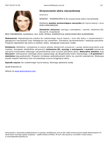2017-03-03 12:28 www.artofbeauty.com.pl 1/1 Oczyszczanie skóry naczynkowej 09.09.2013 NOWOŚĆ - PHARMACERIS N do oczyszczania skóry naczynkowej Delikatna pianka wzmacniająca naczynka do mycia twarzy i oczu PURI-CAPILIQMUSSE Składniki aktywne: wyciąg z ostropestu i aceroli, witamina B3, Glucam®, D-pantenol BEZ/ PARABENÓW, ALKOHOLU, SLS, SLES, MYDŁA. KOMPOZYCJA ZAPACHOWA BEZ ALERGENÓW. Wskazania: Hipoalergiczna pianka do codziennego mycia twarzy i oczu dla skóry z rozszerzonymi i pękającymi naczynkami oraz nasilającym się rumieniem. Zmniejsza zaczerwienienie i redukuje pieczenie. Preparat odpowiedni dla skóry w każdym wieku. Zastępuje tradycyjne mydło. Działanie: Delikatna i przyjemna w użyciu pianka skutecznie oczyszcza i usuwa zanieczyszczenia oraz makijaż. Kompleks składników aktywnych (witamina B3, wyciąg z ostropestu i aceroli) wzmacnia naczynia krwionośne redukując zaczerwienienia oraz uczucie pieczenia skóry. Naturalna betaina oraz Glucam® intensywnie nawilżają skórę zapewniając jej długotrwałą hydro-równowagę, a D-pantenol i alantoina koją podrażnień. Preparat zmniejsza nadreaktywność skóry na czynniki zewnętrzne. Wykazuje wysoki stopień tolerancji oraz nie powoduje uczucia ściągnięcia skóry. Sposób użycia: Do codziennego mycia twarzy. Wymaga spłukania wodą. 28,90 PLN/150 ml Więcej na www.pharmaceris.com Korzystanie z artykułów publikowanych w portalu artofbeauty.com.pl dla celów komercyjnych bądź dokonywanie ich opracowań wymaga zgody wydawcy - spółki Estetica Polska. W tym celu prosimy o kontakt z Ewą Cesarz, [email protected]