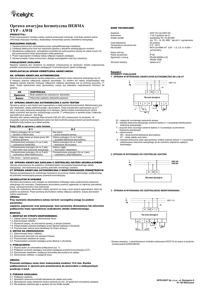 A OBSŁUGI INSTRUKCJA MONTAŻU Oprawa awaryjna hermetyczna HERMA TYP - AWH PRZECZYTAJ Przed rozpoczęciem montażu należy uważnie przeczytać instrukcję. Instrukcja zawiera ważne informacje dotyczące montażu, eksploatacji i konserwacji oprawy oświetlenia awaryjnego. WSKAZÓWKI OGÓLNE: 1. Oprawa powinna być zamontowana przez wykwalifikowanego instalatora. 2. Instalacja elektryczna musi być wykonana zgodnie z aktualnie obowiązującymi normami 3. Niewłaściwe podłączenie, samodzielne przeróbki lub wykorzystanie oprawy do celów innych niż jest przeznaczona może spowodować utratę gwarancji. 4. Przed rozpoczęciem instalacji należy odłączyć napięcie zasilające. 5. Oprawa posiada I klasę ochronności, dlatego bezwzględnie musi być uziemiona. DANE TECHNICZNE: Zasilanie Autonomia Źródło światła Czas ładowania Temperatura otoczenia (ta) Akumulator Klasa ochrony Klasa szczelności Zgodność z normą : 230V AC lub 220V DC : 1 lub 3 godziny (str.2) : świetlówka T8 -18,36,58W lub T5 – 14, 28, 49W tab.str.2 - wymienialne : 24 godziny : 5°C - 40°C : NiCd lub NiMh HT 3,6V - 1,5; 2,5; 4; 4,5Ah – wymienialny : I : IP 65 : PN-EN 60598-2-22, PN-EN 1838 : tabela str.2 PODŁĄCZENIE ZASILANIA Napięcie zasilania jest określone na etykiecie umieszczonej na obudowie. Kostka połączeniowa posiada oznaczenia przewodów zasilających i komunikacyjnych (jeżeli występują). Strumień świetlny EKSPLOATACJA OPRAW OŚWIETLENIA AWARYJNEGO Rysunek 1 SCHEMATY PODŁĄCZEŃ 1. OPRAWA W WYKONANIU AWARYJNYM AUTONOMICZNA AN LUB AT AN OPRAWA AWARYJNA AUTONOMICZNA Zalecane jest przetestowanie oprawy połączone z pomiarem czasu świecenia awaryjnego raz na 6 miesięcy poprzez odłączenie napięcia sieciowego. Co siedem dni należy przeprowadzić test działania oprawy poprzez chwilowe odłączenie napięcia sieciowego lub za pomocą przycisku „T” (test). Przed wykonaniem testu akumulatory muszą być ładowane nieprzerwanie minimum 24 godziny. AN Zgaszona Świeci KONTROLKA Brak zasilania lub uszkodzona ładowarka Obecność zasilania, ładowarka sprawna AT OPRAWA AWARYJNA AUTONOMICZNA Z AUTO TESTEM Oprawa w wersji z auto testem jest wyposażona w układ autonomicznej kontroli. Monitorowany jest stan świetlówki, układu elektronicznego i akumulatora. Testy funkcjonalne wykonywane są co 7 dni, a test czasu świecenia awaryjnego co 6 miesięcy. Oprócz testów automatycznych można także uruchomić test ręcznie, przytrzymując przycisk „T” umieszczony w oprawie przez 3 sekundy test krótki lub 5 sekund – test długi. Aktualny stan oprawy wskazują dwie kontrolki LED (D1,D2) umieszczone na obudowie. W przypadku wykrycia nieprawidłowości jedna lub dwie kontrolki pulsują kolorem pomarańczowym. Dokładne kody podane są w tabeli poniżej. Kody LED w oprawie z auto testem D1 Zielony pulsujący (3x co 3 sek): – oprawa w trakcie testu. Zielony ciągły świeci po teście przez 24h – oprawa sprawna. Pomarańczowy pulsujący (1x co 3 sek): – uszkodzona świetlówka. Pomarańczowy pulsujący (2x co 3 sek): – zbyt krótki czas świecenia awaryjnego. Pomarańczowy pulsujący (3x co 3 sek): – uszkodzony układ elektroniczny. Nie świeci – oprawa sprawna D2 Nie świeci: – praca awaryjna oprawy. Zielony pulsujący (1x co 3 sek): – początek ładowania akumulatora. Zielony pulsujący (3x co 3 sek): – ładowanie akumulatora. Zielony ciągły: – akumulator naładowany. Pomarańczowy pulsujący (3x co 3 sek): – uszkodzony układ ładowania. W – wyłącznik normalnego świecenia oprawy B – blokada świecenia awaryjnego (zwarcie styków 2 i 3 powoduje zablokowanie świecenia awaryjnego) T – przycisk testu ręcznego (zwarcie styków 2 i 4 powoduje uruchomienie świecenia awaryjnego) K – układ kontroli: AN – dioda kontroli ładowania akumulatora AT – diody układu auto testu S – blokada techniczna (stan spoczynkowy- krótkie zwarcie styków 1 i 2 powoduje zablokowanie świecenia awaryjnego aż do momentu włączenia napięcia sieciowego) 2. OPRAWA W WYKONANIU DO CENTRALNEJ BATERII CB OPRAWA AWARYJNA ZASILANA Z CENTRALNEJ BATERII AKUMULATORÓW Oprawa przeznaczona do zasilania z centralnej baterii nie posiada indywidualnego układu testującego. Jest testowana przy pomocy jednostki centralnego zasilania CT OPRAWA AWARYJNA AUTONOMICZNA Z MONITOROWANIEM ZEWNĘTRZNYM Oprawa przystosowana do centralnego testowania za pomocą modułu adresowego, podłączonego do jednostki monitorującej poprzez przewód komunikacyjny. AKUMULATOR W OPRAWIE Wymiana akumulatora musi nastąpić po stwierdzeniu krótszego czasu podtrzymania świecenia awaryjnego niż nominalny. Zastosowane akumulatory powinny zapewniać co najmniej czteroletnią pracę oprawy(nominalny czas świecenia). Zużyty lub uszkodzony akumulator należy wymienić na nowy o tych samych parametrach, które są podane na etykiecie. Przed wymianą akumulatora należy odłączyć zasilanie. Zużyty akumulator należy zutylizować. UWAGA: Przy wymianie akumulatora należy zwrócić szczególną uwagę na podane parametry: napięcie, pojemność oraz polaryzację. Inne parametry akumulatora lub odwrotnie podłączenie może spowodować uszkodzenie układu elektronicznego. MONTAŻ. 1. MONTAŻ DO STROPU BEZPOŚREDNIO: 1.1. Odpiąć klamry mocujące zdemontować klosz . 1.2. Zdemontować reflektor. 1.3. Wywiercić otwory, do mocowania oprawy, w stropie (ścianie). 1.4. Przeprowadzić przewód zasilający przez dławicę kablową w obudowie. 1.5. Przymocować osłonę tylną (obudowę) do stropu (ściany). 2. MNTAŻ NA ZWIESZAKACH: 2.1. Zdemontować klosz i reflektor. 2.2. Zamocować łańcuszki lub zawiesia linkowe. 2.3. Przymocować zawiesia do stropu. 2.4. Przeprowadzić przewód zasilający przez dławicę w obudowie. 3. PODŁĄCZENIE: 3.1. Wybrać jeden ze schematów podłączenia (rys. 1). 3.2. Podłączyć przewód zasilający oraz jeżeli występuje przewód komunikacyjny (CT) 3.3. Zamontować świetlówki 