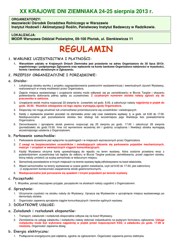 XX KRAJOWE DNI ZIEMNIAKA 24-25 sierpnia 2013 r. ORGANIZATORZY: Mazowiecki Ośrodek Doradztwa Rolniczego w Warszawie Instytut Hodowli i Aklimatyzacji Roślin, Państwowy Instytut Badawczy w Radzikowie. LOKALIZACJA: MODR Warszawa Oddział Poświętne, 09-100 Płońsk, ul. Sienkiewicza 11 REGULAMIN 1. WARUNKI UCZESTNICTWA I PŁATNOŚCI: 1. Warunkiem udziału w Krajowych Dniach Ziemniaka jest przesłanie na adres Organizatora do 30 lipca 2013r. wypełnionego i podpisanego Zgłoszenia oraz wpłacenie na konto bankowe Organizatora należności w wysokości, formie i terminie określonym w Zgłoszeniu. 2. PRZEPISY ORGANIZACYJNE I PORZĄDKOWE: a. Stoisko: 1. Lokalizacja stoiska wynika z projektu zagospodarowania powierzchni wystawienniczej i ewentualnych życzeń Wystawcy, realizowanych w miarę możliwości przez Organizatora. 2. Zajęcie miejsca wystawowego i urządzanie stoiska może odbywać się po zameldowaniu w Biurze Targów i okazaniu potwierdzenia dokonania pełnej opłaty za uczestnictwo. Z uzyskanym numerem stoiska należy zgłosić się do pracownika w sektorze. 3. Urządzanie stoisk można rozpocząć 22 sierpnia br. (czwartek) od godz. 8.00, a zakończyć należy najpóźniej w piątek do godz. 20.00. Wszelkie odstępstwa od tego zapisu wymagają zgody Organizatora. 4. Eksponaty nie mogą utrudniać lub uniemożliwiać przemieszczania się uczestników i zwiedzajacych. 5. Każdy z wystawców powinien pozostać na stanowisku przez cały czas zwiedzania wystawy. tj. w godz. od 9.00 do 17.00. Niedopuszczalne jest pozostawianie stoiska bez obsługi lub wcześniejsza jego likwidacja bez powiadomienia Organizatora. 6. Demontowanie i sprzątanie stoisk powinno rozpocząć się 25 sierpnia po godz. 17.00 i zakończyć 26 sierpnia (poniedziałek) do godz.15.00. Inne niż wymienione wcześniej dni i godziny urządzania i likwidacji stoiska wymagają wcześniejszego ustalenia z Organizatorem. b. Parkowanie samochodów: 1. Parkowanie dozwolone jest wyłącznie na parkingach i w miejscach wyznaczonych przez Organizatora. 2. Z uwagi na bezpieczeństwo uczestników i zwiedzających zabrania się parkowania pojazdów mechanicznych, maszyn i urządzeń w wewnętrznych ciągach komunikacyjnych. 3. Każdy Wystawca otrzyma kartę upoważniającą do wjazdu na teren wystawy, która zostanie przesłana wraz z potwierdzeniem uczestnictwa lub będzie do odbioru w Biurze Targów podczas zameldowania, przed zajęciem stoiska, którą należy umieścić za szybą samochodu w widocznym miejscu. 4. Samochody pozostawione w innych miejscach na terenie wystawy będą odholowywane na koszt właściciela. 5. Wjazd samochodów na tereny wystawowe w czasie godzin zwiedzania, czyli od 9.00 do 17.00, jest zabroniony (z wyłączeniem konieczności zaopatrzenia stoisk gastronomicznych). 6. Niedopuszczalne jest poruszanie się quadami i innymi pojazdami po terenie wystawy. c. Poczęstunki: 1. Wszelkie, ponad zwyczajowo przyjęte, poczęstunki na stoiskach należy uzgodnić z Organizatorem. d. Sprzątanie: 1. Utrzymanie czystości na stoisku należy do Wystawcy. Uprasza się Wystawców o uprzątnięcie miejsca wystawowego po demontażu stoiska. 2. Organizator zapewnia sprzątanie ciągów komunikacyjnych i terenów ogólnych wystawy. 3. DODATKOWE USŁUGI: a. Załadunek i rozładunek eksponatów: 1. Transport, załadunek i rozładunek eksponatów odbywa się na koszt Wystawcy. 2. Zamówienia na usługę załadunku i rozładunku należy dokonać indywidualnie na podanym formularzu zgłoszenia. Usługa rozładunku może być wykonana najpóźniej w piątek przed rozpoczęciem KDZ, a załadunku po godz. 17.00 w niedzielę. Organizator zapewnia dźwig. b. Energia elektryczna: 1. Podłączenie energetyczne jest odpłatne, zgodne ze zgłoszeniem. Organizator zapewnia pomoc elektryka. 2. Ze względu na bezpieczeństwo, Wystawcy zobowiązani są do wyłączania zasilania w energię elektryczną swojego stoiska - każdorazowo przed jego opuszczeniem. 3. Warunkiem korzystania z zamówionego przyłącza energetycznego jest posiadanie własnego przedłużacza o długości min 20 m. c. Reklama: 1. Wystawca ma prawo reklamowania swoich towarów wyłącznie na terenie własnego stoiska. 2. Pokazy pracy sprzętu, prezentacje, działania reklamowe i rozrywkowe na stoiskach Wystawców mogą odbywać się jedynie za wcześniejszą zgodą Organizatora. Nie mogą one przeszkadzać innym Wystawcom ani zakłócać ogólnego programu wystawy. 3. Organizator zapewnia nagłośnienie terenów wystawowych. 4. Dodatkowa reklama w katalogu, lub nagłośnieniu, wg złożonego zamówienia w Zgłoszeniu. d. Katalog: 1. Wpis do katalogu targowego jest nieodpłatny i obowiązkowy dla każdego Wystawcy. Wg treści wpisu Wystawca jest klasyfikowany do poszczególnej branży katalogu. Każda firma, której wpis lub reklama jest umieszczona w katalogu otrzyma bezpłatnie 1 egzemplarz katalogu. d. Wyżywienie: 1. Organizatorzy zapewniają możliwość skorzystania z wyżywienia w punktach gastronomicznych i restauracji. 4. BEZPIECZEŃSTWO I OCHRONA: 1. Organizator posiada polisę OC na czas trwania Targów. 2. Organizator nie ponosi odpowiedzialności za wypadki osób, uszkodzenia czy zniszczenia eksponatów w trakcie urządzania, trwania czy likwidacji wystawy. 3. Ogólną ochronę terenów wystawowych poza czasem zwiedzania wystawy, zapewnia Organizator. 4. Ochrona pracuje od 16.00 do 10.00. W godzinach 16.00-17.00 i 9.00-10.00 należy zgłaszać pracownikom ochrony dodatkowe uwagi. 5. W godzinach zwiedzania czyli od 9.00-17.00 za nadzór i ochronę swojego stoiska odpowiedzialny jest Wystawca. Organizator nie odpowiada za mienie pozostawione na stoisku opuszczonym chwilowo przez Wystawcę. 6. Wystawcy zaleca się ubezpieczenie mienia we własnym zakresie. 7. Poza godzinami zwiedzania sprzęt wartościowy, a łatwy w demontażu, Wystawca powinien zabezpieczyć we własnym zakresie. 8. Przebywanie na terenie Targów po godzinach zwiedzania czyli po godz. 17.00
