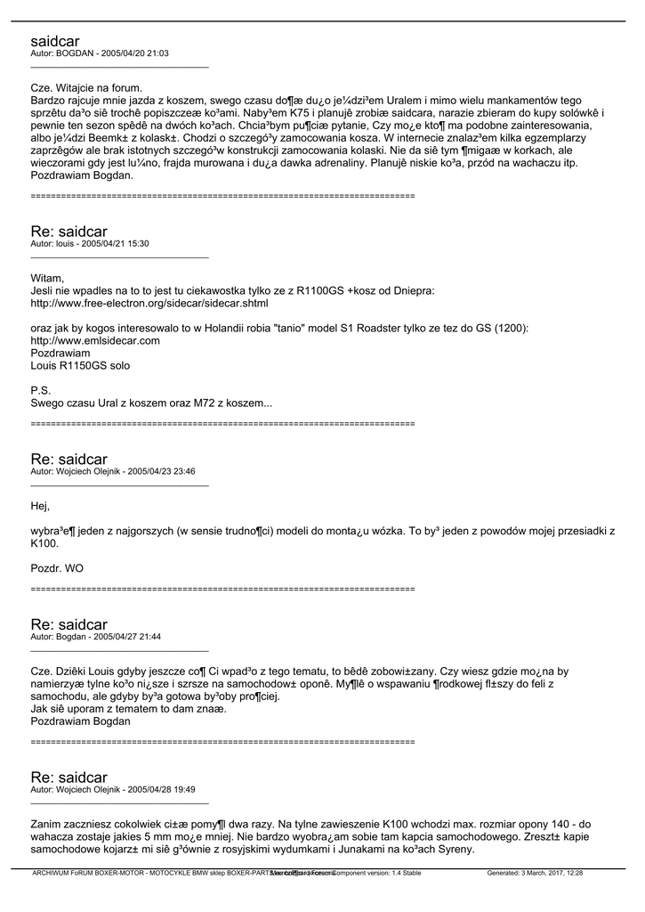 saidcar Autor: BOGDAN - 2005/04/20 21:03 _____________________________________ Cze. Witajcie na forum. Bardzo rajcuje mnie jazda z koszem, swego czasu do¶æ du¿o je¼dzi³em Uralem i mimo wielu mankamentów tego sprzêtu da³o siê trochê popiszczeæ ko³ami. Naby³em K75 i planujê zrobiæ saidcara, narazie zbieram do kupy solówkê i pewnie ten sezon spêdê na dwóch ko³ach. Chcia³bym pu¶ciæ pytanie, Czy mo¿e kto¶ ma podobne zainteresowania, albo je¼dzi Beemk± z kolask±. Chodzi o szczegó³y zamocowania kosza. W internecie znalaz³em kilka egzemplarzy zaprzêgów ale brak istotnych szczegó³w konstrukcji zamocowania kolaski. Nie da siê tym ¶migaæ w korkach, ale wieczorami gdy jest lu¼no, frajda murowana i du¿a dawka adrenaliny. Planujê niskie ko³a, przód na wachaczu itp. Pozdrawiam Bogdan. ============================================================================ Re: saidcar Autor: louis - 2005/04/21 15:30 _____________________________________ Witam, Jesli nie wpadles na to to jest tu ciekawostka tylko ze z R1100GS +kosz od Dniepra: http://www.free-electron.org/sidecar/sidecar.shtml oraz jak by kogos interesowalo to w Holandii robia "tanio" model S1 Roadster tylko ze tez do GS (1200): http://www.emlsidecar.com Pozdrawiam Louis R1150GS solo P.S. Swego czasu Ural z koszem oraz M72 z koszem... ============================================================================ Re: saidcar Autor: Wojciech Olejnik - 2005/04/23 23:46 _____________________________________ Hej, wybra³e¶ jeden z najgorszych (w sensie trudno¶ci) modeli do monta¿u wózka. To by³ jeden z powodów mojej przesiadki z K100. Pozdr. WO ============================================================================ Re: saidcar Autor: Bogdan - 2005/04/27 21:44 _____________________________________ Cze. Dziêki Louis gdyby jeszcze co¶ Ci wpad³o z tego tematu, to bêdê zobowi±zany. Czy wiesz gdzie mo¿na by namierzyæ tylne ko³o ni¿sze i szrsze na samochodow± oponê. My¶lê o wspawaniu ¶rodkowej fl±szy do feli z samochodu, ale gdyby by³a gotowa by³oby pro¶ciej. Jak siê uporam z tematem to dam znaæ. Pozdrawiam Bogdan ============================================================================ Re: saidcar Autor: Wojciech Olejnik - 2005/04/28 19:49 _____________________________________ Zanim zaczniesz cokolwiek ci±æ pomy¶l dwa razy. Na tylne zawieszenie K100 wchodzi max. rozmiar opony 140 - do wahacza zostaje jakies 5 mm mo¿e mniej. Nie bardzo wyobra¿am sobie tam kapcia samochodowego. Zreszt± kapie samochodowe kojarz± mi siê g³ównie z rosyjskimi wydumkami i Junakami na ko³ach Syreny. ARCHIWUM FoRUM BOXER-MOTOR - MOTOCYKLE BMW sklep BOXER-PARTS.eu MamboBoard czê¶ci i akcesoria Forum Component version: 1.4 Stable Generated: 3 March, 2017, 12:28 Mo¿esz spróbowaæ przymierzyæ tylne ko³o z R1200C (15") ale w±tpiê czy siê zmie¶ci (na szeroko¶æ). Zastanów siê, czy nie lepiej sprzedaæ tej ma³ej ceg³y i kupiæ boxera 2V z klasyczn± ram±, gdzie podpiêcie kolaski jest du¿o mniej problematyczne ni¿ w K czy R4V bo jest do czego. WO ============================================================================ Re: saidcar Autor: BOGDAN - 2005/05/03 21:20 _____________________________________ Cze. Witam wszystkich, mam pro¶bê potrzebujê dla prób adaptacji do kó³ do jazdy z koszem przedniej i tylnej piasty z kó³ alu starszego modelu R lub K z kó³ nie nadaj±cych siê do prostowania obrêczy. Je¶li kto¶ posiada takie fanty, to proszê o kontakt. 601-313118 Pozdrawiam Bogdan. ============================================================================ Re: saidcar Autor: Admin - 2005/05/04 20:51 _____________________________________ Przypominam, ¿e oferty kupiê - sprzedam - poszukujê nale¿y sk³adaæ TYLKO I WY£¡CZNIE na GIE£DZIE, nie na forum. link : http://www.boxer-motor.com/gielda/ Admin ============================================================================ ARCHIWUM FoRUM BOXER-MOTOR - MOTOCYKLE BMW sklep BOXER-PARTS.eu MamboBoard czê¶ci i akcesoria Forum Component version: 1.4 Stable Generated: 3 March, 2017, 12:28