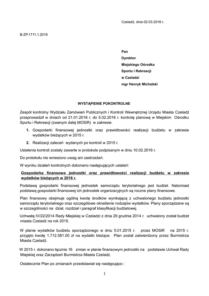 Czeladź, dnia 02.03.2016 r. B-ZP.1711.1.2016 Pan Dyrektor Miejskiego Ośrodka Sportu i Rekreacji w Czeladzi mgr Henryk Michalski WYSTĄPIENIE POKONTROLNE Zespół kontrolny Wydziału Zamówień Publicznych i Kontroli Wewnętrznej Urzędu Miasta Czeladź przeprowadził w dniach od 21.01.2016 r. do 5.02.2016 r. kontrolę planową w Miejskim Ośrodku Sportu i Rekreacji (zwanym dalej MOSiR) w zakresie: 1. Gospodarki finansowej jednostki oraz prawidłowości realizacji budżetu w zakresie wydatków bieżących w 2015 r. 2. Realizacji zaleceń wydanych po kontroli w 2015 r. Ustalenia kontroli zostały zawarte w protokole podpisanym w dniu 10.02.2016 r. Do protokołu nie wniesiono uwag ani zastrzeżeń. W wyniku działań kontrolnych dokonano następujących ustaleń: Gospodarka finansowa jednostki oraz prawidłowości realizacji budżetu w zakresie wydatków bieżących w 2016 r. Podstawą gospodarki finansowej jednostek samorządu terytorialnego jest budżet. Natomiast podstawą gospodarki finansowej ich jednostek organizacyjnych są roczne plany finansowe. Plan finansowy obejmuje ogólną kwotę środków wynikającą z uchwalonego budżetu jednostki samorządu terytorialnego oraz szczegółowe określenie rodzajów wydatków. Plany sporządzane są w szczególności na dział, rozdział i paragraf klasyfikacji budżetowej. Uchwałą IV/22/2014 Rady Miejskiej w Czeladzi z dnia 29 grudnia 2014 r. uchwalony został budżet miasta Czeladź na rok 2015. W planie wydatków budżetu sporządzonego w dniu 5.01.2015 r. przez MOSiR na 2015 r. przyjęto kwotę 1.712.581.00 zł na wydatki bieżące. Plan został zatwierdzony przez Burmistrza Miasta Czeladź. W 2015 r. dokonano łącznie 16 zmian w planie finansowym jednostki na podstawie Uchwał Rady Miejskiej oraz Zarządzeń Burmistrza Miasta Czeladź. Ostatecznie Plan po zmianach przedstawiał się następująco : 1 Dział 926 Kultura fizyczna 2.614.581,00 zł w tym : • wydatki bieżące • wydatki majątkowe 1.714.581,00 zł 900.000,00 zł W okresie 12 miesięcy roku budżetowego MOSiR zrealizował wydatki na kwotę 2.525.518,77 zł, co stanowi 96,59 % wykonania planu rocznego. W strukturze wydatków jednostki w 2015 r. wydatki bieżące stanowiły 67,1 % (1.694.024,52 zł), zaś wydatki majątkowe to 32,9 % (831.494,25 zł). Największą część wydatków bieżących, tj. 51,7 %, przeznaczono na wynagrodzenia wraz z pochodnymi. Pozostałą część stanowiły m.in. zakup energii - 13,1 %, podatek od nieruchomości – 18,2 %, zakup usług pozostałych – 6,4 %, zakup materiałów i wyposażenia – 3,7 %, zakup usług remontowych – 2,0 %, odpis na ZFŚŚ – 1,1 %. I. Wydatki bieżące Kontroli poddano: 1. Zakup paliwa - ZP/63/D/MOSiR/15 Na zakup benzyny, olejów, części do maszyn ogrodniczych zaplanowano kwotę 4.400,00 zł. Wykonanie wyniosło 4.036,47 zł, w tym paliwo 2.747,11 zł. W posiadaniu jednostki znajduje się 9 urządzeń dla których dokonuje się zakupu paliwa tj. . kosiarka samojezdna ESTATE President, kosiarka samojezdna/traktor Pastel Garde, kompaktowy ciągnik komunalny, odśnieżarka spalinowa, wertykulator, wykaszarka spalinowa, odkurzacz Stihl, nożyce spalinowe do żywopłotu. Paliwo do tych urządzeń kupowane jest na stacji do kanistrów i na terenie jednostki uzupełnia się zbiorniki paliwowe tych urządzeń. Na dostawę paliwa wystosowano do Dyrektora wniosek o potwierdzenie zgodności z art. 4 pkt 8 udzielenia zamówienia oraz zatwierdzenia wyboru wykonawcy – Statoil-Serwis Nr 479 z Czeladzi. Wartość zamówienia netto wynosiła 3.252,00 zł. Dokumentami potwierdzającymi dokonanie zakupu paliwa były faktury, które zawierały ilość i rodzaj zakupionego towaru. Płatności każdorazowo dokonywano gotówką po pobraniu zaliczki z kasy. Ilość zakupionej benzyny E-95 stanowiła 570,30 l na wartość 2.650,11 zł, oleju napędowego ON 20,95 l na wartość 97,00 zł. Zakupu i rozchodu paliwa dokonywał Majster J.M., który w zakresie czynności z dnia 1.09.2011 r. nie posiada obowiązków i odpowiedzialności w tym zakresie. Tankowanie do w/w maszyn i urządzeń dokonywane jest przez Majstra przed rozpoczęciem robót na obiektach MOSiR przez poszczególnych pracowników. Wydane paliwo nie jest potwierdzane 2 przez odbierających. Sposób rozdysponowywania paliwa uniemożliwia stwierdzenie zużycia paliwa przez poszczególne urządzenia. W jednostce prowadzony jest Rejestr pod nazwą „Rozliczenie zużycia paliw płynnych do urządzeń eksploatowanych w MOSIR Czeladź w 2015 r.” zawierający następujące pozycje : rodzaj i ilość zakupionego paliwa, datę dostawy, wartość brutto w zł, nr faktury, miejsce rodzaju pracy, rodzaj urządzenia, ilość motogodzin, datę pracy. W MOSiR nie zostały uregulowane przepisami wewnętrznymi sprawy związane z gospodarką paliwami płynnymi. 2. Zakup telefonów komórkowych W dniu 12.11.2015 r. zawarto z Firmą P4 (Play) Sp.z o. o. z Warszawy umowę na świadczenie usług telekomunikacyjnych dla 2 numerów przeniesionych i 1 numeru dodatkowego. Jednocześnie zawarto umowę na świadczenie usług na 3 aparaty telefoniczne zakupione w systemie sprzedaży ratalnej. Po przeprowadzonych negocjacjach umowy zmieniono, konsolidując raty. W dniu 30.11.2015 r. do jednostki wpłynęły 3 faktury za zakup aparatów telefonicznych na ogólną kwotę 1.771,20 zł (3 x 591,63 zł). W jednostce brak potwierdzenia i przedstawienia oferty poprzedniego operatora lub innych operatorów, że zakupione telefony są atrakcyjne cenowo przy spełnianiu wymogów dostępu do internetu, możliwości korzystania ze stron internetowych czy zamieszczania zdjęć. Zakup nie posiada znamion oszczędnej i racjonalnej gospodarki prowadzonej przez jednostkę budżetową. Aparaty telefoniczne zostały wpisane do księgi inwentarzowej pozostałych środków trwałych pod poz. Dz. VI/B/26 poz.38, 39, 40. Jednocześnie w ewidencji widnieje 5 innych aparatów. Ze względu na brak ewidencji indywidualn