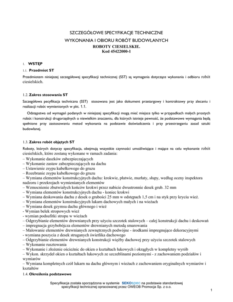 SZCZEGÓŁOWE SPECYFIKACJE TECHNICZNE WYKONANIA I OBIORU ROBÓT BUDOWLANYCH ROBOTY CIESIELSKIE. Kod 45422000-1 1. WSTĘP 1.1. Przedmiot ST Przedmiotem niniejszej szczegółowej specyfikacji technicznej (SST) są wymagania dotyczące wykonania i odbioru robót ciesielskich. 1.2. Zakres stosowania ST Szczegółowa pecyfikacja techniczna (SST) stosowana jest jako dokument przetargowy i kontraktowy przy zlecaniu i realizacji robót wymienionych w pkt. 1.1. Odstępstwa od wymagań podanych w niniejszej specyfikacji mogą mieć miejsce tylko wprzypadkach małych prostych robót i konstrukcji drugorzędnych o niewielkim znaczeniu, dla których istnieje pewność, Ŝe podstawowe wymagania będą spełnione przy zastosowaniu metod wykonania na podstawie doświadczenia i przy przestrzeganiu zasad sztuki budowlanej. 1.3. Zakres robót objętych ST Roboty, których dotyczy specyfikacja, obejmują wszystkie czynności umoŜliwiające i mające na celu wykonanie robót ciesielskich, które zostaną wykonane w ramach zadania: – Wykonanie daszków zabezpieczających – Wykonanie zastaw zabezpieczających na dachu – Ustawienie zsypu kubełkowego do gruzu – Rozebranie zsypu kubełkowego do gruzu – Wymiana elementów konstrukcyjnych dachu: krokwie, płatwie, murłaty, słupy, według oceny inspektora nadzoru i przekrojach wymienianych elementów – Wzmocnienie zbutwiałych końców krokwi przez nabicie dwustronnie desek grub. 32 mm – Wymiana elementów konstrukcyjnych dachu - koniec krokwi – Wymiana deskowania dachu z desek o grubości 25 mm w odstępach 1,5 cm i na styk przy kryciu wież. – Wymiana elementów konstrukcyjnych lukarn dachowych małych i na wieżach – Wymiana desek gzymsu dachu głównego i wież - Wymian belek stropowych wież - wymian podsufitki stropu w wieżach – Odgrzybianie elementów drewnianych przy użyciu szczotek stalowych – całej konstrukcji dachu i deskowań – impregnacja grzybobójcza elementów drewnianych metodą smarowania – Malowanie elementów drewnianych zewnętrznych podwójne - środkami impregnująco dekoracyjnymi - wymiana poszycia z desek struganych świetlika dachowego – Odgrzybianie elementów drewnianych konstrukcji więźby dachowej przy użyciu szczotek stalowych – Wykonanie rusztowania – Wykonanie i złożenie ościeżnic do okien o kształtach łukowych i okrągłych w kompletny wyrób – Wykon. skrzydeł okien o kształtach łukowych ze szczeblinami poziomymi - z zachowaniem podziałów i wymiarów – Wymiana kompletnych czół lukarn na dachu głównym i wieżach z zachowaniem oryginalnych wymiarów i kształtów 1.4. Określenia podstawowe Specyfikacja została sporządzona w systemie SEKOspec SEKOspec na podstawie standardowej specyfikacji technicznej OWEOB opracowanej Promocjaprzez Sp. zOWEOB o.o. 2005Promocja Sp. z o.o. 1 Określenia podane w niniejszej ST są zgodne z obowiązującymi odpowiednimi normami oraz określeniami podanymi w ST Kod CPV 45000000-7 „Wymagania ogólne” pkt 1.4. 1.5. Ogólne wymagania dotyczące robót Wykonawca robót jest odpowiedzialny za jakość ich wykonania oraz za zgodność z dokumentacją projektową, ST i poleceniami Inspektora nadzoru. Ogólne wymagania dotyczące robót podano w ST Kod CPV 45000000-7 „Wymagania ogólne” pkt 1.5. 2. MATERIAŁY 2.1. Ogólne wymagania dotyczące materiałów, ich pozyskiwania i składowania podano w ST Kod CPV 45000000-7 „Wymagania ogólne” pkt 2 2.2. Rodzaje materiałów 2.2.1.Wszelkie materiały do wykonania pokryć dachowych powinny odpowiadać wymaganiom zawartym w normach polskich lub aprobatach technicznych ITB dopuszczających dany materiał do powszechnego stosowania w budownictwie. 2.2. Drewno Do konstrukcji drewnianych stosuje się drewno iglaste zabezpieczone przed szkodnikami biologicznymi i ogniem. Dla robót ciesielskich wymienionych w pkt.1.3 ST B.02.00. należy zastosować drewno klasy K27 spełniające wymogi określone w następujących normach państwowych: PN-82/D-94021 – Tarcica iglasta sortowana metodami wytrzymałościowymi. PN-B-03150:2000/Az1:2001 – Konstrukcje drewniane. Obliczenia statyczne i projektowanie. 2.2.1. Wytrzymałości charakterystyczne drewna iglastego w MPa podaje poniższa tabela: Oznaczenie K27 K33 Zginanie 27 33 Rozciąganie 0,75 0,75 wzdłuż włó kien Ściskanie wzdł 20 24 uż włókien Ściskanie w 7 7 poprzek włó kien Ścinanie wzdłu3 3 ż włókien Ścinanie w 1,5 1,5 poprzek włó kien 2.2.2. Wilgotność drewna stosowanego na elementy konstrukcyjne powinna wynosić nie więcej niż: - dla konstrukcji na wolnym powietrzu – 23 % - dla konstrukcji chronionych przed zawilgoceniem – 20 %. 2.2.3. Tolerancje wymiarowe tarcicy – odchyłki wymiarowe desek powinny być nie większe: – w długości: do + 50 mm lub do – 20 mm dla 20 % ilości – w szerokości: do +3 mm lub do – 1mm – w grubości: do +1 mm lub do – 1 mm b) odchyłki wymiarowe bali jak dla desek c) odchyłki wymiarowe łat nie powinny być większe: Specyfikacja została sporządzona w systemie SEKOspec SEKOspec na podstawie standardowej specyfikacji technicznej OWEOB opracowanej Promocjaprzez Sp. zOWEOB o.o. 2005Promocja Sp. z o.o. 2 _ dla łat o grubości do 50 mm: - w grubości: +1 mm i –1 mm dla 20 % ilości - w szerokości: +2 mm i –1 mm dla 20 % ilości _ dla łat o grubości powyżej 50 mm: - w szerokości: +2 mm i –1 mm dla 20% ilości - w grubości: +2 mm i –1 mm dla 20 % ilości d) odchyłki wymiarowe krawędziaków na grubości i szerokości nie powinny być większe niż +3 mm i – 2 mm. e) odchyłki wymiarowe belek na grubości i szerokości nie powinny być większe niż +3 mm i –2 mm. 2.2.4. Dopuszczalne wady tarcicy: Krzywizna podłużna a) płaszczyzn 30 mm – dla grubości do 38 mm 10 mm – dla grubości do 75 mm b) boków 10 mm – dla szerokości do 75 mm 5 mm – dla szerokości > 250 mm Krzywizna podłużna a) płaszczyzn 30 mm – dla grubości do 38 mm 10 mm – dla grubości d