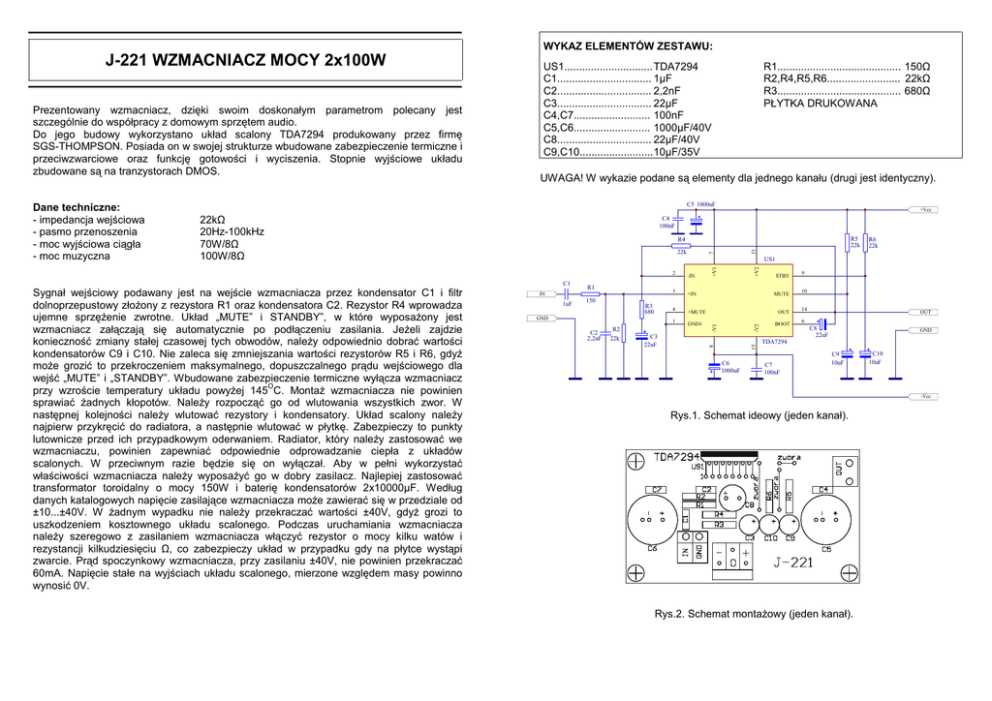 WYKAZ ELEMENTÓW ZESTAWU: J-221 WZMACNIACZ MOCY 2x100W Prezentowany wzmacniacz, dzięki swoim doskonałym parametrom polecany jest szczególnie do współpracy z domowym sprzętem audio. Do jego budowy wykorzystano układ scalony TDA7294 produkowany przez firmę SGS-THOMPSON. Posiada on w swojej strukturze wbudowane zabezpieczenie termiczne i przeciwzwarciowe oraz funkcję gotowości i wyciszenia. Stopnie wyjściowe układu zbudowane są na tranzystorach DMOS. R1.......................................... 150Ω R2,R4,R5,R6......................... 22kΩ R3.......................................... 680Ω PŁYTKA DRUKOWANA UWAGA! W wykazie podane są elementy dla jednego kanału (drugi jest identyczny). C5 1000uF 22kΩ 20Hz-100kHz 70W/8Ω 100W/8Ω R5 22k R6 22k 7 13 R4 22k R1 3 IN +V2 +IN STBY MUTE 9 10 150 4 GND 1 C2 2,2nF R2 22k C3 22uF +MUTE GND1 OUT -V2 R3 680 BOOT 14 OUT 6 C8 22uF GND TDA7294 15 1uF 8 C1 -IN +V1 US1 2 Sygnał wejściowy podawany jest na wejście wzmacniacza przez kondensator C1 i filtr dolnoprzepustowy złoŜony z rezystora R1 oraz kondensatora C2. Rezystor R4 wprowadza ujemne sprzęŜenie zwrotne. Układ „MUTE” i STANDBY”, w które wyposaŜony jest wzmacniacz załączają się automatycznie po podłączeniu zasilania. JeŜeli zajdzie konieczność zmiany stałej czasowej tych obwodów, naleŜy odpowiednio dobrać wartości kondensatorów C9 i C10. Nie zaleca się zmniejszania wartości rezystorów R5 i R6, gdyŜ moŜe grozić to przekroczeniem maksymalnego, dopuszczalnego prądu wejściowego dla wejść „MUTE” i „STANDBY”. Wbudowane zabezpieczenie termiczne wyłącza wzmacniacz O przy wzroście temperatury układu powyŜej 145 C. MontaŜ wzmacniacza nie powinien sprawiać Ŝadnych kłopotów. NaleŜy rozpocząć go od wlutowania wszystkich zwor. W następnej kolejności naleŜy wlutować rezystory i kondensatory. Układ scalony naleŜy najpierw przykręcić do radiatora, a następnie wlutować w płytkę. Zabezpieczy to punkty lutownicze przed ich przypadkowym oderwaniem. Radiator, który naleŜy zastosować we wzmacniaczu, powinien zapewniać odpowiednie odprowadzanie ciepła z układów scalonych. W przeciwnym razie będzie się on wyłączał. Aby w pełni wykorzystać właściwości wzmacniacza naleŜy wyposaŜyć go w dobry zasilacz. Najlepiej zastosować transformator toroidalny o mocy 150W i baterię kondensatorów 2x10000µF. Według danych katalogowych napięcie zasilające wzmacniacza moŜe zawierać się w przedziale od ±10...±40V. W Ŝadnym wypadku nie naleŜy przekraczać wartości ±40V, gdyŜ grozi to uszkodzeniem kosztownego układu scalonego. Podczas uruchamiania wzmacniacza naleŜy szeregowo z zasilaniem wzmacniacza włączyć rezystor o mocy kilku watów i rezystancji kilkudziesięciu Ω, co zabezpieczy układ w przypadku gdy na płytce wystąpi zwarcie. Prąd spoczynkowy wzmacniacza, przy zasilaniu ±40V, nie powinien przekraczać 60mA. Napięcie stałe na wyjściach układu scalonego, mierzone względem masy powinno wynosić 0V. +Vcc C4 100nF -V1 Dane techniczne: - impedancja wejściowa - pasmo przenoszenia - moc wyjściowa ciągła - moc muzyczna US1.............................. TDA7294 C1................................ 1µF C2................................ 2,2nF C3................................ 22µF C4,C7.......................... 100nF C5,C6.......................... 1000µF/40V C8................................ 22µF/40V C9,C10......................... 10µF/35V C6 1000uF C7 100nF C9 10uF C10 10uF -Vcc Rys.1. Schemat ideowy (jeden kanał). Rys.2. Schemat montaŜowy (jeden kanał).
