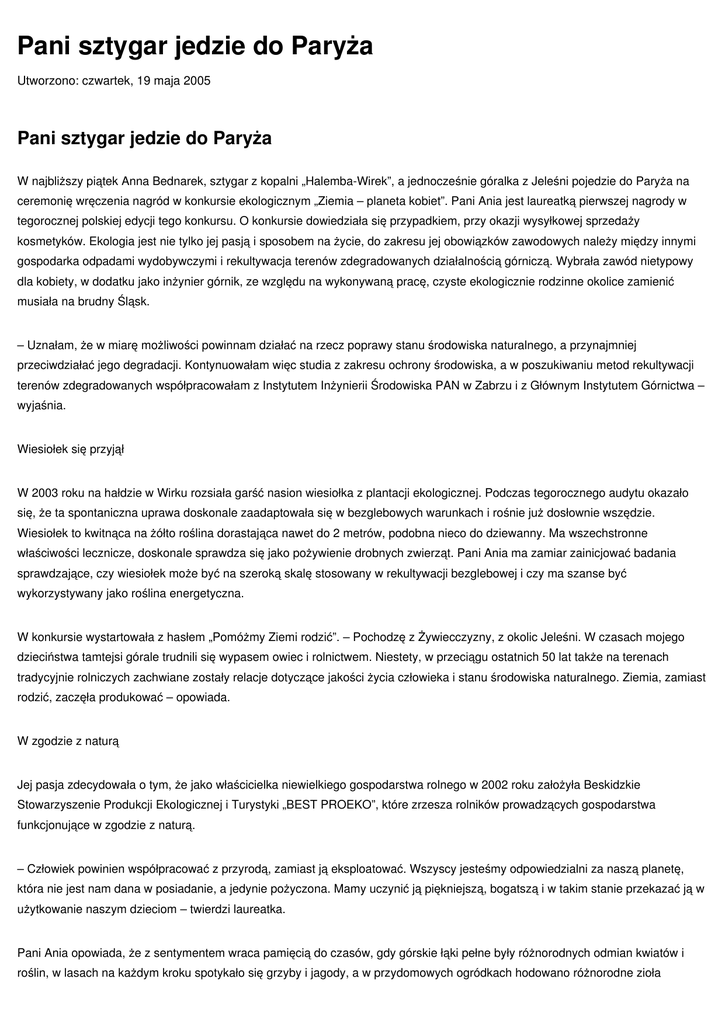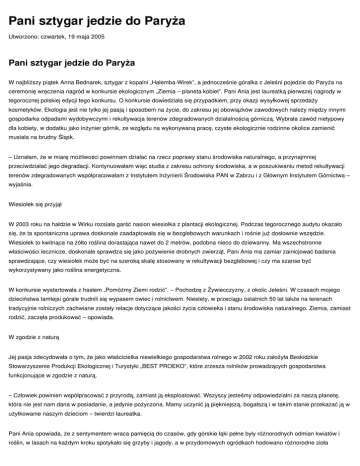 Pani sztygar jedzie do Paryża Utworzono: czwartek, 19 maja 2005 Pani sztygar jedzie do Paryża W najbliższy piątek Anna Bednarek, sztygar z kopalni „Halemba-Wirek”, a jednocześnie góralka z Jeleśni pojedzie do Paryża na ceremonię wręczenia nagród w konkursie ekologicznym „Ziemia – planeta kobiet”. Pani Ania jest laureatką pierwszej nagrody w tegorocznej polskiej edycji tego konkursu. O konkursie dowiedziała się przypadkiem, przy okazji wysyłkowej sprzedaży kosmetyków. Ekologia jest nie tylko jej pasją i sposobem na życie, do zakresu jej obowiązków zawodowych należy między innymi gospodarka odpadami wydobywczymi i rekultywacja terenów zdegradowanych działalnością górniczą. Wybrała zawód nietypowy dla kobiety, w dodatku jako inżynier górnik, ze względu na wykonywaną pracę, czyste ekologicznie rodzinne okolice zamienić musiała na brudny Śląsk. – Uznałam, że w miarę możliwości powinnam działać na rzecz poprawy stanu środowiska naturalnego, a przynajmniej przeciwdziałać jego degradacji. Kontynuowałam więc studia z zakresu ochrony środowiska, a w poszukiwaniu metod rekultywacji terenów zdegradowanych współpracowałam z Instytutem Inżynierii Środowiska PAN w Zabrzu i z Głównym Instytutem Górnictwa – wyjaśnia. Wiesiołek się przyjął W 2003 roku na hałdzie w Wirku rozsiała garść nasion wiesiołka z plantacji ekologicznej. Podczas tegorocznego audytu okazało się, że ta spontaniczna uprawa doskonale zaadaptowała się w bezglebowych warunkach i rośnie już dosłownie wszędzie. Wiesiołek to kwitnąca na żółto roślina dorastająca nawet do 2 metrów, podobna nieco do dziewanny. Ma wszechstronne właściwości lecznicze, doskonale sprawdza się jako pożywienie drobnych zwierząt. Pani Ania ma zamiar zainicjować badania sprawdzające, czy wiesiołek może być na szeroką skalę stosowany w rekultywacji bezglebowej i czy ma szanse być wykorzystywany jako roślina energetyczna. W konkursie wystartowała z hasłem „Pomóżmy Ziemi rodzić”. – Pochodzę z Żywiecczyzny, z okolic Jeleśni. W czasach mojego dzieciństwa tamtejsi górale trudnili się wypasem owiec i rolnictwem. Niestety, w przeciągu ostatnich 50 lat także na terenach tradycyjnie rolniczych zachwiane zostały relacje dotyczące jakości życia człowieka i stanu środowiska naturalnego. Ziemia, zamiast rodzić, zaczęła produkować – opowiada. W zgodzie z naturą Jej pasja zdecydowała o tym, że jako właścicielka niewielkiego gospodarstwa rolnego w 2002 roku założyła Beskidzkie Stowarzyszenie Produkcji Ekologicznej i Turystyki „BEST PROEKO”, które zrzesza rolników prowadzących gospodarstwa funkcjonujące w zgodzie z naturą. – Człowiek powinien współpracować z przyrodą, zamiast ją eksploatować. Wszyscy jesteśmy odpowiedzialni za naszą planetę, która nie jest nam dana w posiadanie, a jedynie pożyczona. Mamy uczynić ją piękniejszą, bogatszą i w takim stanie przekazać ją w użytkowanie naszym dzieciom – twierdzi laureatka. Pani Ania opowiada, że z sentymentem wraca pamięcią do czasów, gdy górskie łąki pełne były różnorodnych odmian kwiatów i roślin, w lasach na każdym kroku spotykało się grzyby i jagody, a w przydomowych ogródkach hodowano różnorodne zioła przydatne ludziom i zwierzętom. Kultywowane na co dzień silne więzi społeczne sprawiały natomiast, że ludzie pomagali sobie w pracach gospodarskich i uprawie roli. Do tych wartości starają się nawiązywać członkowie stowarzyszenia. Nie tylko uprawiają ziemię w zgodzie z naturą i w zgodzie z recepturami swoich ojców produkują regionalną żywność, ale kultywują też folklorystyczne tradycje. Dla swoich sąsiadów i zjeżdżających w Beskidy turystów organizują pikniki i festyny, prowadzą pokazy i szkolenia, współorganizują imprezy regionalne, podpowiadają, w jaki sposób uzyskać środki unijne na prowadzenie ekologicznych gospodarstw rolnych. Najnowsza inicjatywa członków stowarzyszenia to opracowanie, wspólnie ze starostwem powiatowym w Żywcu, ekologicznego programu edukacyjnego dla tutejszego Zespołu Szkół Rolniczych. Z górniczym Szczęść Boże Po odbiór nagrody Anna Bednarek pojechała w górniczym mundurze. Opowiada, że dla organizatorów konkursu było to dość egzotyczne: kobieta-górnik, która w dodatku potraktowała środowisko naturalne jak dom. – Podczas prezentacji mówiłam o rodzinie, cieple i miłości, pozdrowiłam też wszystkich po górniczemu. Niech nie myślą, że przyjeżdżamy do Warszawy tylko upominać się o swoje z kilofami – żartuje. Nagrodę zdecydowała przeznaczyć na budowę przydomowej suszarni owoców i ziół, pozwalającej zużytkować dodatkowo ciepło wykorzystywane do ogrzewania domu. Woda pochodząca z mycia owoców będzie wykorzystana powtórnie – do nawadniania ogródka. Chciałaby także uruchomić stronę internetową stowarzyszenia i ruszyć z organizacją weekendowych jarmarków, na których rolnicy będą mogli sprzedawać ekologiczne plony i regionalne produkty. Myśli też o przydomowym obserwatorium astronomicznym, bo uważa, że patrzenie w niebo uczy człowieka pokory, przyjaznego patrzenia na drugiego człowieka i dodaje skrzydeł. Konkurs „Ziemia – planeta kobiet”, organizowany przez fundację Yves Rocher – Instytut Francuski ma za sobą już siódmą edycję. Oprócz Polski, gdzie zorganizowano go po raz drugi, odbywa się w dziesięciu innych krajach. Jego intencją jest wspieranie kobiet angażujących się w ochronę środowiska. W każdym kraju nagradzane są corocznie trzy panie, a laureatki pierwszych nagród rywalizują o nagrodę międzynarodową w wysokości 10 tys. euro. Anna Zych