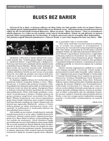 FOTOREPORTA˚ ZDROJU BLUES BEZ BARIER Od trzech lat w dniu, w którym odbywa si´ Bieg Solny nie lada gratka czeka te˝ na fanów bluesa. Na tydzieƒ przed Ogólnopolskim Dniem Bluesa na deskach sceny odrestaurowanej muszli koncertowej odby∏ si´ III Ciechociƒski Festiwal Bluesowy „Blues na jawie - Blues bez barier”. Choç to stosunkowo m∏oda impreza, to z roku na rok zyskuje coraz wi´cej zwolenników. Dzieje si´ tak g∏ównie za sprawà gwiazd, które przyje˝d˝ajà do Ciechocinka. W trakcie pierwszej edycji wystàpi∏a Mira Kubasiƒska, rok póêniej zagrali Martyna Jakubowicz i Zdrowa Woda, w tym roku magnesem by∏y trzy litery - SBB. Spotkanie z bluesem w parku Zdrojowym rozpocz´∏y zespo∏y: Ray, wokalna grupa Hippo oraz grajàcy w „okolicach bluesa” zespó∏ Eldorado z Bydgoszczy. Pierwszà cz´Êç koncertu zamkn´∏a m∏oda utalentowana wokalistka Joanna Pilarska. M∏odzi artyÊci pokazali, ˝e blues wcale nie musi byç muzykà osób „dojrza∏ych” wspominajàcych swojà m∏odoÊç. Spora grupa ciechociƒskiej m∏odzie˝y bawi∏a si´ pod scenà od poczàtku koncertu. Im robi∏o si´ póêniej, tym wi´cej osób pojawia∏o si´ w okolicach muszli, a na scenie pojawi∏y si´ coraz to nowe zespo∏y. Ze Êlàskiego zag∏´bia bluesa do Ciechocinka przyjecha∏ Jan Galach z zespo∏em Siódma w Nocy. Oklaskiwany ju˝ w zesz∏ym roku podczas wyst´pów z Martynà Jakubowicz skrzypek udowodni∏, ˝e instrumentem solowym wcale nie musi byç gitara. Energiczny blues w dobrym wykonaniu bardzo spodoba∏ si´ ciechociƒskiej publicznoÊci. Wiele osób mia∏o problemy z ustaniem i wysiedzeniem w miejscu. Pomimo deszczu na goràce przyj´cie móg∏ liczyç szczeciƒski Free Blues Band. W∏asne kompozycje oraz utwory legendarnej grupy Deep Purple wykonane przez zespó∏, w którego instrumentarium znajdujà si´ organy Hammonda (na których gra Agnieszka Malcherek - jedyna w Polsce kobieta grajàca na takim instrumencie przyp. red.) sprawi∏y, ˝e publicznoÊci w doskona∏ej zabawie nie przeszkadza∏ nawet deszcz. Gdy zrobi∏o si´ ju˝ ciemno, Êwiat∏a laserów zmieni∏y muszl´ koncertowà w scen´, jakà z wielkich koncertów rockowych. Niestety, jeszcze przed udanym koncertem grupy Free Blues Band na fanów ciechociƒskiego bluesa czeka∏a z∏a wiadomoÊç. Obok Zdzis∏awa Pajàka prowadzàcego koncert dziennikarza muzycznego Radia Pik na scenie pojawi∏ si´ S∏awek Ma∏ecki, który poinformowa∏, ˝e koncert Zdrowej Wody nie dojdzie do skutku z powodu choroby perkusisty zespo∏u. Przepraszajàc za zmian´, gitarzysta i lider zespo∏u zaprosi∏ wszystkich na koncert z okazji 20. urodzin zespo∏u, który odb´dzie 19 si´ w przysz∏ym roku w Ciechocinku. Choç wiele osób by∏o rozczarowanych tà informacjà, to zosta∏a ona przyj´ta ze zrozumieniem. Z pewnoÊcià nie rozczarowa∏ wyst´p legendarnej grupy SBB. Fani, którzy przyjechali do Ciechocinka z ró˝nych zakàtków Polski, nie ˝a∏owali pokonanych kilometrów. Józef Skrzek z Apostolisem Antymonem i w´gierskim perkusistà Gaborem Nemethem nie zawiedli, wykonujàc najbardziej znane kompozycje grupy. Wspólnie Êpiewane utwory i mo˝liwoÊç rozmowy oraz spotkania z muzykami b´dàcymi jednymi z najwi´kszych postaci polskiego sprawi∏y, ˝e wieczór ten zapisze si´ w pami´ci wielu osób. Oprócz muzyki organizatorzy zadbali te˝ o mo˝liwoÊç zakupu pamiàtek z Festiwalu. Ch´tni mogli w promocyjnych cenach nabyç koszulki i p∏yty wykonawców. Organizowany przez Urzàd Miejski w Ciechocinku i Centrum Niezale˝nego ˚ycia wsparli te˝ sponsorzy: Paƒstwowy Fundusz Rehabilitacji Osób Niepe∏nosprawnych, Hotel Amazonka, firma Bird, Piekarnia Polkorn, której w∏aÊciciel Jaros∏aw Zieliƒski ufundowa∏ nagrod´ dla Joanny Pilaksiej oraz Przedsi´biorstwo Uzdrowisko Ciechocinek S.A. Patrzàc jak z roku na rok na ciechociƒskim festiwalu pojawiajà si´ coraz to wi´ksze gwiazdy polskiego bluesa, mo˝na si´ spodziewaç, ˝e tak˝e w przysz∏ym roku nie zabraknie wra˝eƒ. Do tej pory udzia∏ w Festiwalu zapowiedzia∏a Zdrowa Woda, o tym, kto wystàpi oprócz najbardziej znanego zespo∏u z Ciechocinka, poinformujemy na naszych ∏amach. Jakub Giza ZDRÓJ CIECHOCI¡SKI wrzesieƒ 2007